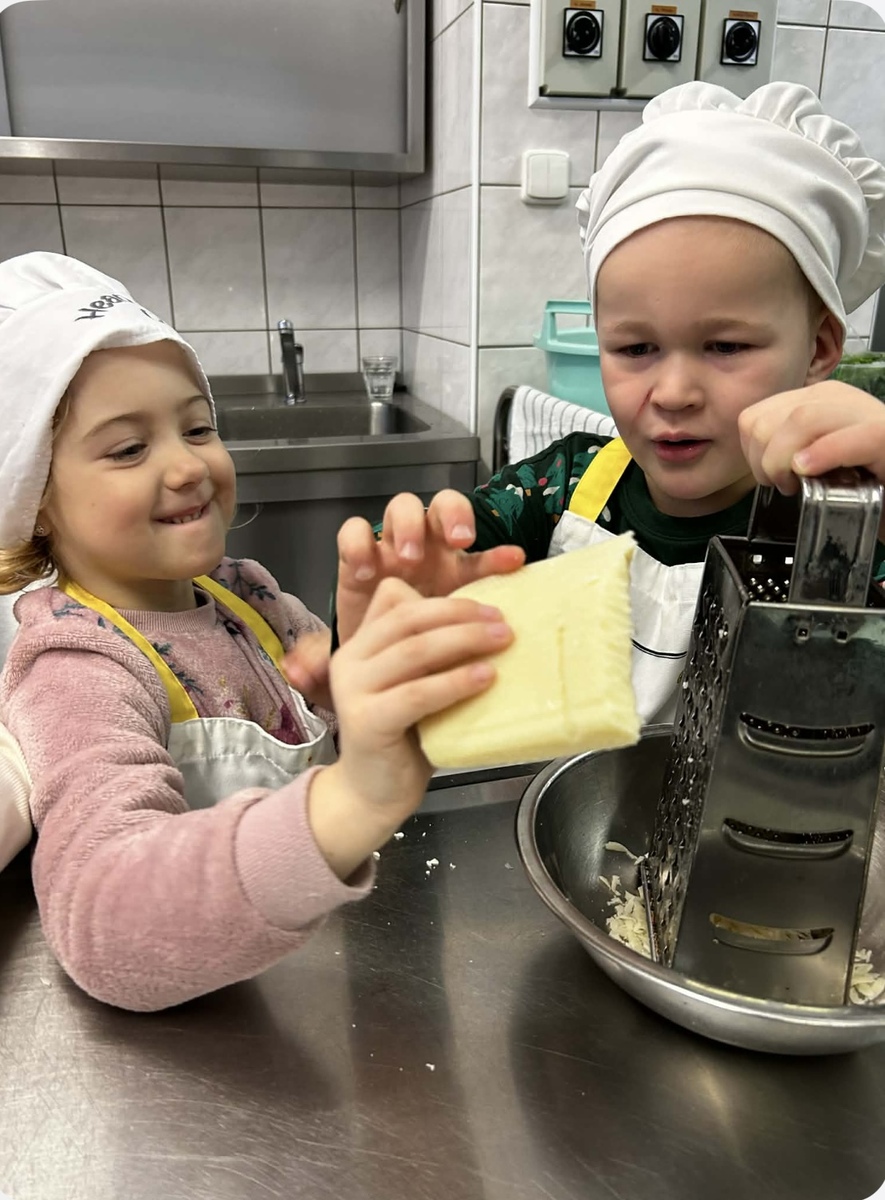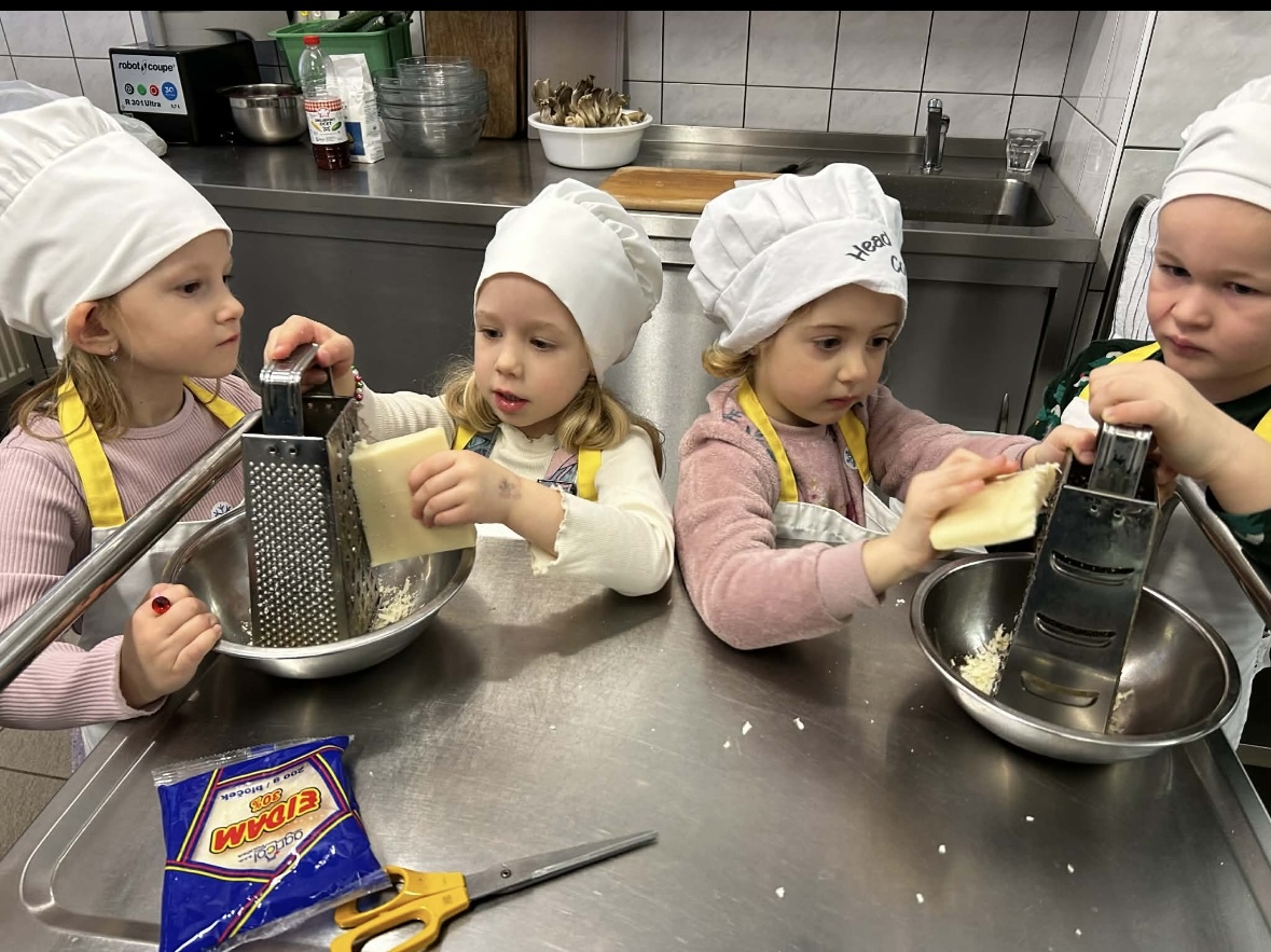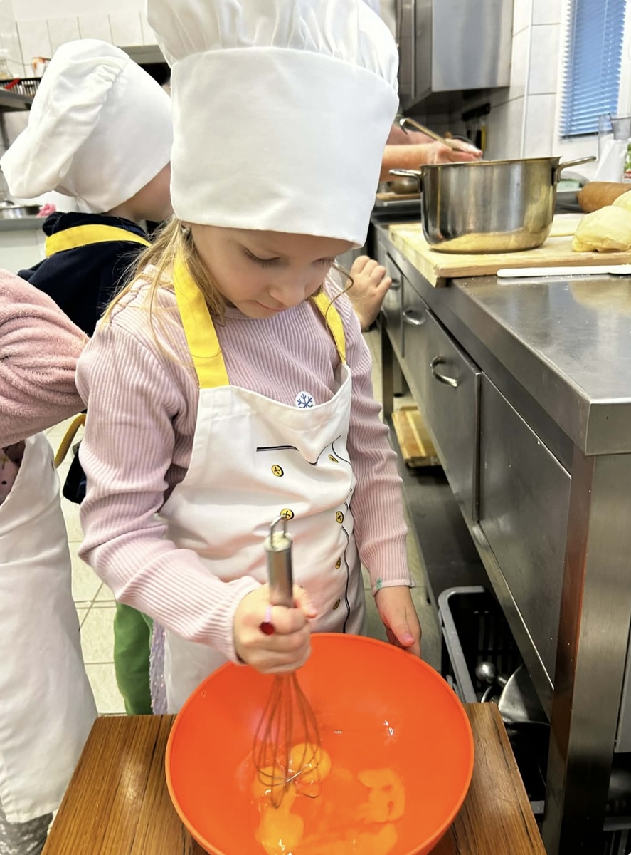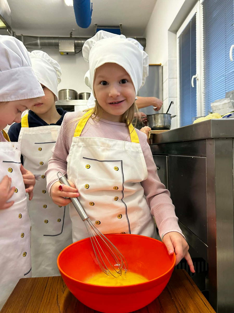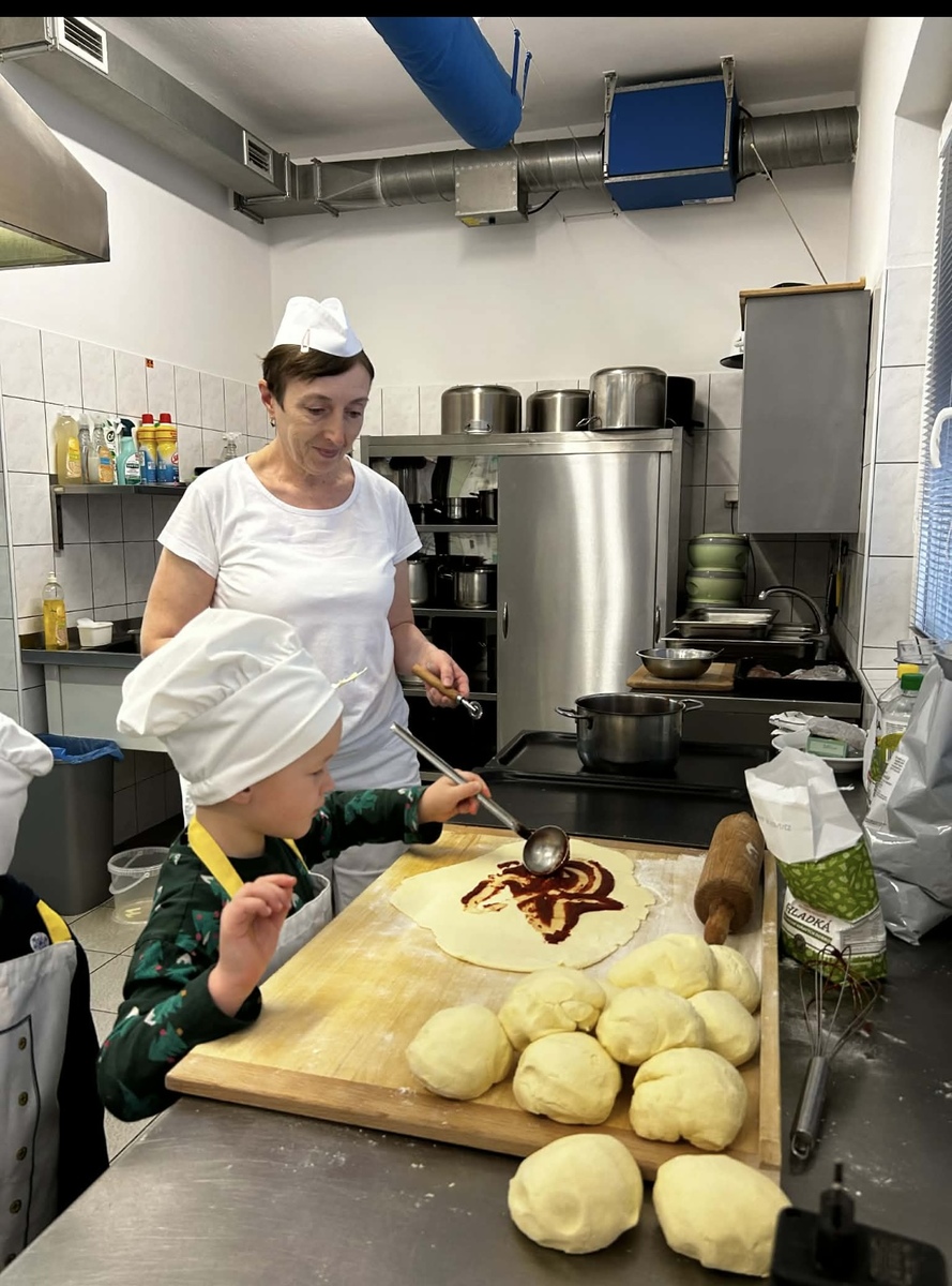 Děti se s velkou radostí zapojily do přípravy slaných šneků. Společně pomáhaly s válením těsta, potíráním náplně a opatrně zkoušely těsto stáčet do tvaru šneků. Při práci si procvičily jemnou motoriku, spolupráci i trpělivost. Celou kuchyní se brzy linula vůně čerstvě upečených dobrot a děti měly velkou radost, že si mohly pochutnat na tom, co samy připravily.