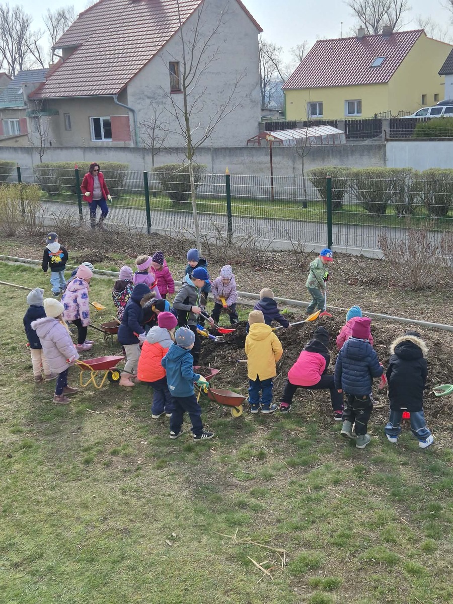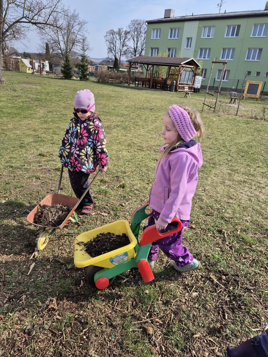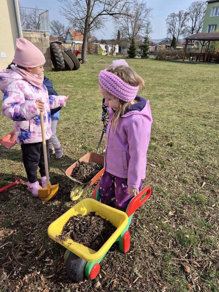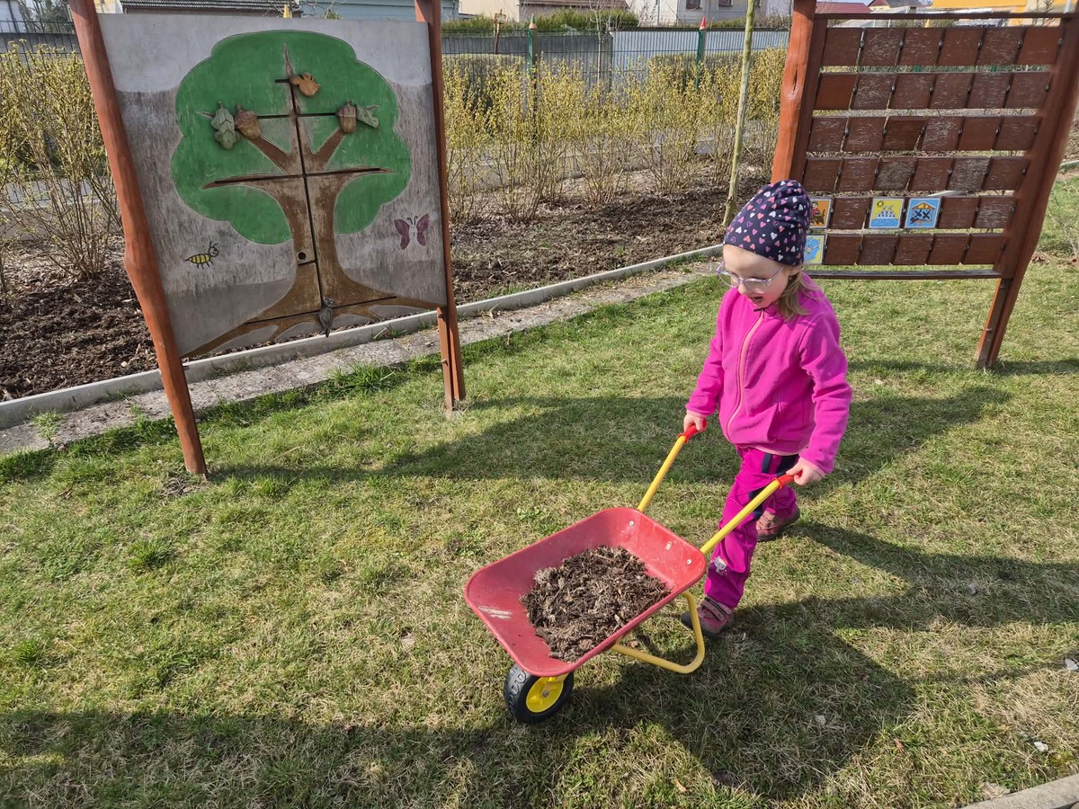 Dnes jsme si užili krásné slunečné počasí na školní zahradě. Děti se s nadšením zapojily do práce , vozily štěpku ke keřům a pomáhaly ji rozhrabávat. Společně jsme tak nejen udělali kus práce, ale také si užili příjemný čas venku.