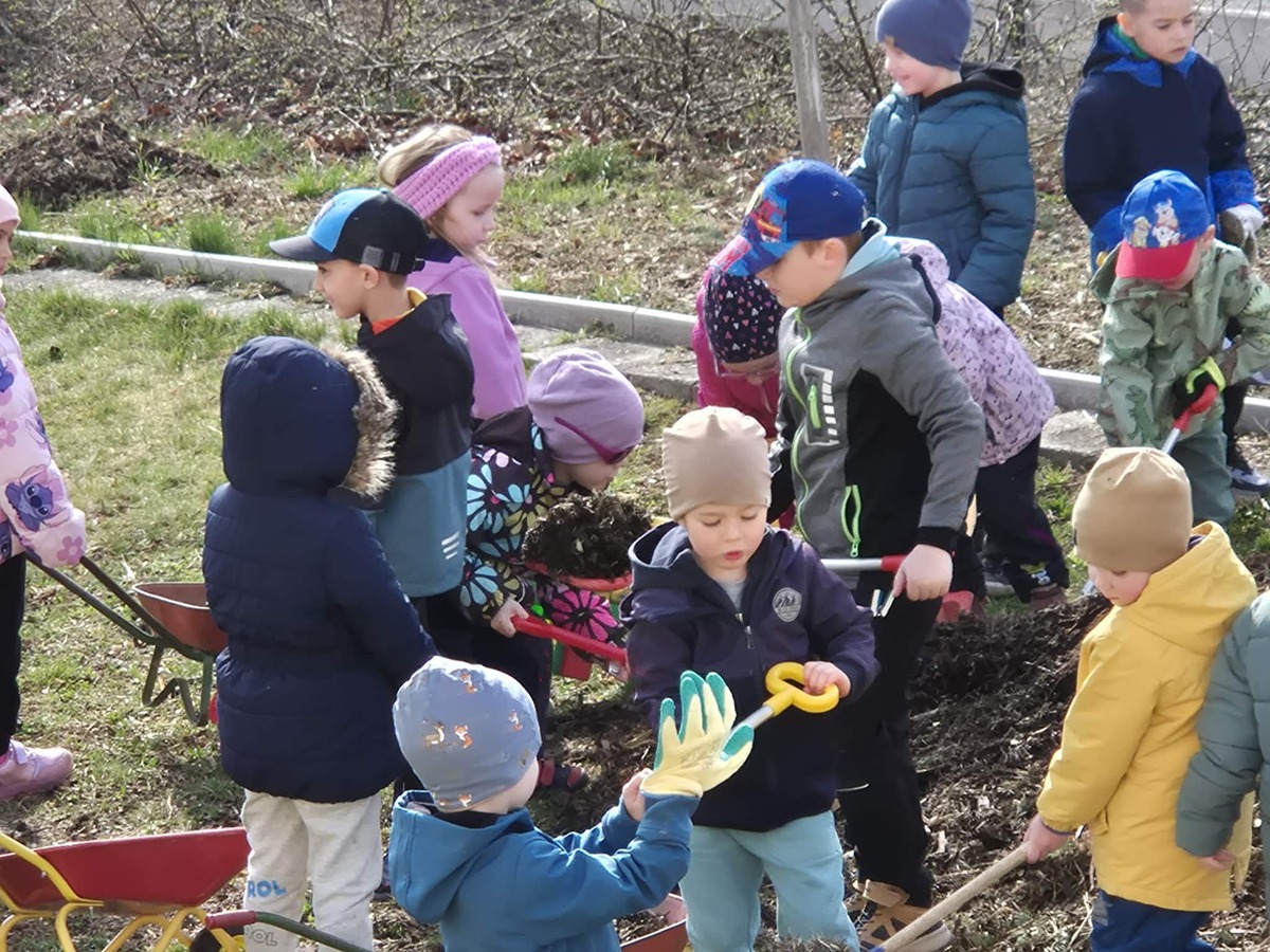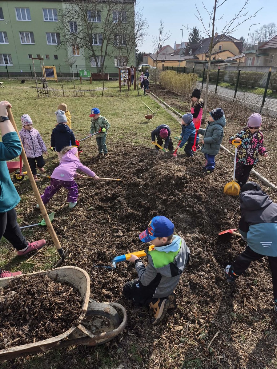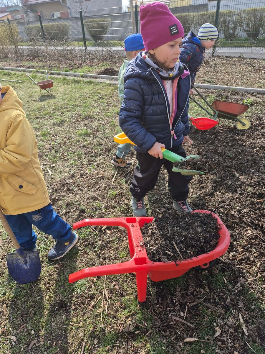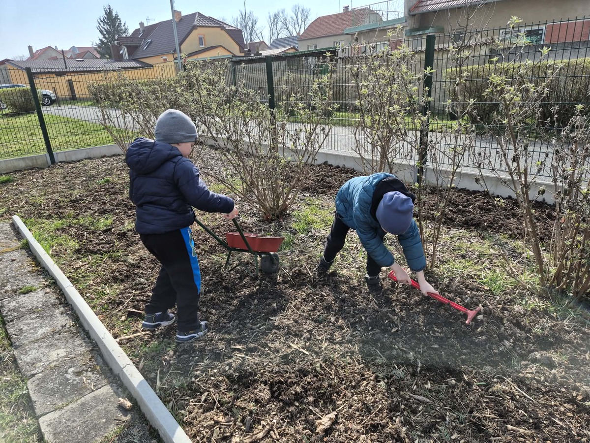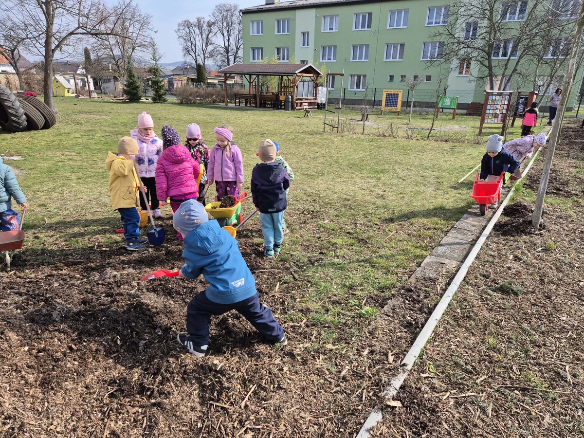 Dnes jsme si užili krásné slunečné počasí na školní zahradě. Děti se s nadšením zapojily do práce , vozily štěpku ke keřům a pomáhaly ji rozhrabávat. Společně jsme tak nejen udělali kus práce, ale také si užili příjemný čas venku.