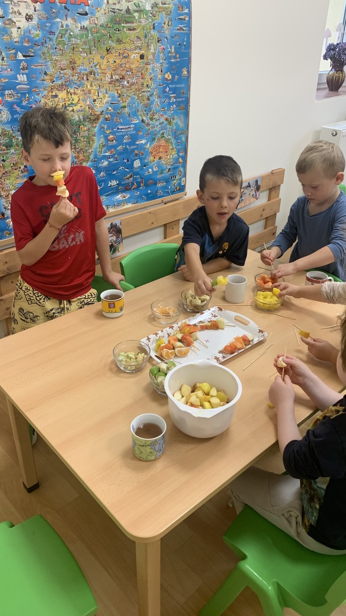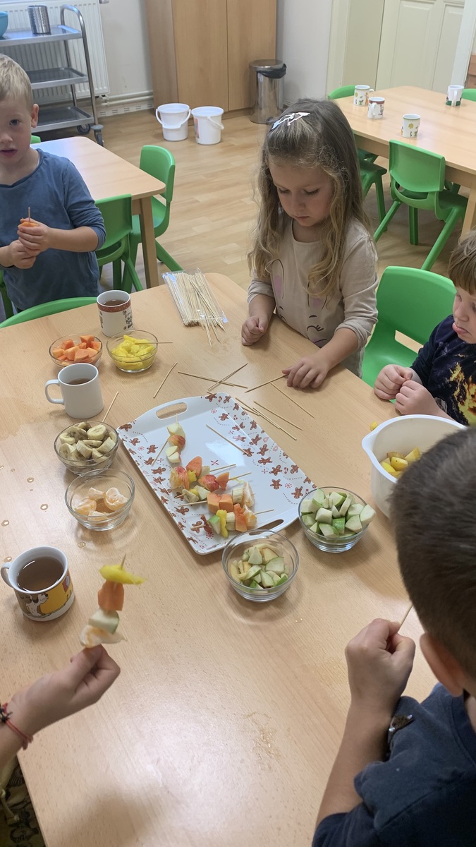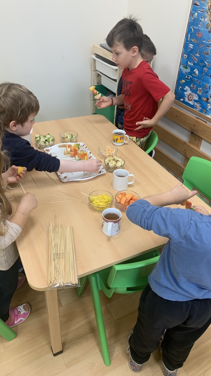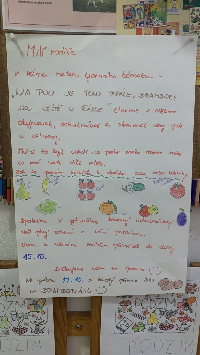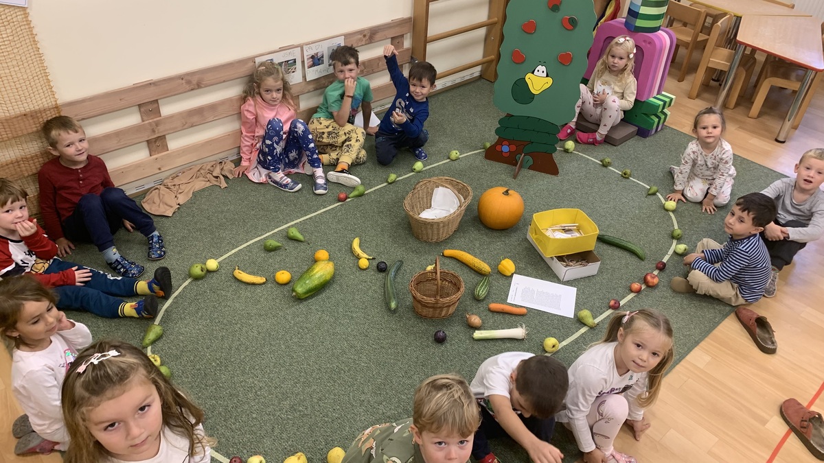 Poprosili jsme rodiče o donesení různých druhů ovoce nebo zeleniny. Takové zapojení a účast, jsme vůbec nečekali:-) Díky rodičům mohly děti ovoce a zeleninu poznávat všemi smysly. Centra aktivit byla plná voňavé zeleniny a ovoce. Děti porovnávaly velikost, váhu, poznávaly podle chuti, hmatu. Z hrušek si vytvořily elipsu, ve které jsme si s dětmi povídali o všem , co je k tomuto tématu zajímalo. Děti se naučily jablka samy krájet na 1/2 i na 1/4. Paní kuchařka nám každý den připravila nějakou specialitu z darů od rodičů:-) Děti pro kamarády v centru domácnost připravily ovocné šízy, po kterých se jen zaprášilo. Nejvíce nám ale chutnali domáci hrušky od Vašíka. Donesl jich plný košík. Jsme s kolegyněmi vděčné, že máme takové rodiče :-)