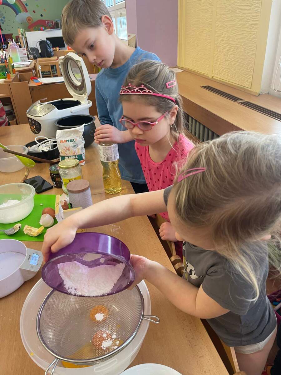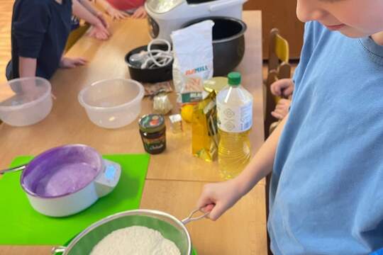 V době masopustní veselice děti měly chuť na koblížky, paní učitelky přání dětem rády splnily, a společně jako jeden kuchařský tým postupovaly krok za krokem ve výrobě koblížků. Daly ochutnat všem a použily vlastní šípkovou marmeládu ještě z podzimní sklizně a výroby.