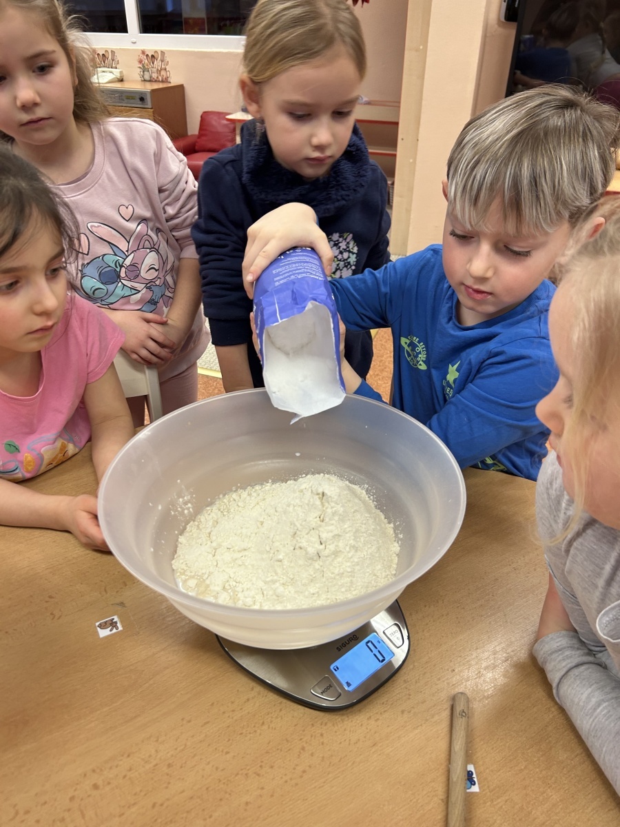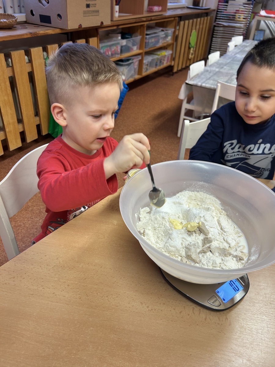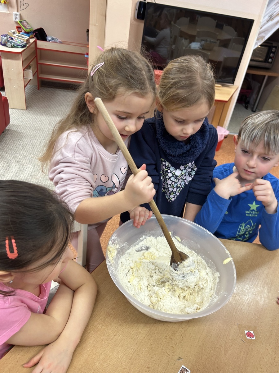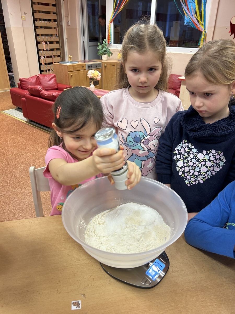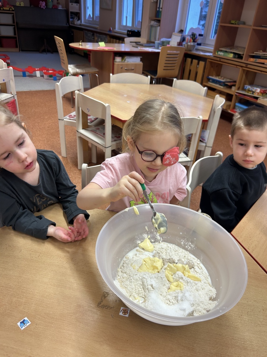 Na třídě Srdíček bylo v období masopustu opravdu veselo a voňavo. Děti si hned brzy ráno zadělaly na těsto na masopustní koláče a s nadšením sledovaly, jak krásně kyne. Po svačince si každý malý pekař naplnil svůj koláč lahodným tvarohem, ozdobil jej sladkými povidly a zasypal drobenkou. Všichni se zaujetím pozorovali, jak se koláče v troubě před očima proměňují dozlatova a jak se školkou line neodolatelná vůně.