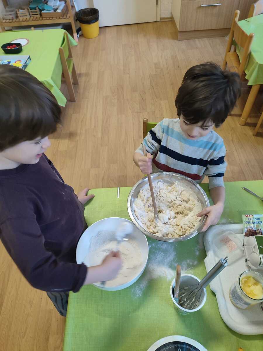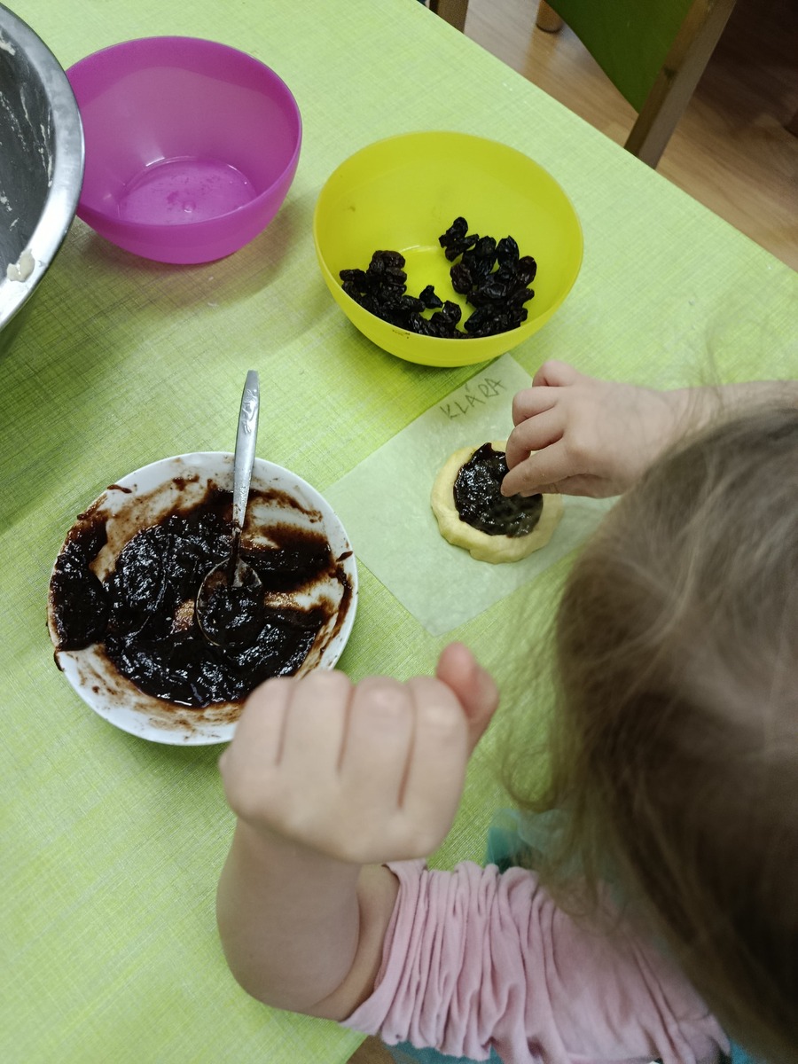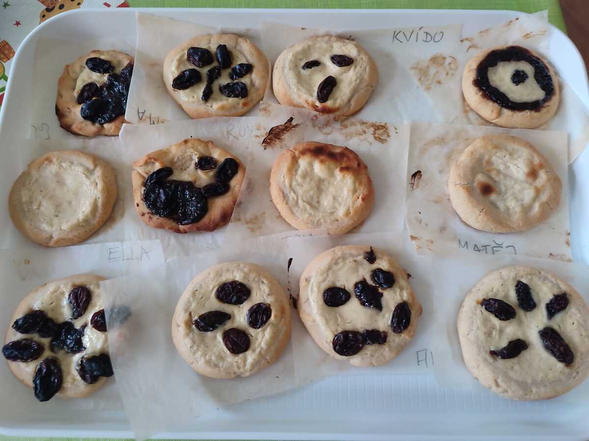 K masopustní veselici patří samozřejmě i hostina. A na té nemůžou chybět koláče! My už víme, že bez práce to nejde, takže jsme od rána pilně připravovali těsto a náplně. Bylo potřeba správně odvážit množství rýžové a celozrnné mouky, smíchat s kypřícím práškem, sodou a solí. Ve druhé míse jsme míchali bílý jogurt s vajíčky, agávovým sirupem a ghee. Ze všech surovin jsme vypracovali husté těsto, z něj si každý vytvaroval své koláčky, které si naplnil a ozdobil dle své chuti. Na tvarohovou náplň jsme smíchali tvaroh se žloutkem, vanilkovým cukrem a nastrouhanou bio citrónovou kůrou. Povidla jsme rozmíchali s trochou vody. Někteří si koláček ozdobili ještě rozinkami. Koláčky se nám povedly náramně, voněly po celé školce a chutnaly nejlíp ze všeho! Však jsme vzali ochutnat i rodičům. A pokud chcete recept, tady jej máte!