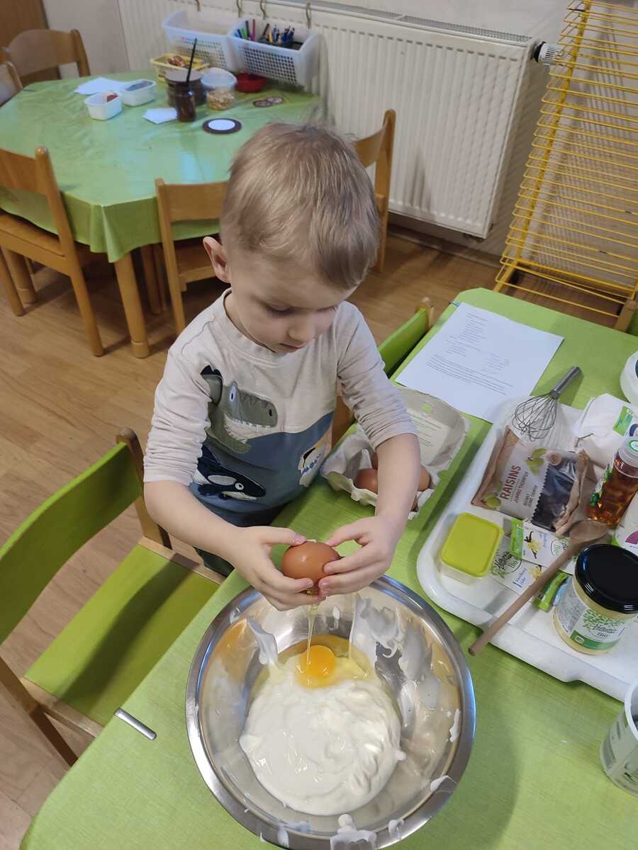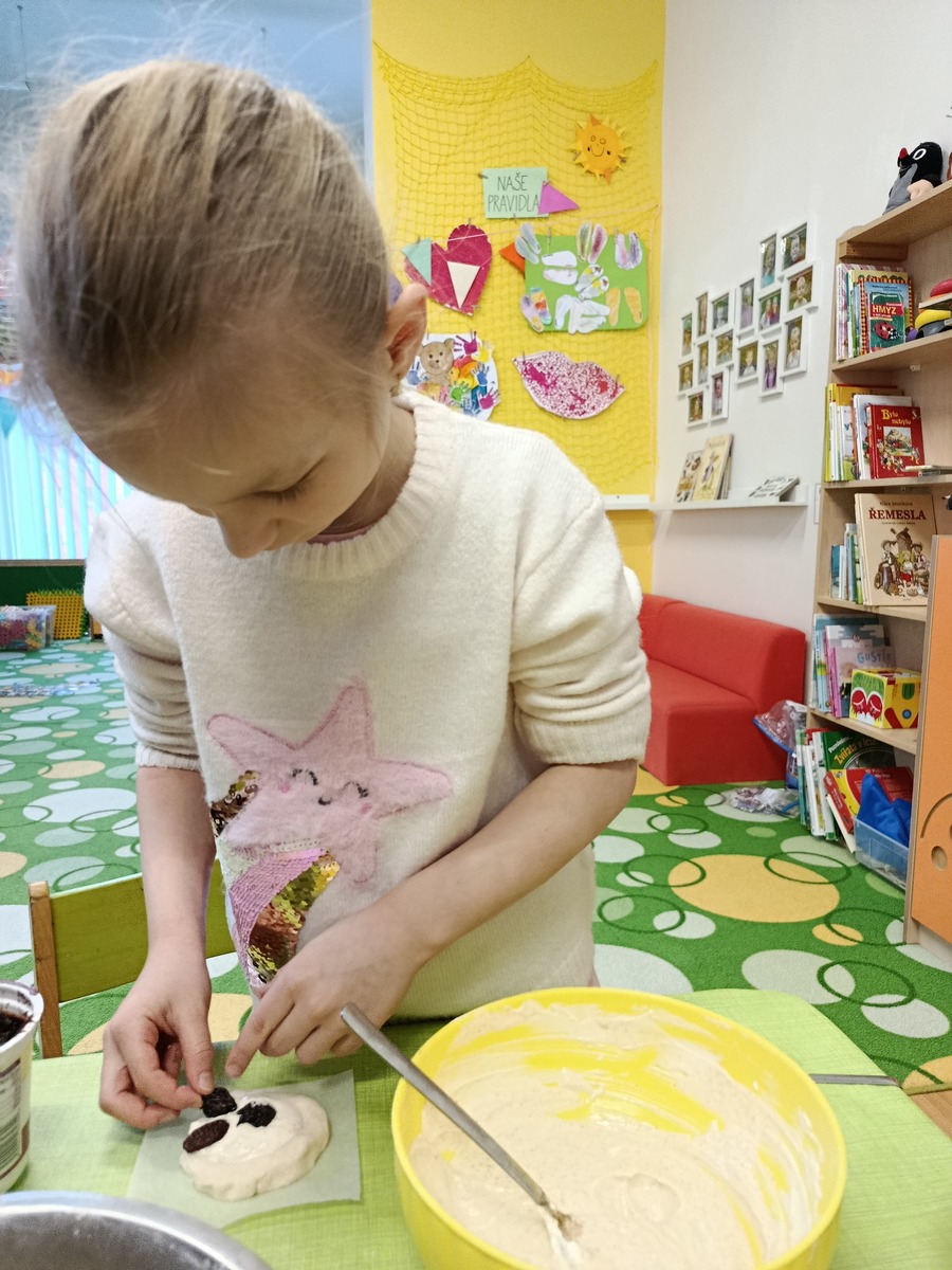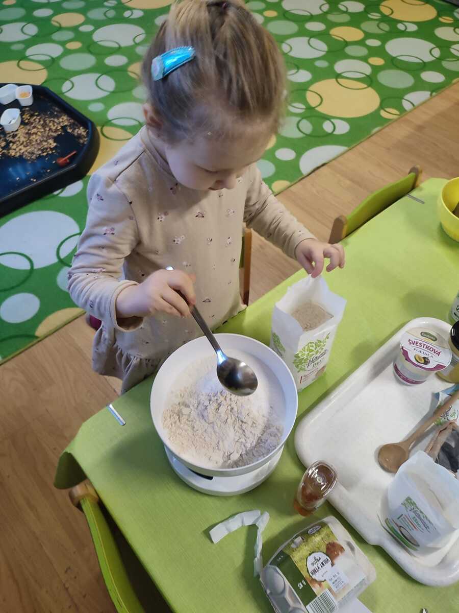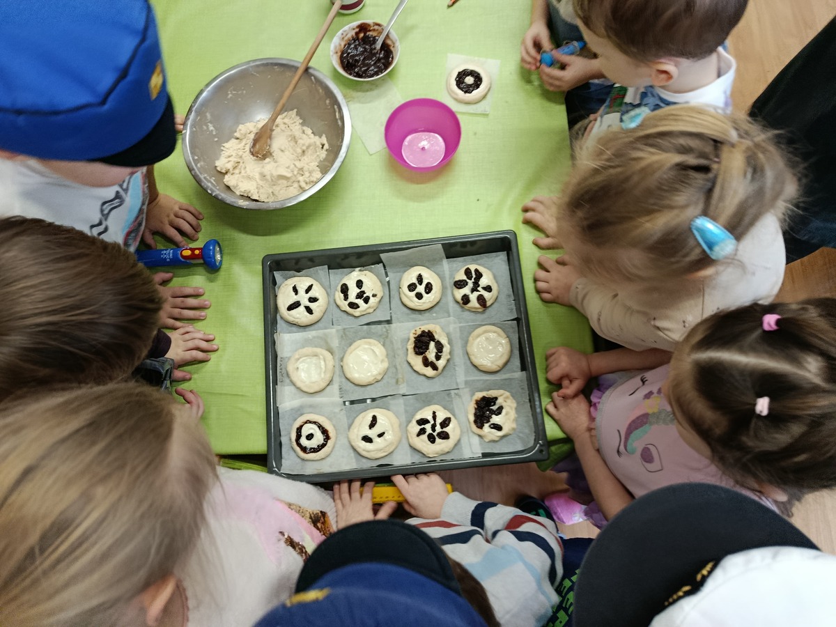 K masopustní veselici patří samozřejmě i hostina. A na té nemůžou chybět koláče! My už víme, že bez práce to nejde, takže jsme od rána pilně připravovali těsto a náplně. Bylo potřeba správně odvážit množství rýžové a celozrnné mouky, smíchat s kypřícím práškem, sodou a solí. Ve druhé míse jsme míchali bílý jogurt s vajíčky, agávovým sirupem a ghee. Ze všech surovin jsme vypracovali husté těsto, z něj si každý vytvaroval své koláčky, které si naplnil a ozdobil dle své chuti. Na tvarohovou náplň jsme smíchali tvaroh se žloutkem, vanilkovým cukrem a nastrouhanou bio citrónovou kůrou. Povidla jsme rozmíchali s trochou vody. Někteří si koláček ozdobili ještě rozinkami. Koláčky se nám povedly náramně, voněly po celé školce a chutnaly nejlíp ze všeho! Však jsme vzali ochutnat i rodičům. A pokud chcete recept, tady jej máte!