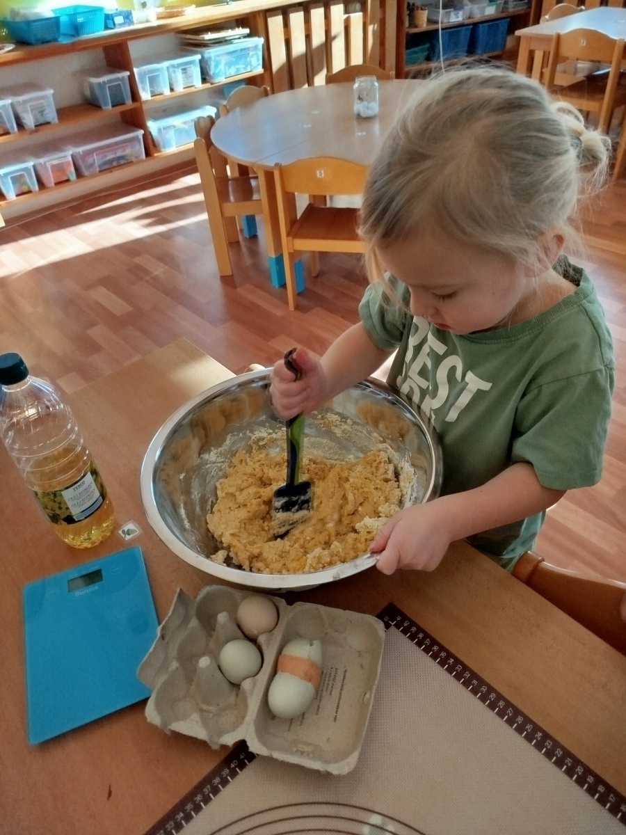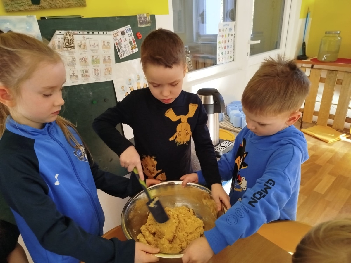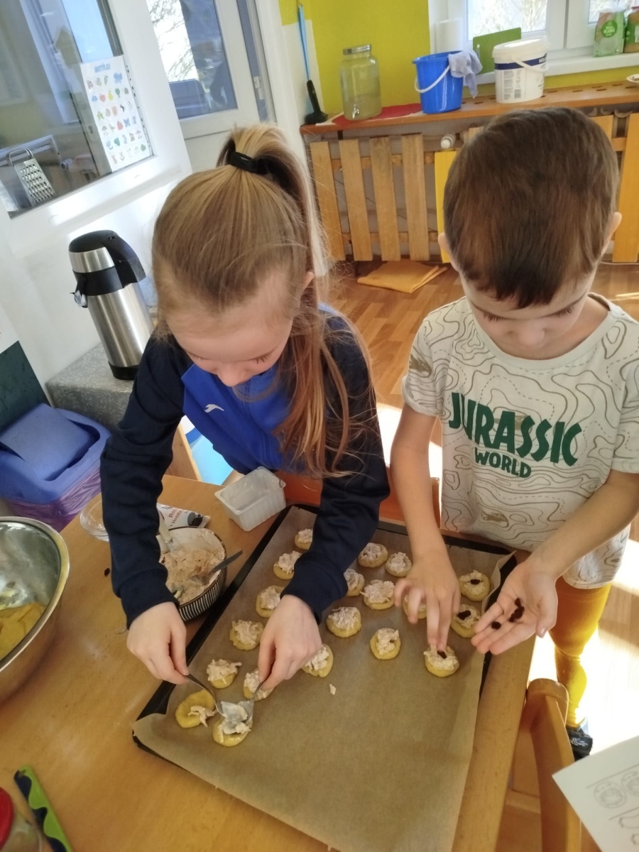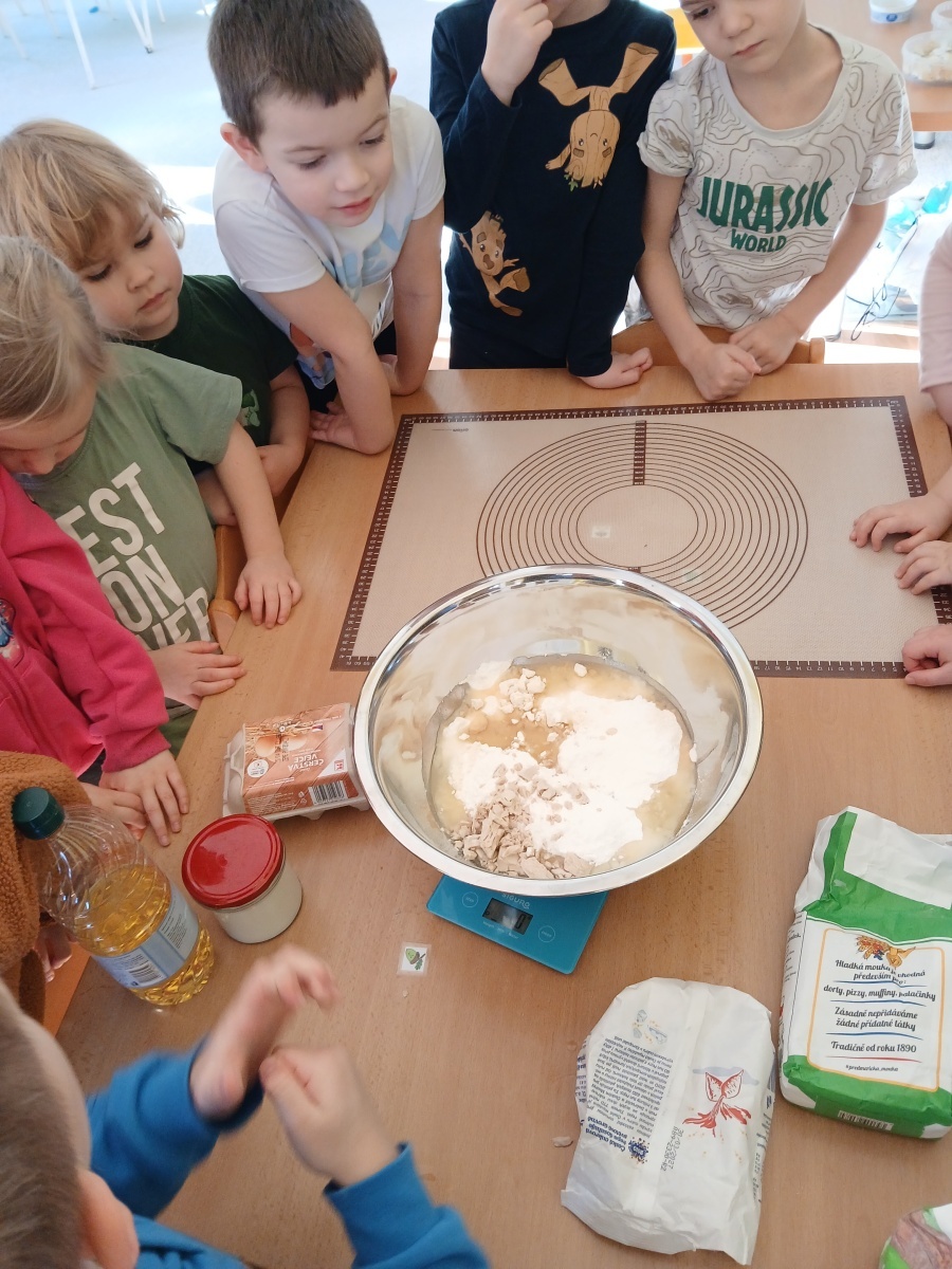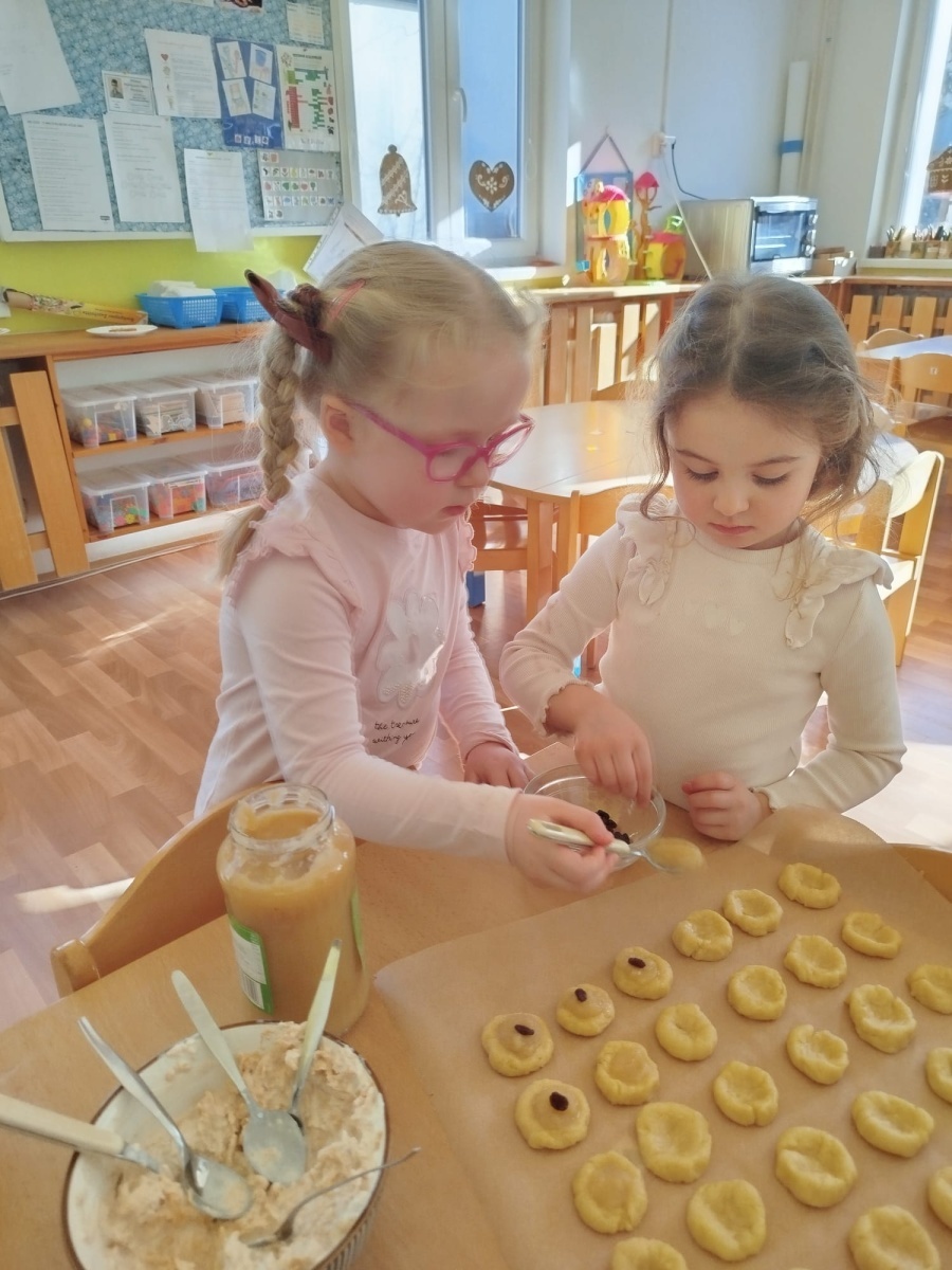 K těmto oslavám se snažíme volit nějaké zdravější mlsání a využívat sezónních surovin. V únoru jsme opět zacílili na tradice a pojali oslavu masopustně. V jeden den jsme si upekli masopustní koláčky. Zadělali jsme (osobně již několikrát prověřené) těsto s droždím i kypřícím práškem (které nemusí kynout), tvořili malé koláčky a plnili je strouhanými jablky smíchanými s tvarohem, jablečným pyré nebo borůvkovým džemem. Koláčků jsme v malé troubě přímo na třídě postupně upekli tři plechy! Krásně jsme provoněli třídu a k oslavě si hned na koláčcích smlsli.