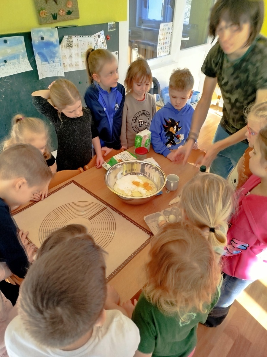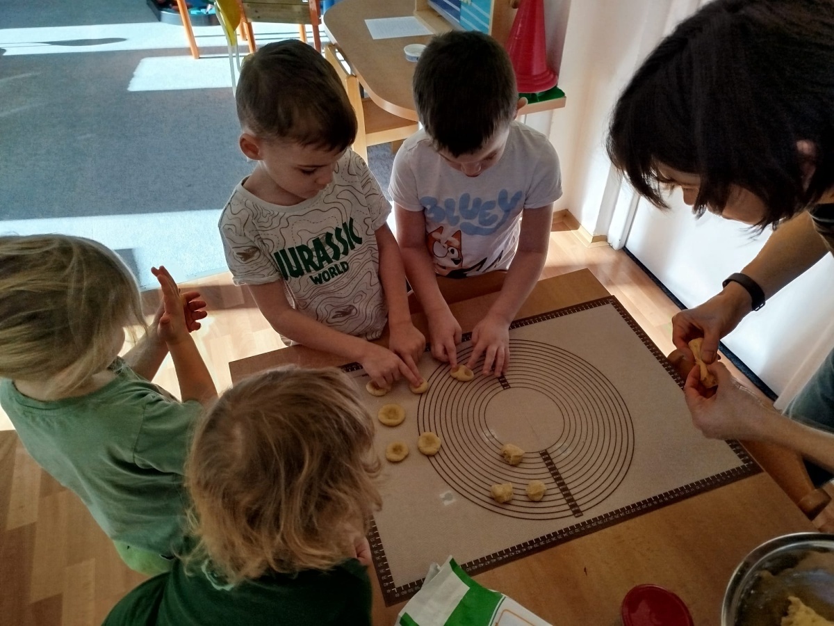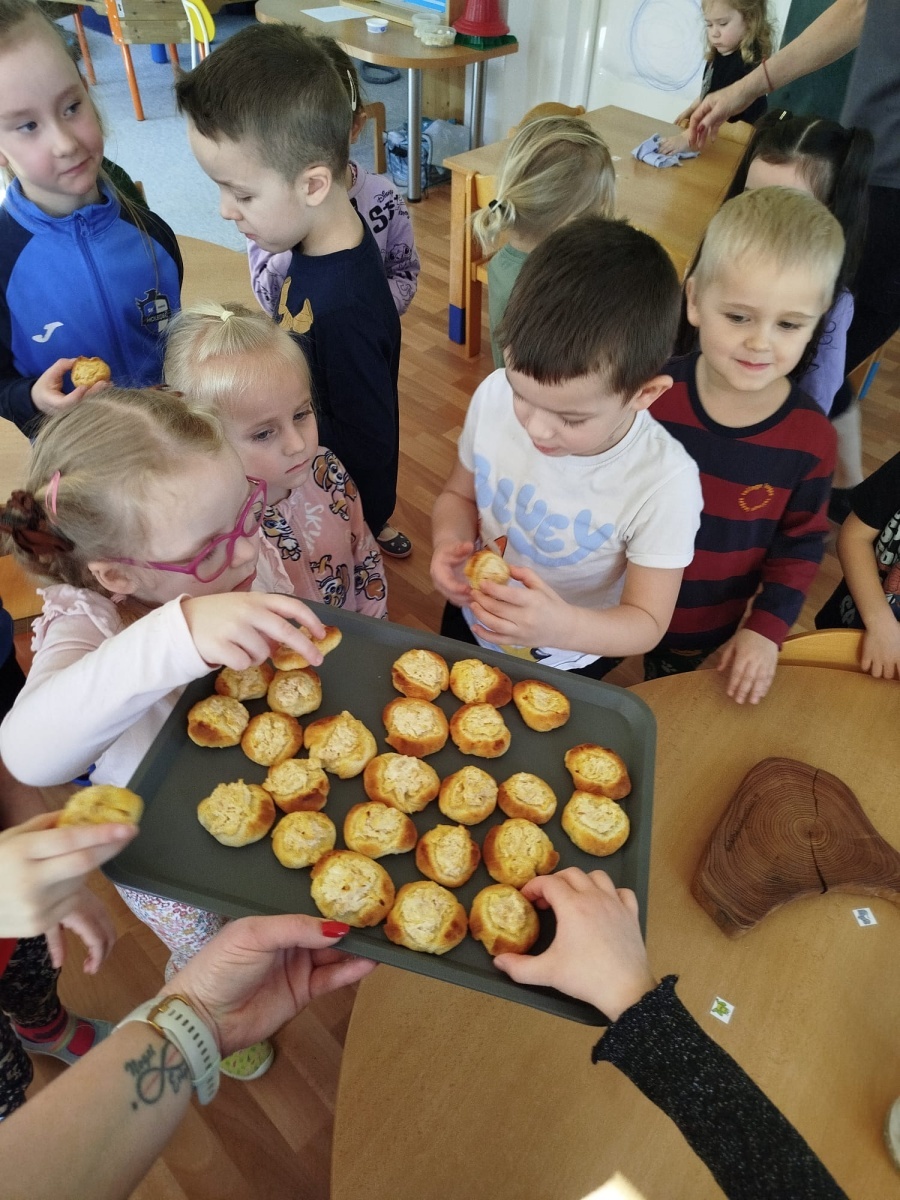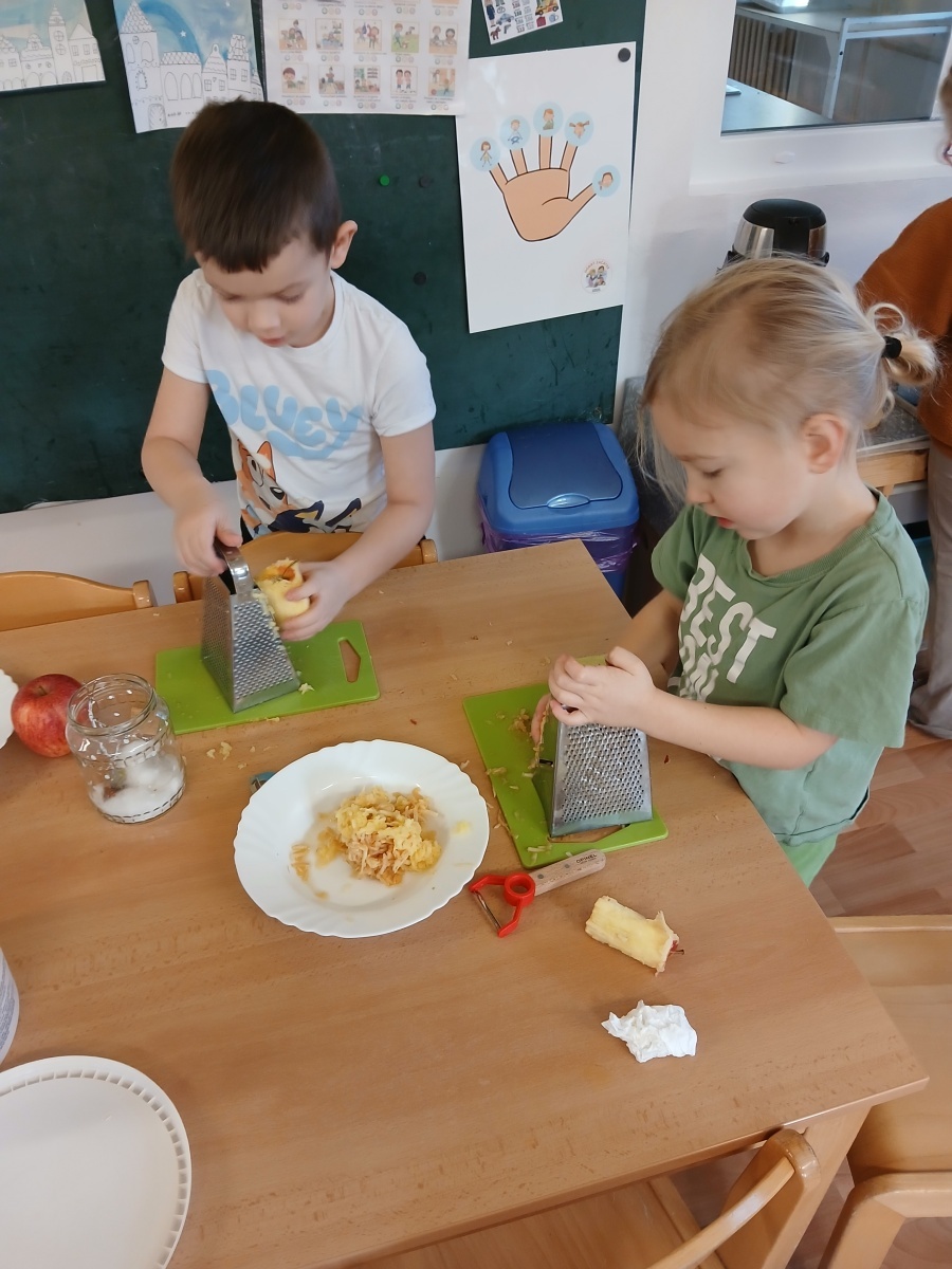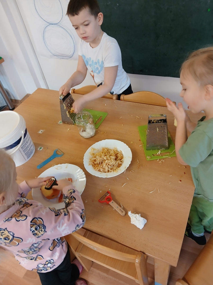 K těmto oslavám se snažíme volit nějaké zdravější mlsání a využívat sezónních surovin. V únoru jsme opět zacílili na tradice a pojali oslavu masopustně. V jeden den jsme si upekli masopustní koláčky. Zadělali jsme (osobně již několikrát prověřené) těsto s droždím i kypřícím práškem (které nemusí kynout), tvořili malé koláčky a plnili je strouhanými jablky smíchanými s tvarohem, jablečným pyré nebo borůvkovým džemem. Koláčků jsme v malé troubě přímo na třídě postupně upekli tři plechy! Krásně jsme provoněli třídu a k oslavě si hned na koláčcích smlsli.