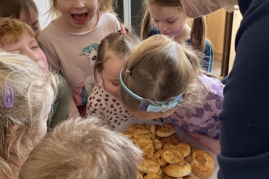 Masopustní veselení je naší každoroční oblíbenou aktivitou. Společně s děvčaty z kuchyně domlouváme, co budeme péct, abychom při masopustním průvodu mohli rozdávat lidem z obce nejen úsměvy, hudbu a radost, ale také něco na zub. Letošní masopustní dobrotou jsme zvolily preclíky z kynutého těsta, které jsme pak dle návodu paní kuchařky s dětmi připravovaly.