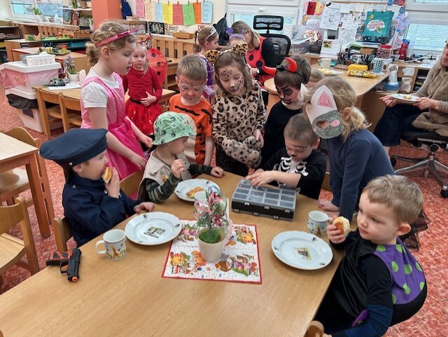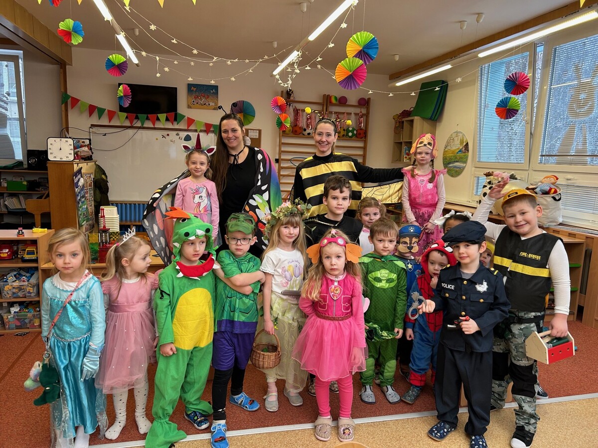 Ráno jsme odstartovali domácími koláčky ke svačině, a pak už se rozjela pravá masopustní zábava. Děti se radostně předváděly ve svých krásných kostýmech, nechyběl ani pobyt venku plný smíchu a dovádění.