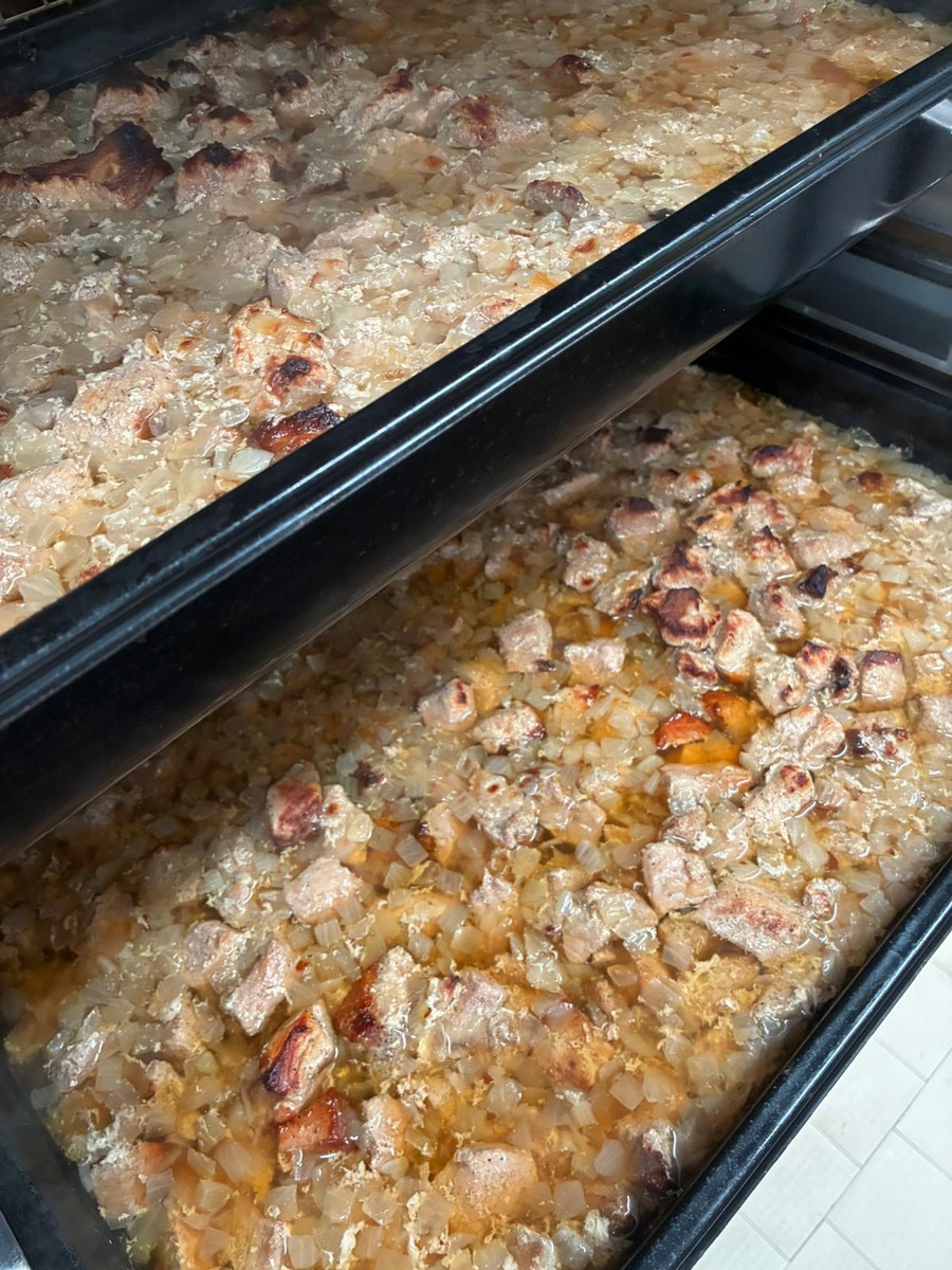 A když jsme se dostatečně vyřádili, čekal nás voňavý oběd – luštěninová polévka a domácí celozrnné knedlíky s pečeným masem a červeným zelím. Prostě masopust jak má být!