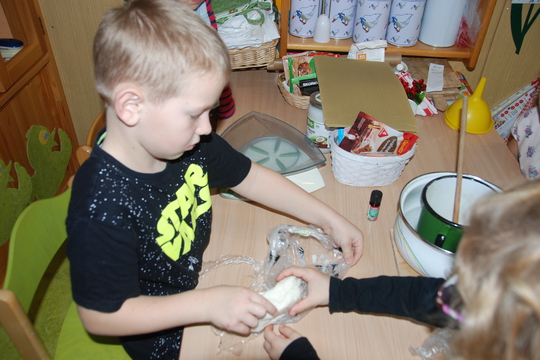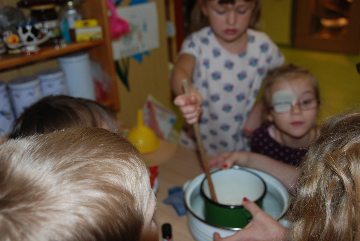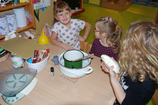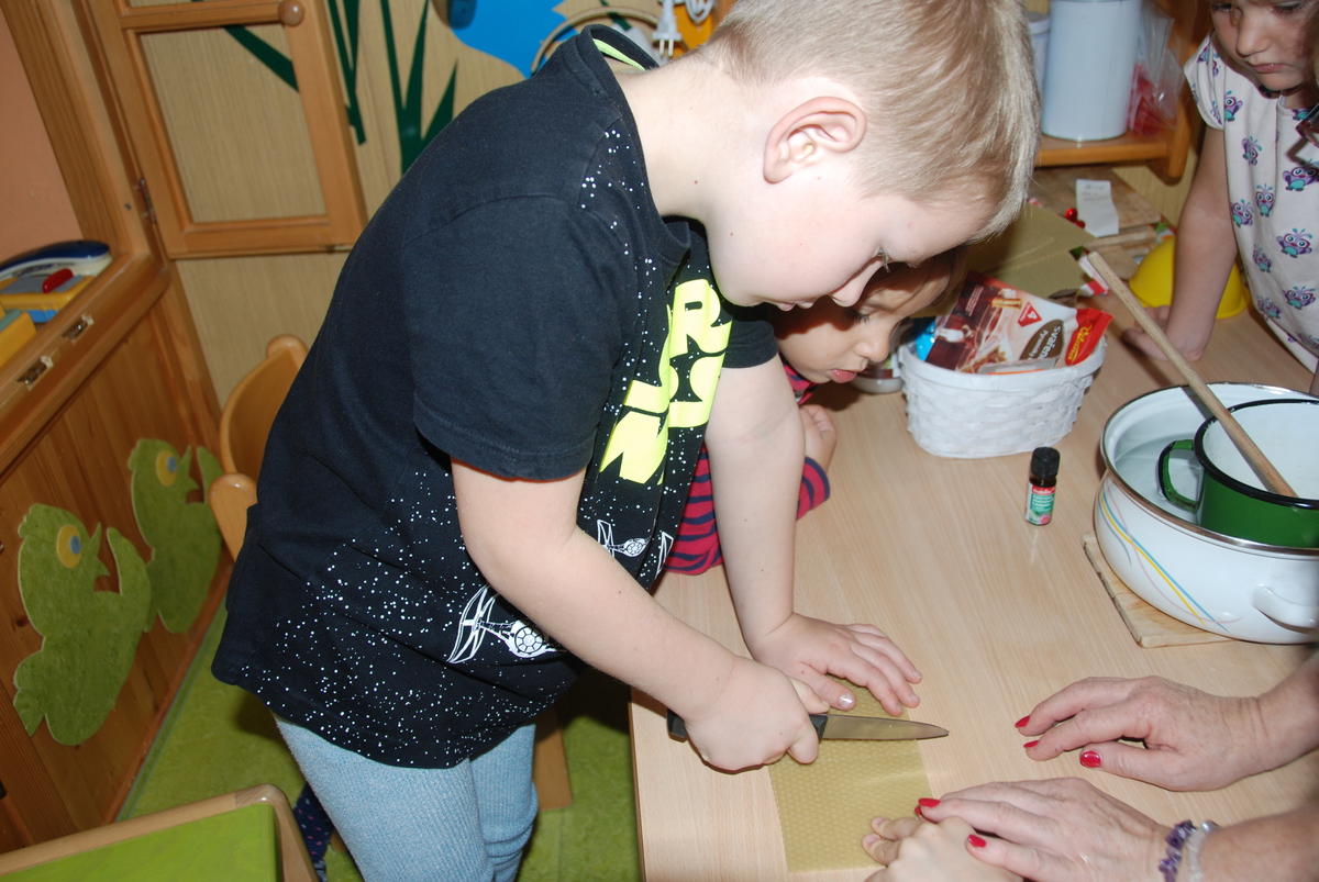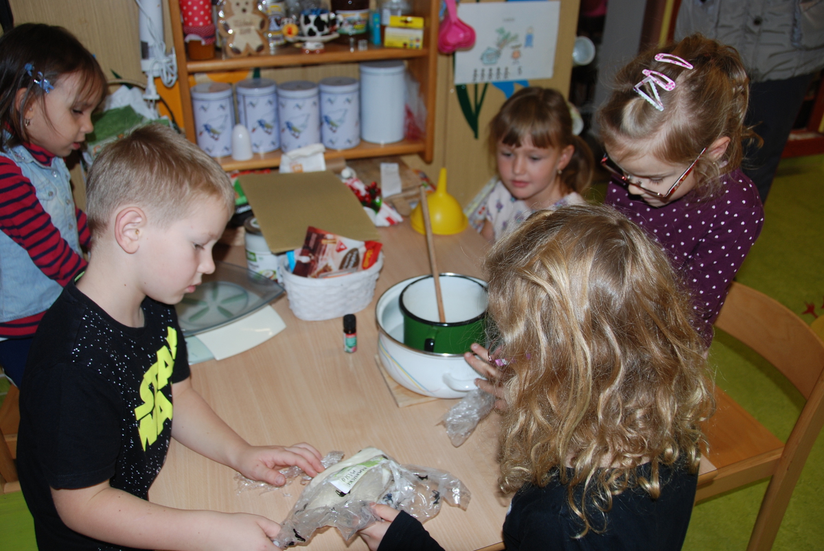 Nejdříve jsme v horké lázni roztopili bambucké máslo, do něj pak děti natrhaly kousíčky medových plátů, nakonec zakáply mentolovou esenci a pak už paní učitelky nalévaly mastičku do nachystaných kelímků. Děti jsme řádně poučili o možných rizicích a ty se se vším vypořádaly dobře. Důležité je dát dětem příležitost zapojit se. Na kelímky jsme pak nalepili samoleku a dali je do organzového pytlíčku. Tak, a dáreček je připravený ke koupi☺.