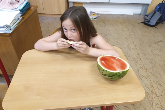 Bedýnky plné melounů jsme obdrželi od projektu Ovoce a zelenina do škol. Před samotným ochutnáváním jsme si jednotlivé druhy melounů potěžkali, porovnali jejich velikost, tvar a hrubost kůry. Následně jsme se naučili znát nové názvy druhů melounů- Galia, vodní, žlutý, piel de sapo. Následovalo rozkrojení a ochutnávka. Nejvíce žákům chutnal klasický červený vodní meloun, dost hlasů získal i žlutý, poslední dva žáky moc neoslovili. Následovalo shlédnutí krátkého videa týkající se melounů - jak je kreativně krájet, jak je lze jíst (a pít). Poslední aktivitou bylo poznávání jednotlivých druhů melounů podle chuti se zavřenýma očima. Tato hra žáky velmi bavila a většinou se i strefovali. Melounů bylo opravdu hodně, a tak je nyní žáci dostávají i na svačinu do odpolední školní družiny, kdy v tomto teplém počasí přijdou velmi vhod.
