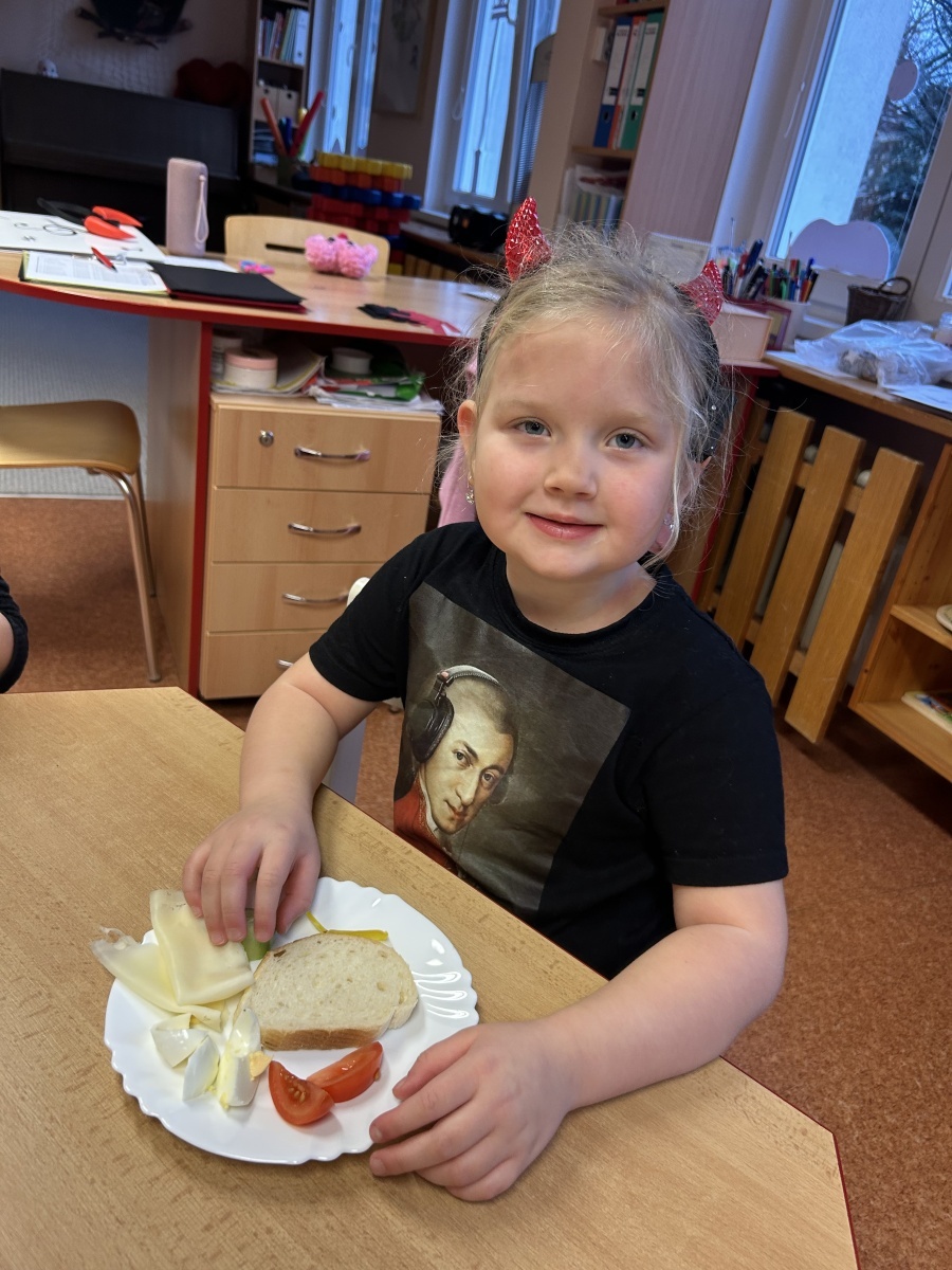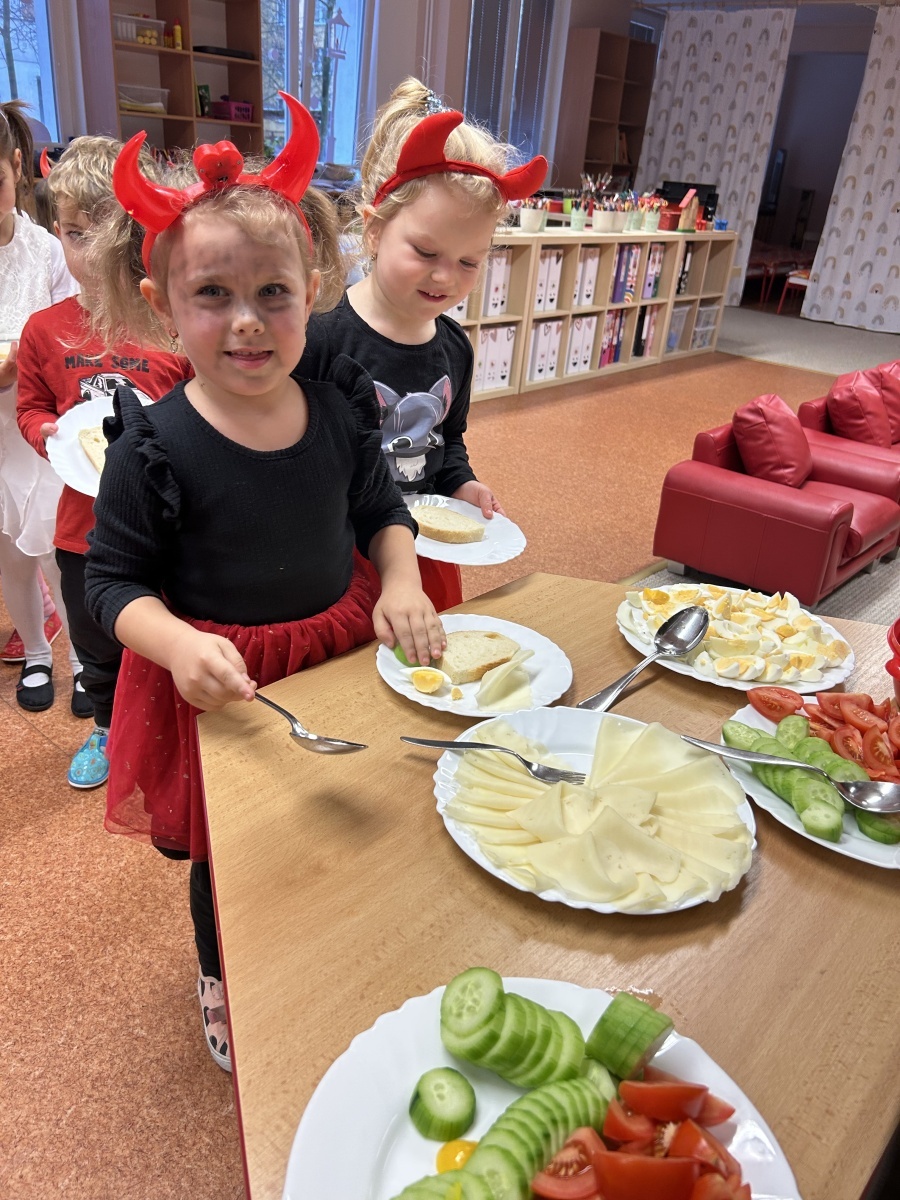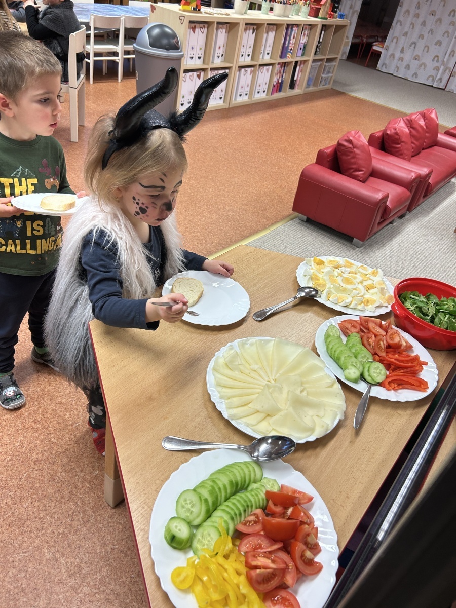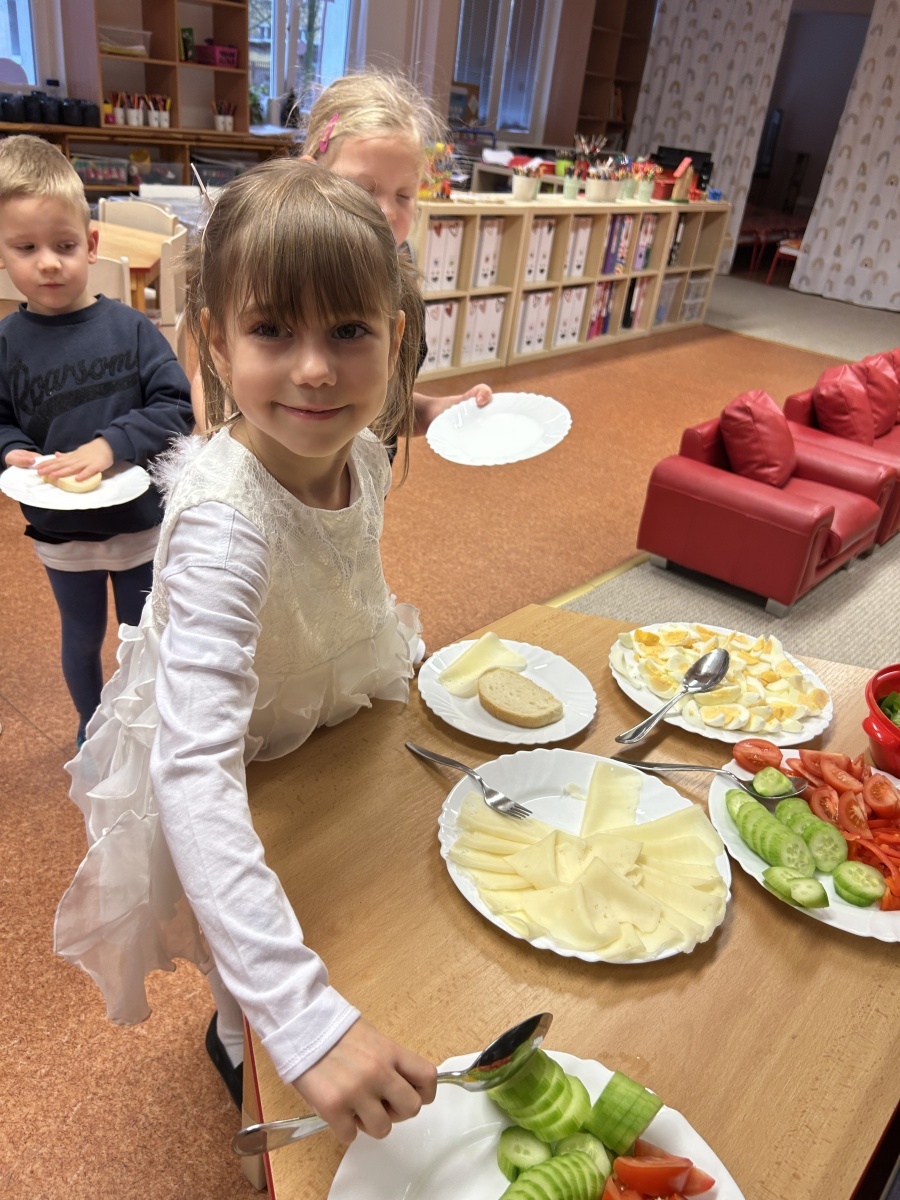 Na třídě Srdíček dnes děti prožily mikulášské dopoledne v duchu zdravého stravování. Před očekávanou mikulášskou návštěvou si samy připravovaly svačinku formou malého rautu, který jim připravily paní kuchařky. Každý si mohl zvolit zeleninu podle vlastní chuti, podle libosti namazat veku a nazdobit si tak pestrý a vyvážený talířek. Děti si užily nejen společnou přípravu jídla, ale také radostné čekání na Mikuláše, které doplnila atmosféra společné spolupráce a samostatnosti.