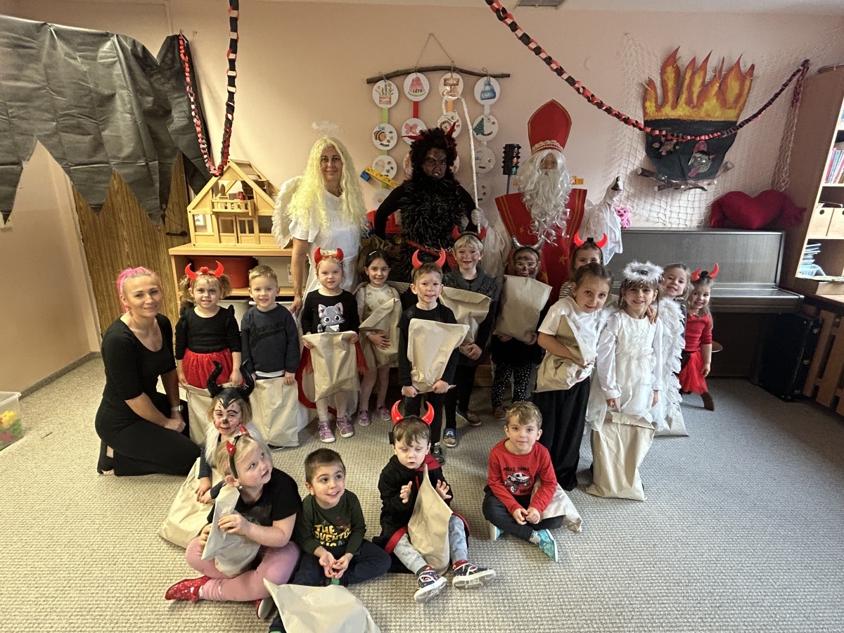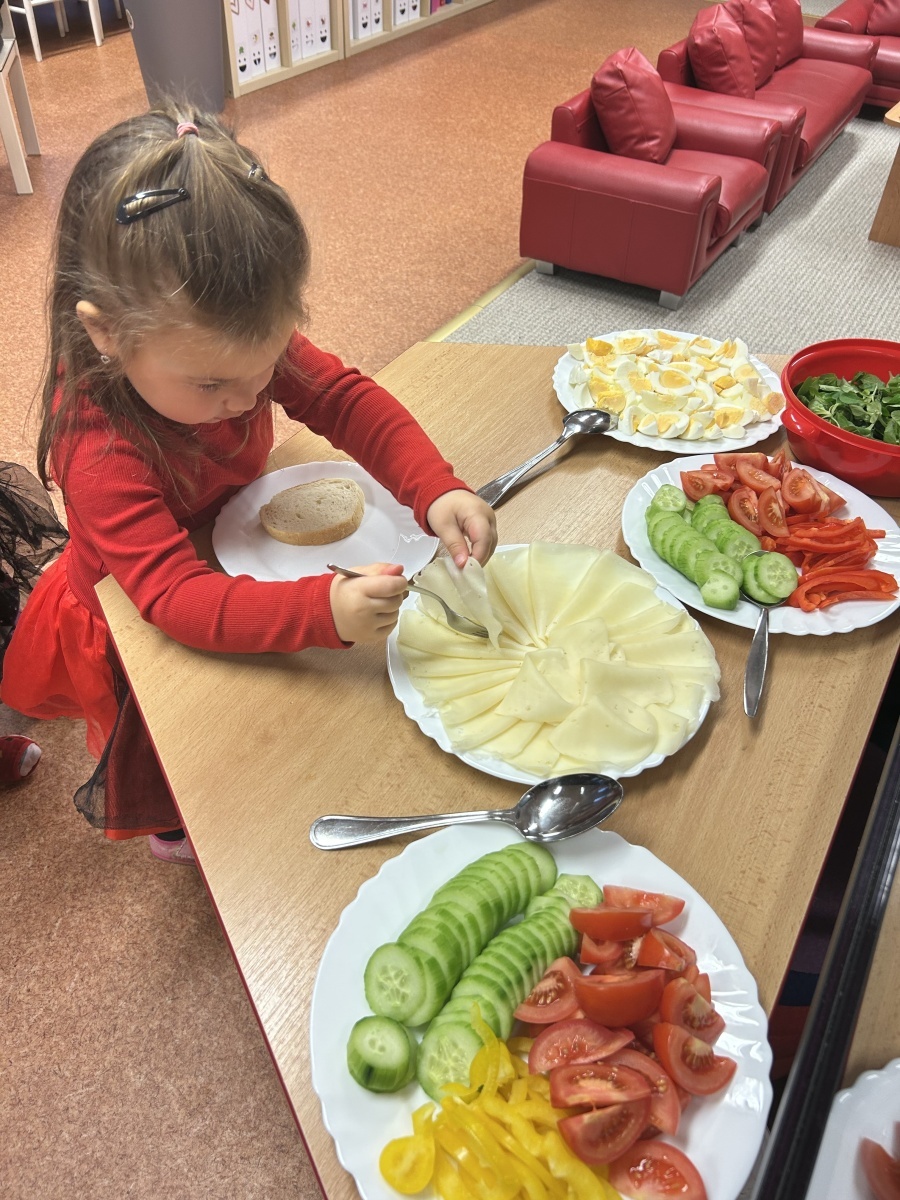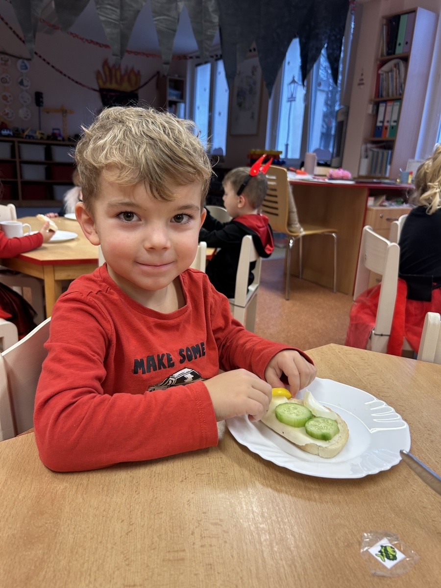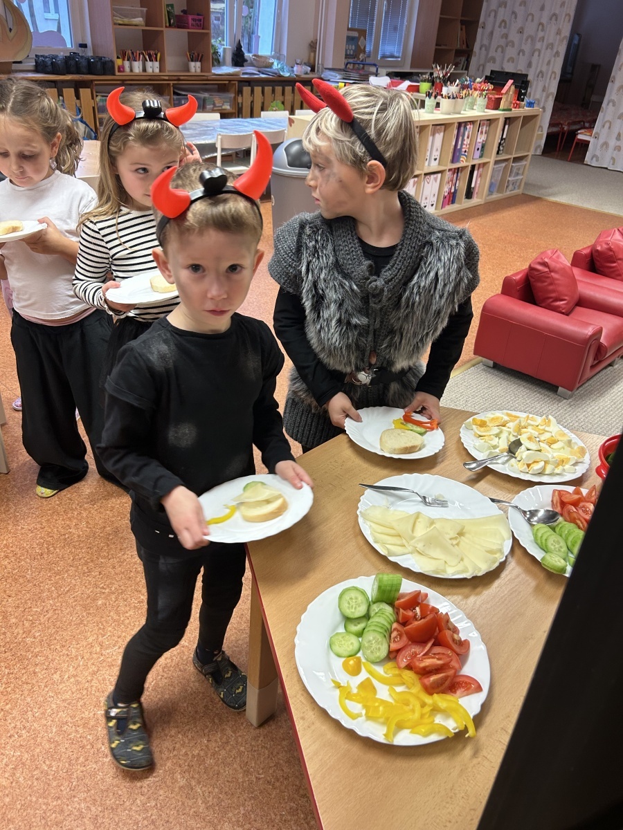 Na třídě Srdíček dnes děti prožily mikulášské dopoledne v duchu zdravého stravování. Před očekávanou mikulášskou návštěvou si samy připravovaly svačinku formou malého rautu, který jim připravily paní kuchařky. Každý si mohl zvolit zeleninu podle vlastní chuti, podle libosti namazat veku a nazdobit si tak pestrý a vyvážený talířek. Děti si užily nejen společnou přípravu jídla, ale také radostné čekání na Mikuláše, které doplnila atmosféra společné spolupráce a samostatnosti.