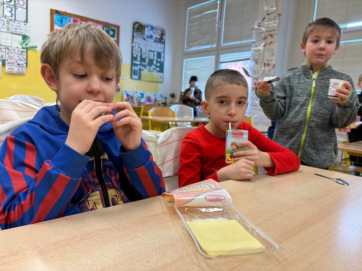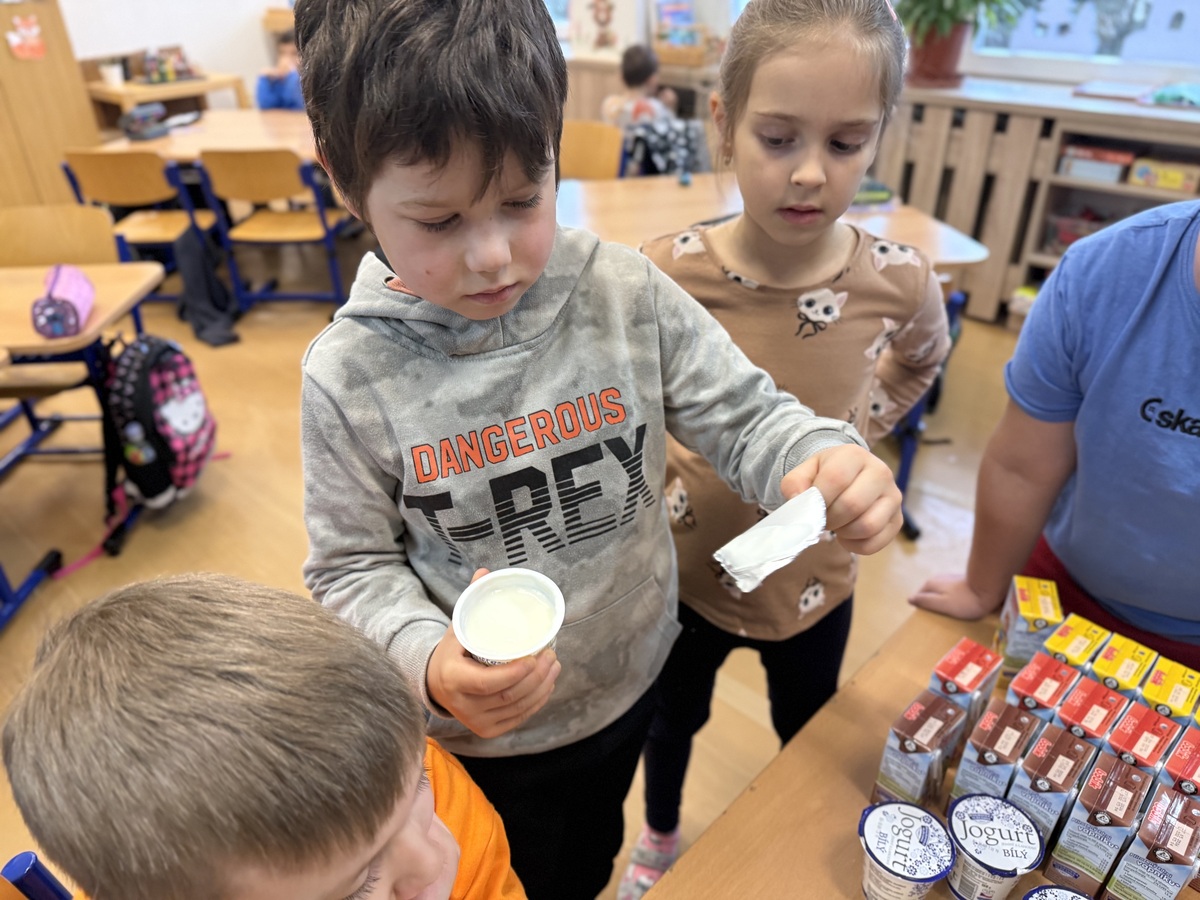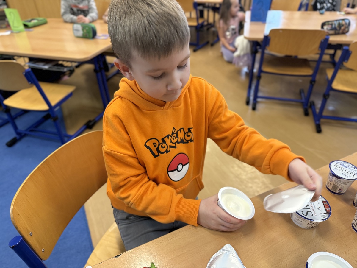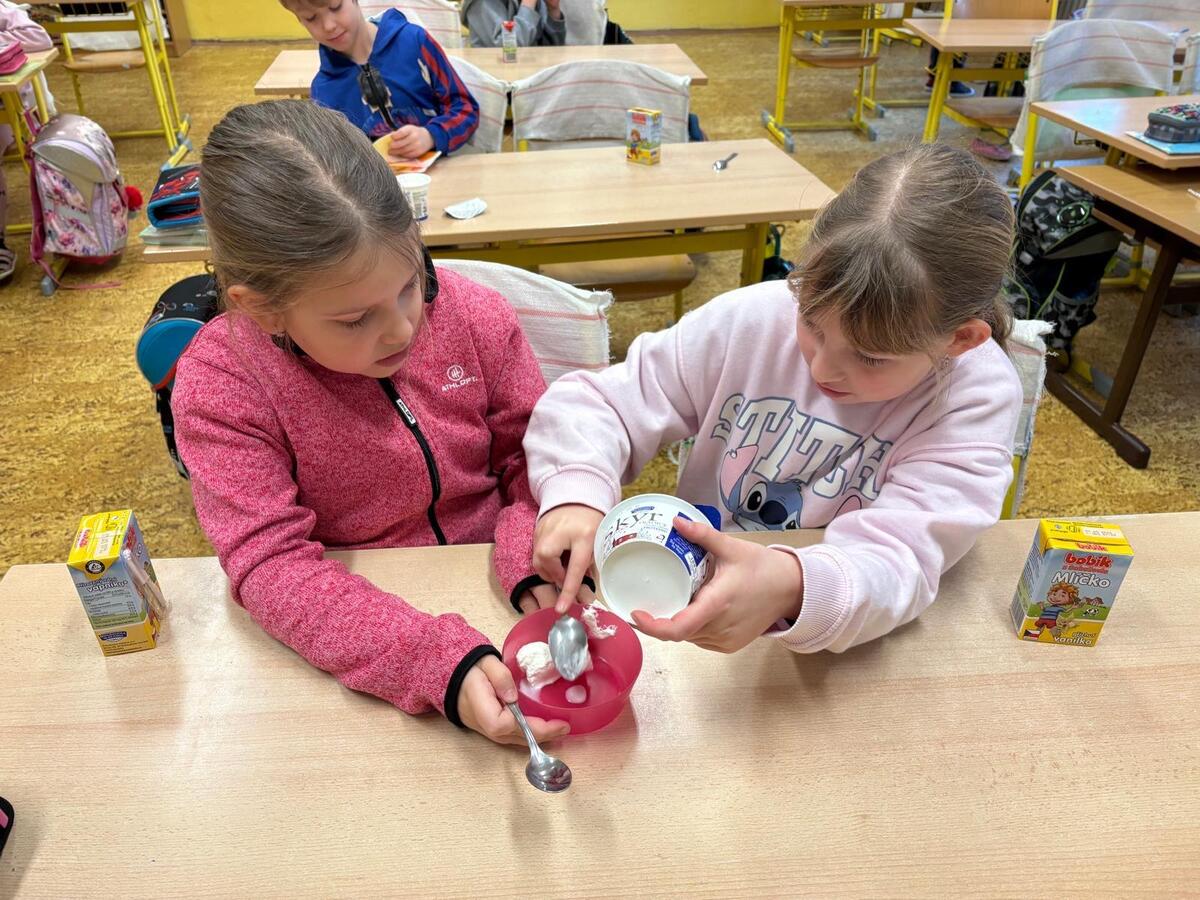 Každý učitel pojal ochutnávku po svém. Někde děti zkoušely mléčné výrobky „jen tak“, čisté a bez dochucení, jinde vznikla zdravá jogurtová snídaně – s ovocem, müsli nebo kapkou javorového sirupu. Nechyběla ani ochutnávka sýrů a povídání o tom, odkud mléčné výrobky pocházejí a proč jsou pro tělo důležité.