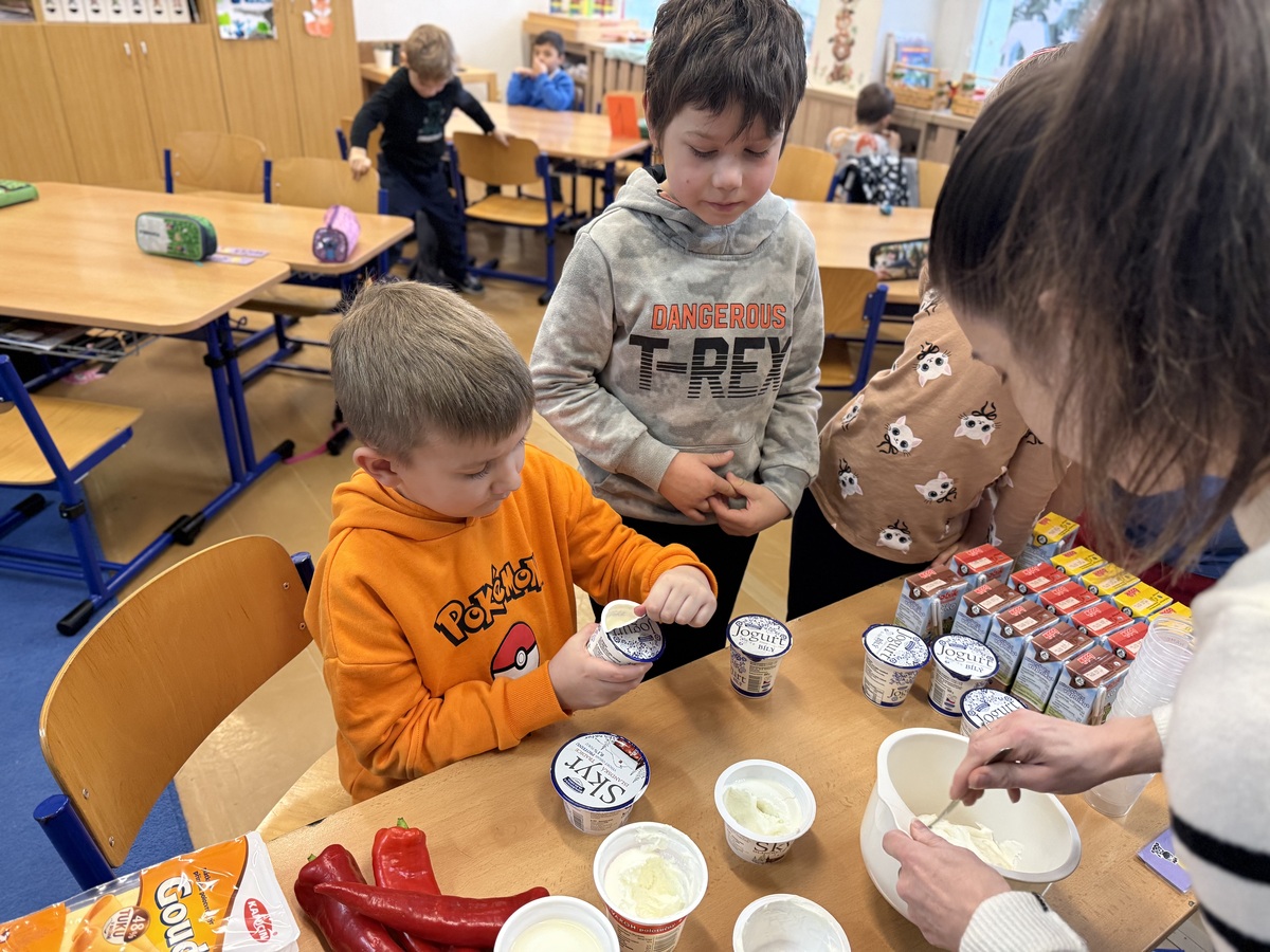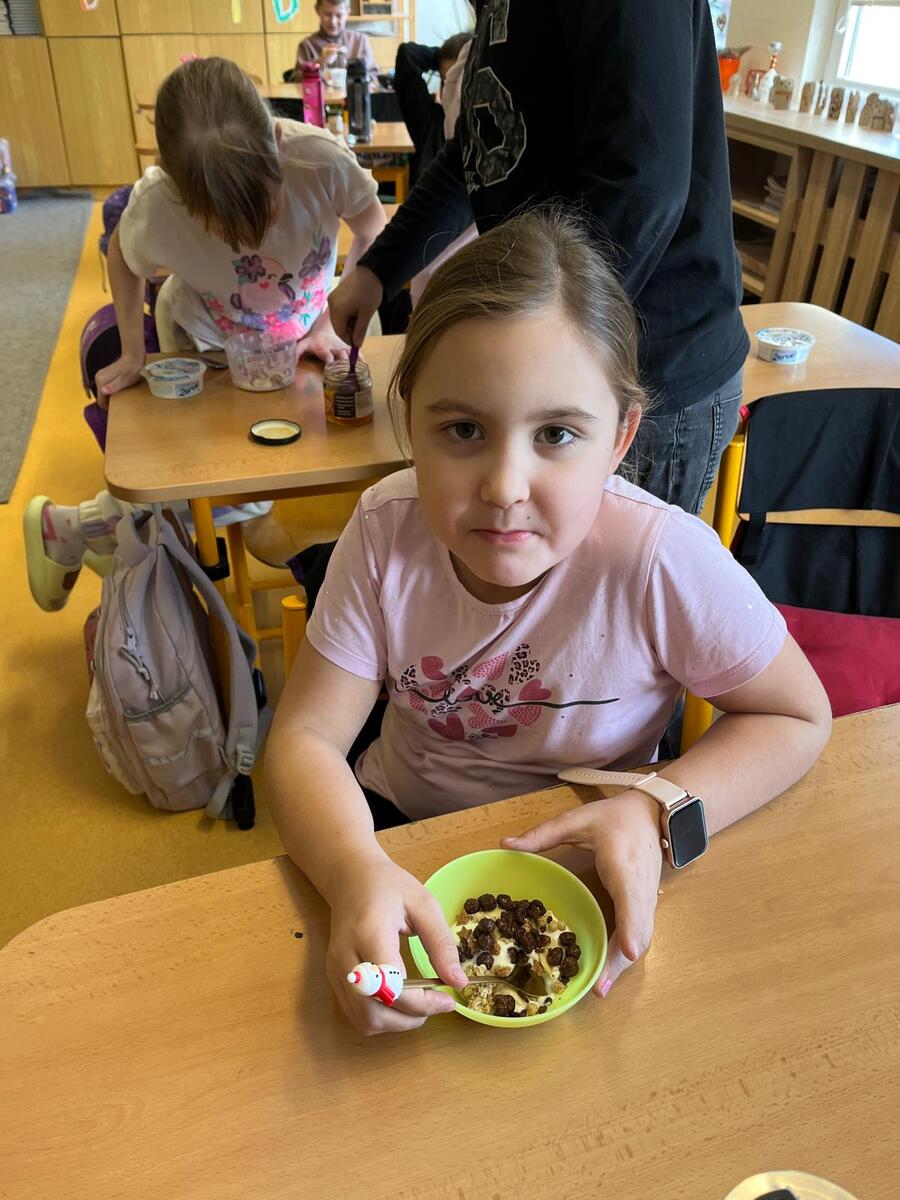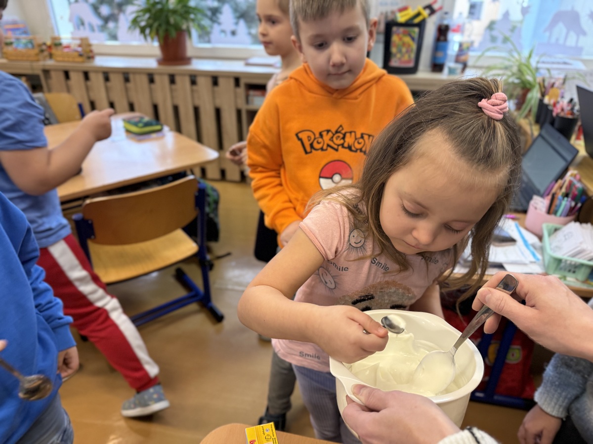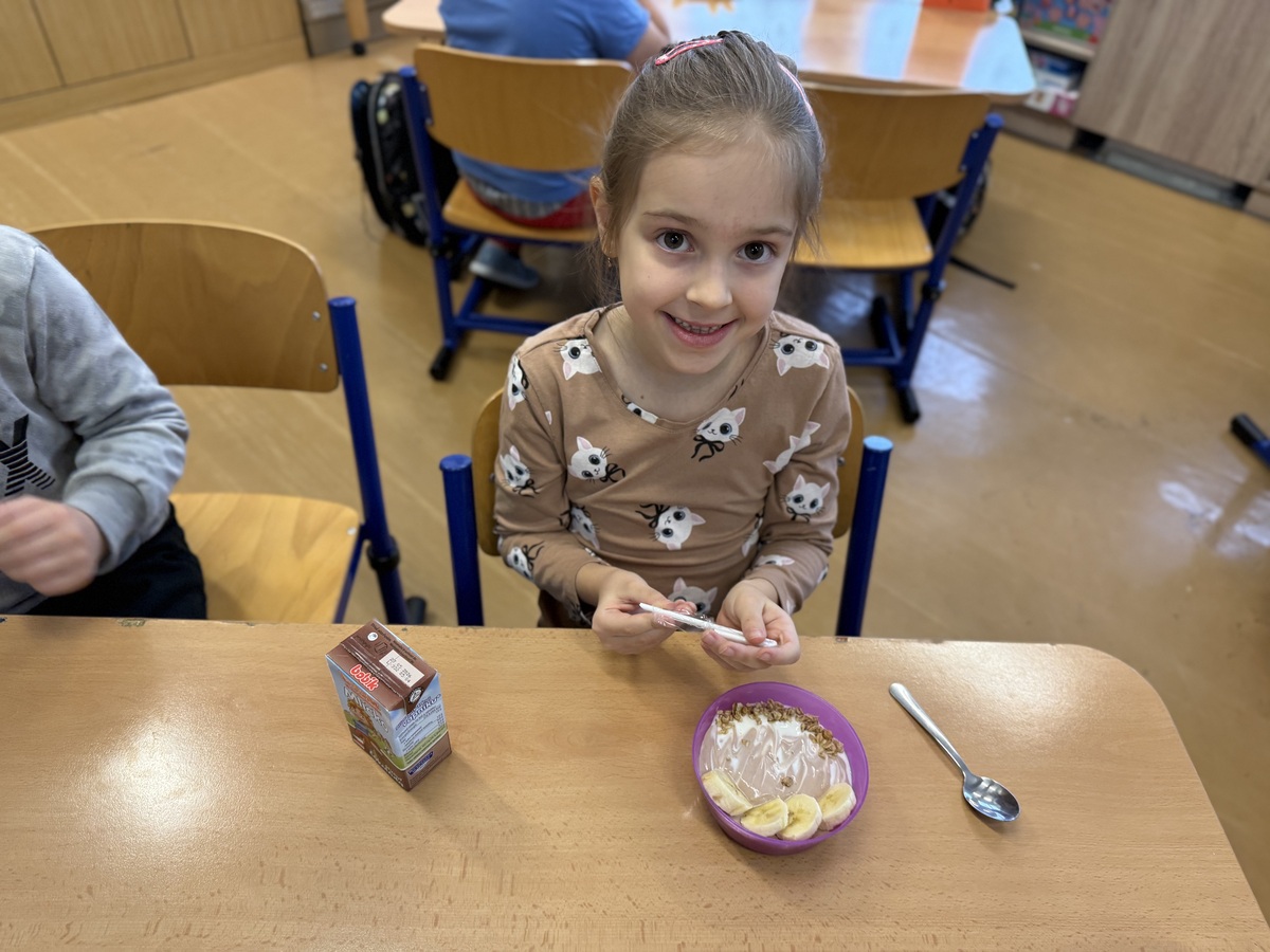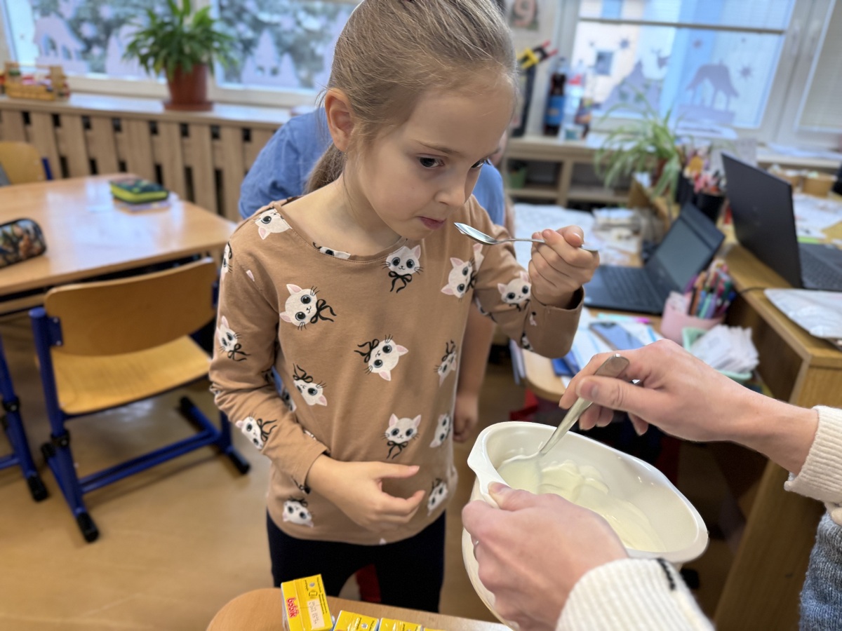 Každý učitel pojal ochutnávku po svém. Někde děti zkoušely mléčné výrobky „jen tak“, čisté a bez dochucení, jinde vznikla zdravá jogurtová snídaně – s ovocem, müsli nebo kapkou javorového sirupu. Nechyběla ani ochutnávka sýrů a povídání o tom, odkud mléčné výrobky pocházejí a proč jsou pro tělo důležité.