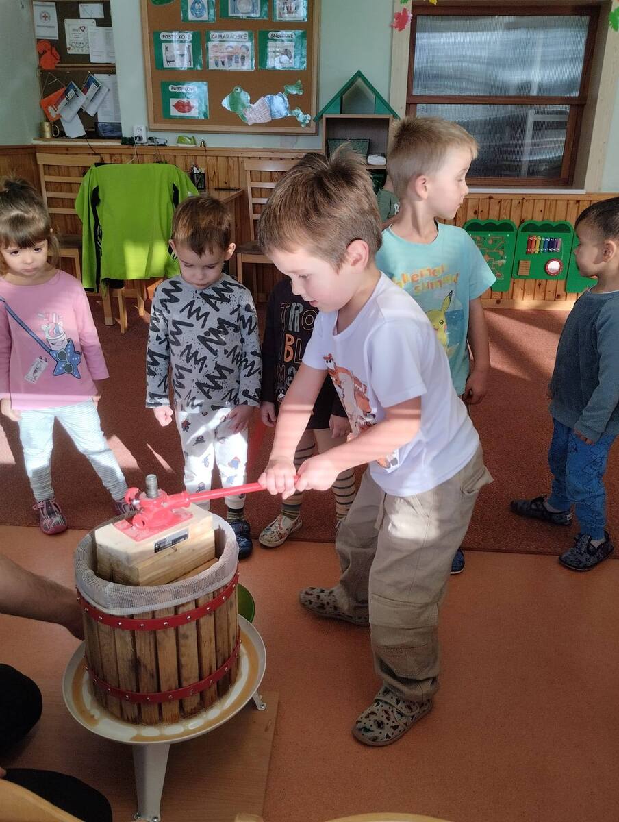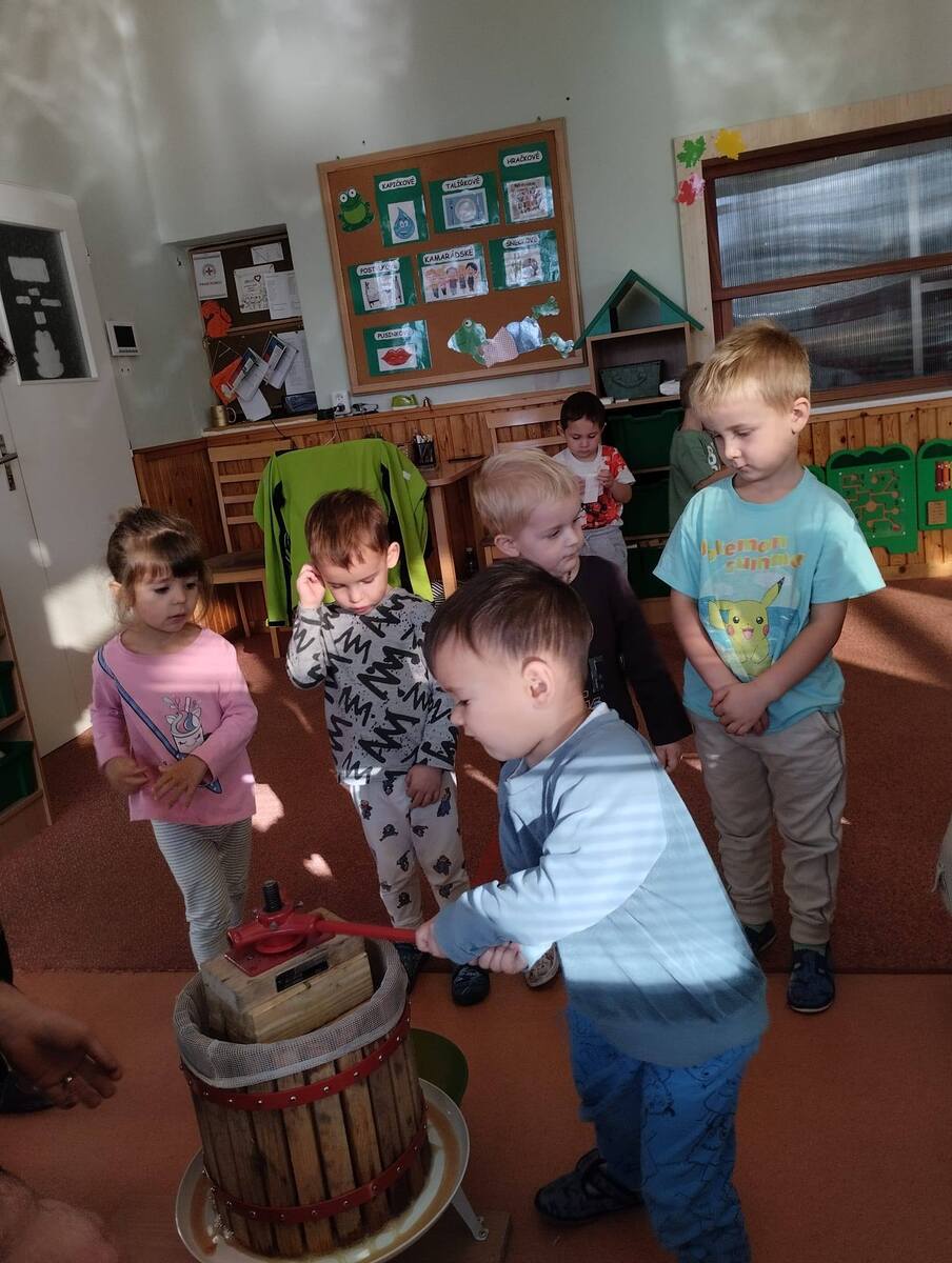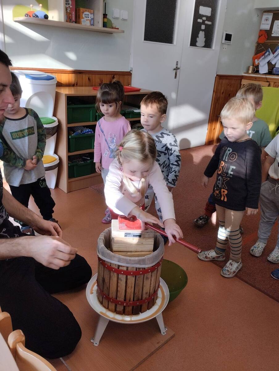 Třída Žabiček zkouší z připravených jablíček lisovat mošt. Děti si práci užívají, sledují, jak z jablek vytéká šťáva, a nakonec všichni ochutnají čerstvý, voňavý mošt.