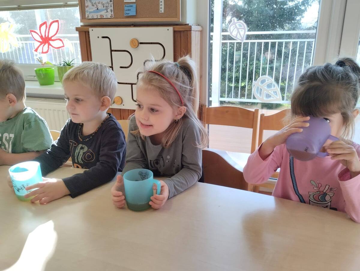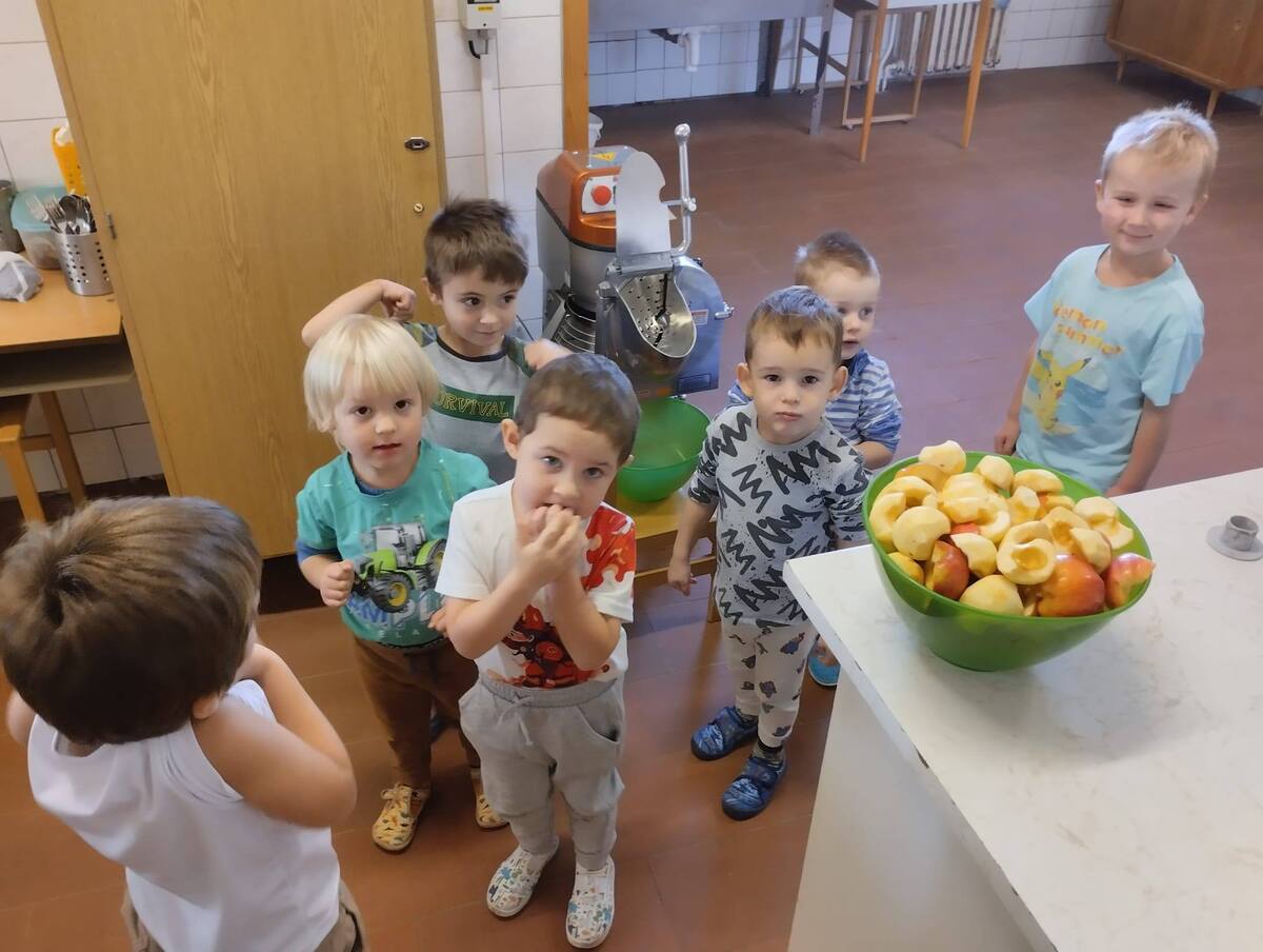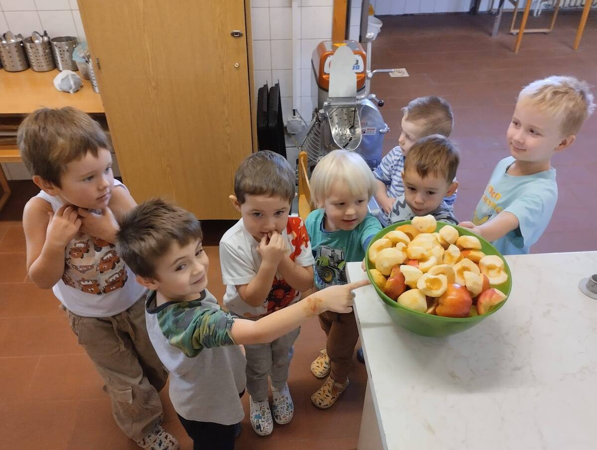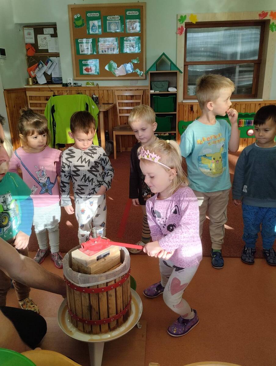 Třída Žabiček zkouší z připravených jablíček lisovat mošt. Děti si práci užívají, sledují, jak z jablek vytéká šťáva, a nakonec všichni ochutnají čerstvý, voňavý mošt.