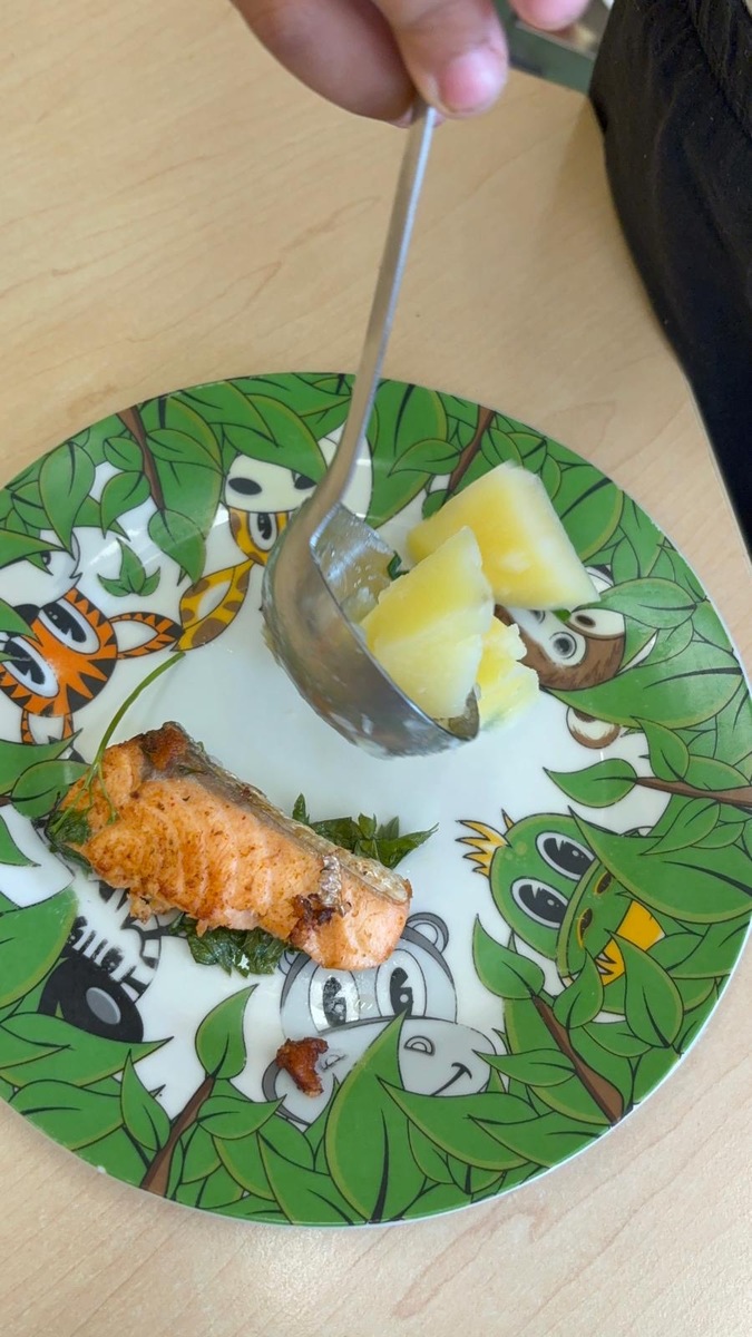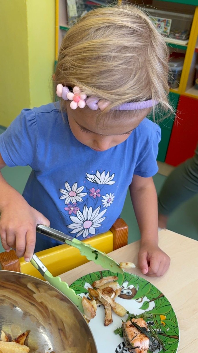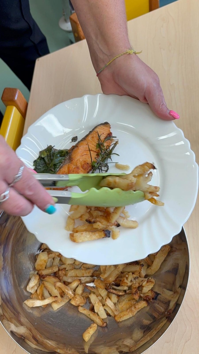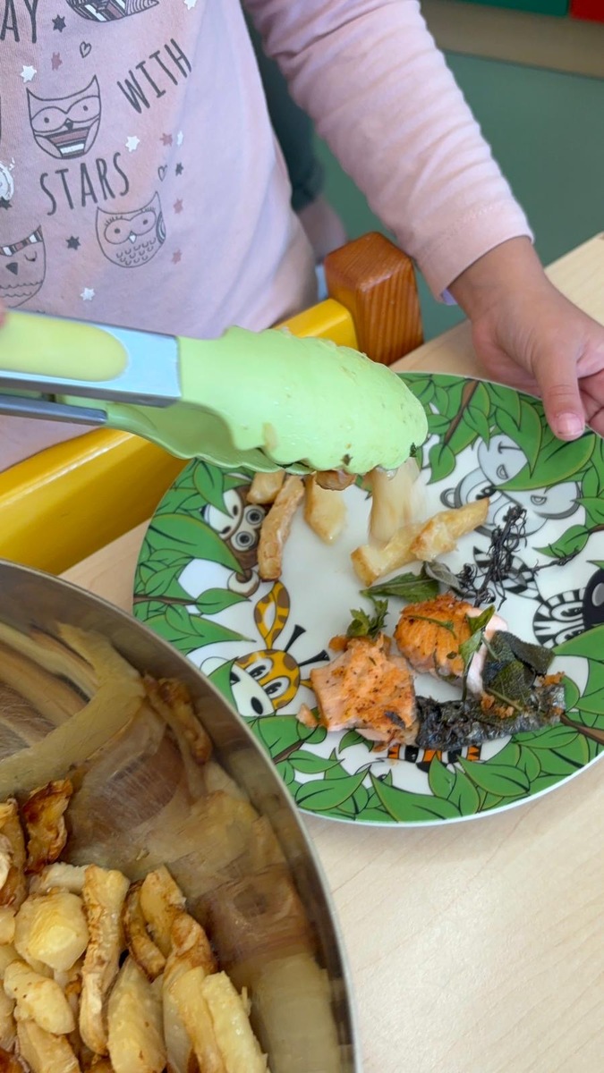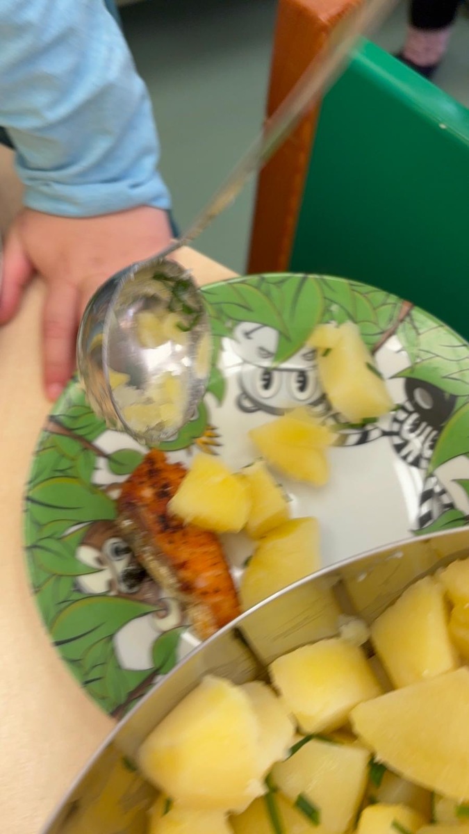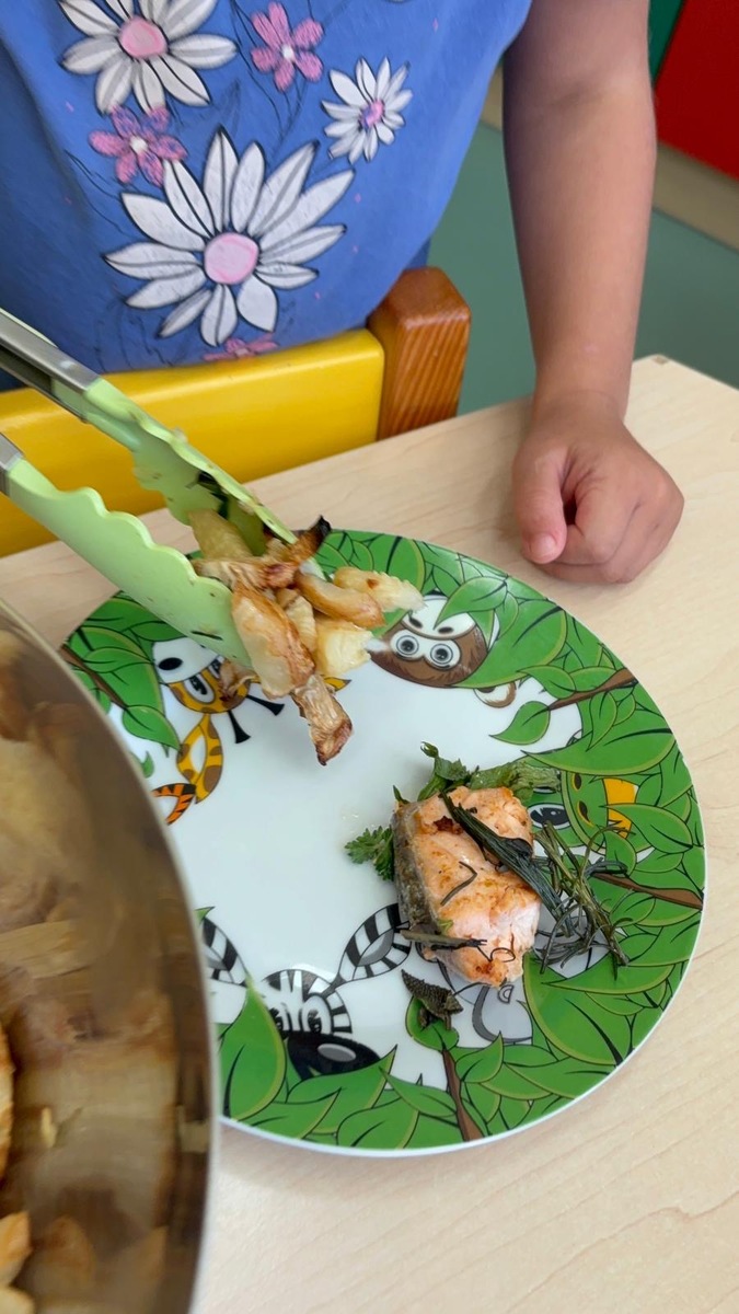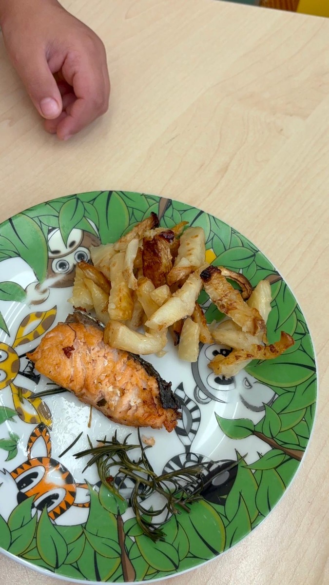Máme ve školce neskutečně šikovnou paní kuchařku a zároveň velmi aktivní ředitelku. Skvělá kombinace. Dnes si Nikolka připravila lososa a dvě přílohy na výběr…. celerové hranolky nebo vařené brambory. Děti se nejen samy rozhodují o své příloze, ale určují si i velikost porce.