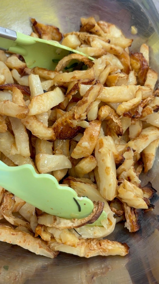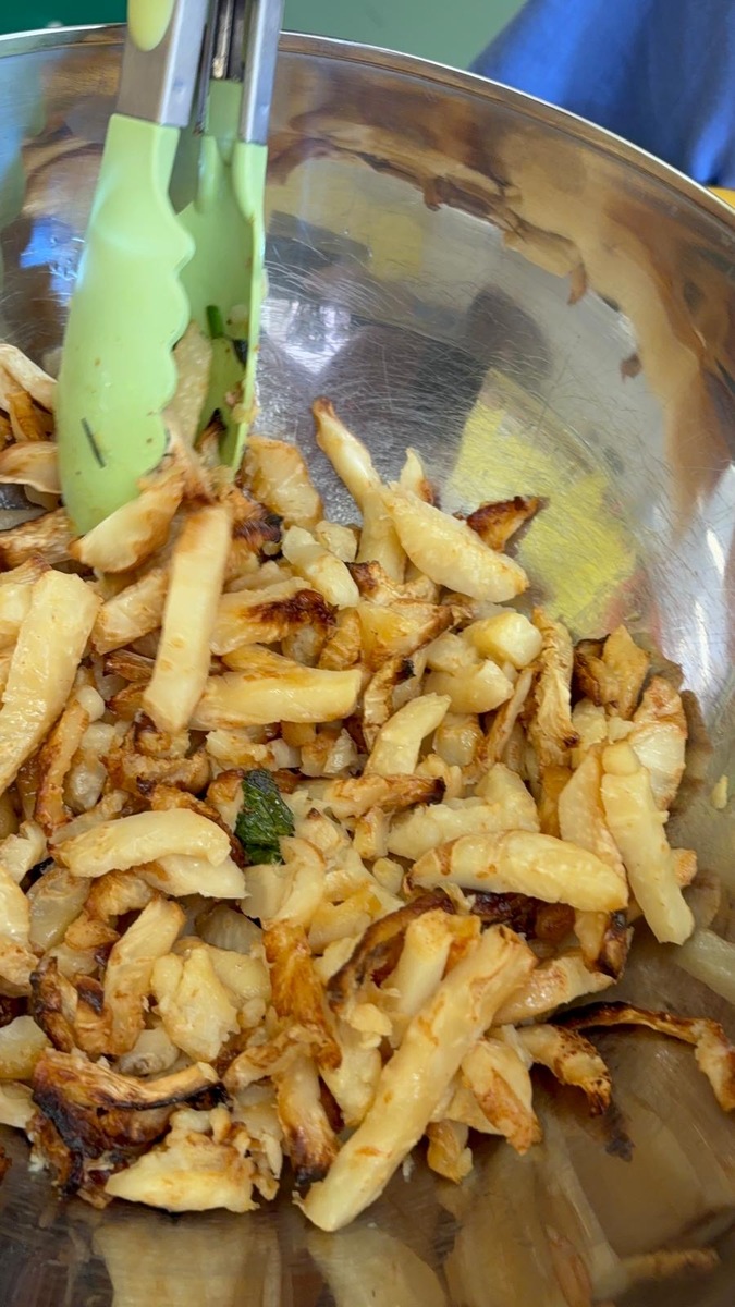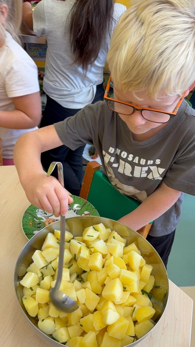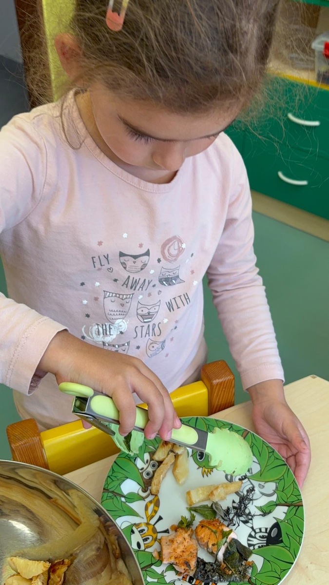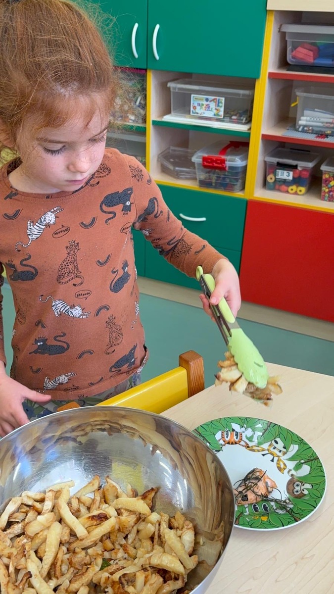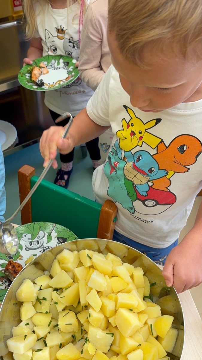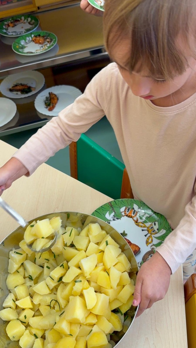 Máme ve školce neskutečně šikovnou paní kuchařku a zároveň velmi aktivní ředitelku. Skvělá kombinace. Dnes si Nikolka připravila lososa a dvě přílohy na výběr…. celerové hranolky nebo vařené brambory. Děti se nejen samy rozhodují o své příloze, ale určují si i velikost porce.