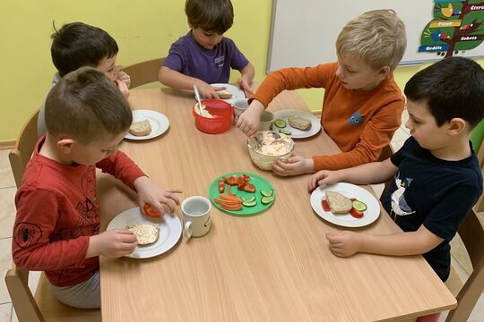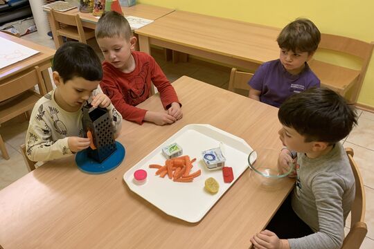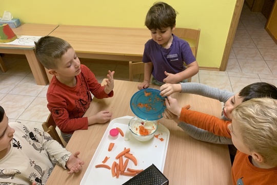 Po úspěšném pěstování microgreens, jsme se rozhodli s dětmi udělat mrkvovou pomazánku. Pojmenovali jsme si všechny suroviny, řekli si, co obsahují a proč jsou důležité pro náš zdravý životní styl. Děti se pustily s vervou do práce, všechny chtěly dělat vše. Postupně se vystřídaly a nakonec si pochutnaly na pomazánce, kterou si namazaly na housku a přidaly k tomu zeleninu.
