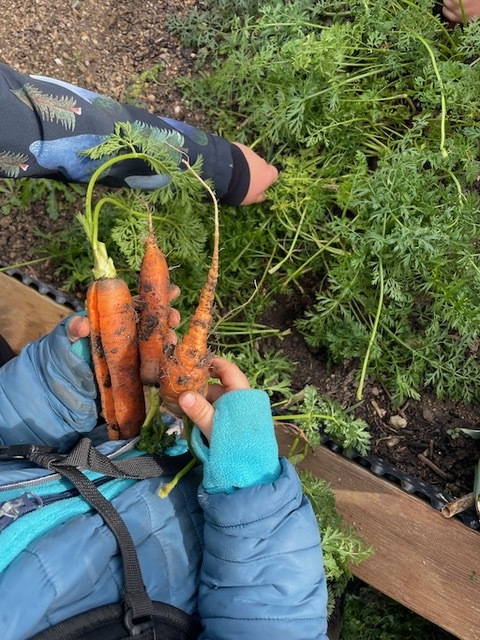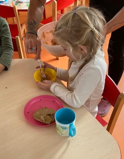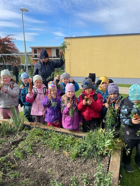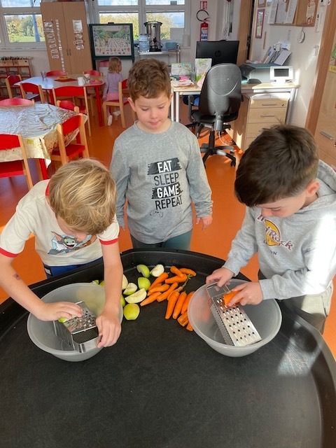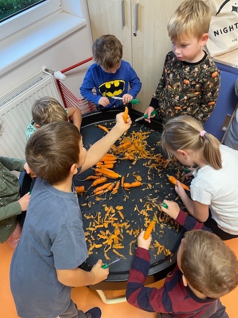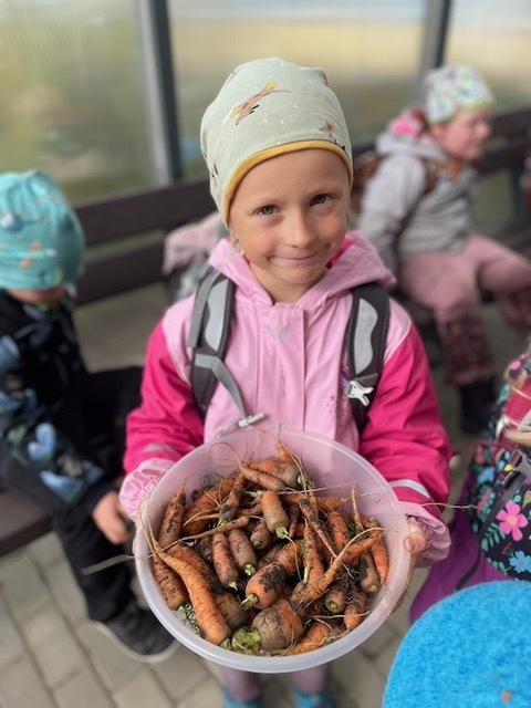 Na jaře jsme oseli třídní záhonek, pozorovali růst mrkviček a na podzim sklidili pěknou úrodu. Děti s pomocí dospělých mrkve omyly a pak už pracovaly zcela samostatně. Ježečci zvládají používat škrabky, nože, struhadla, odměřovat suroviny, míchat i rozdělovat hotový pokrm do misek. Nastrouhanou mrkev a jablka, také ze školní zahrady, děti osladily troškou cukru, směs zakáply citronovou šťávou a chutná odpolední svačina byla na světě. Bioodpad děti odnesly na školní kompost.
