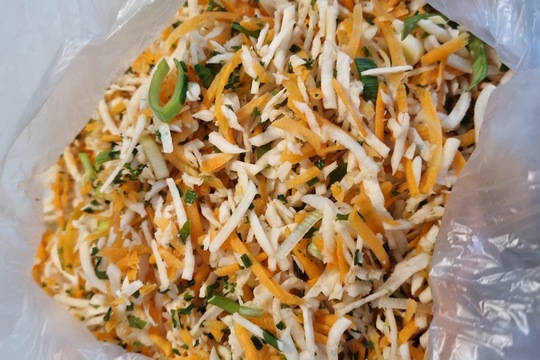 Na své zahrádce zklidili s manželem kořenovou zeleninu (mrkev, petržel, celer) a pórek. Zeleninu nakrouhali a přidali do ní nasekaný líbeček, vše promíchali a nasáčkovali.