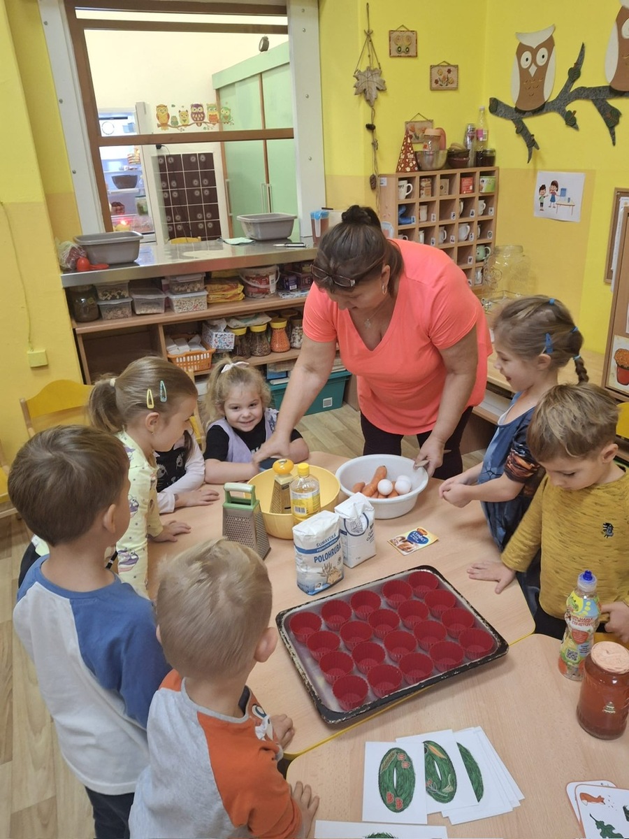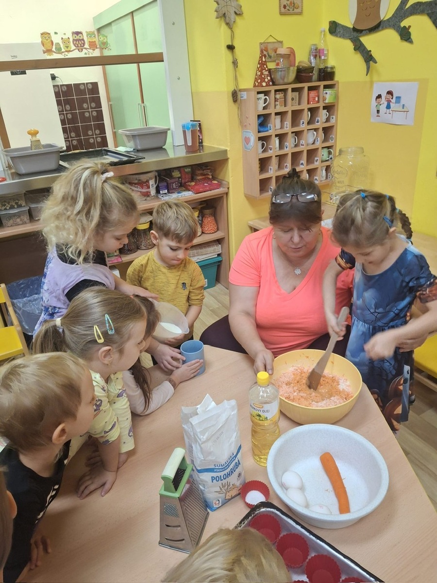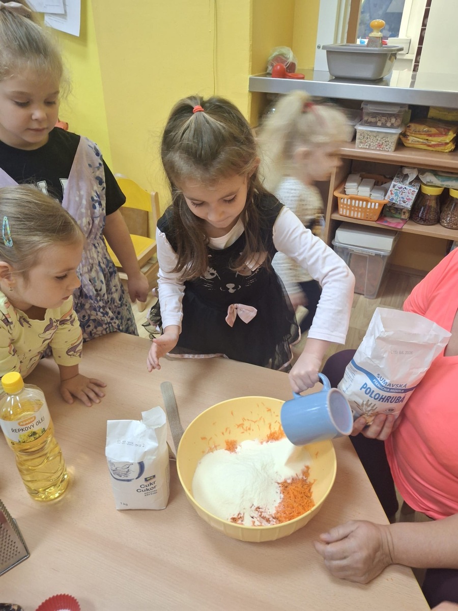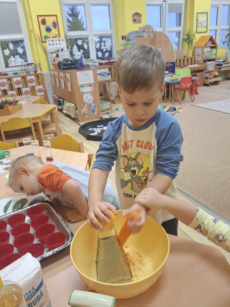 S dětmi jsme si upekly mrkvové muffiny. Děti si připravily všechny ingredience a pomůcky na pečení. Postupně přidávaly všechny ingredience do mísy. Poté jsme připravené těsto nalily do formiček a daly paní kuchařce péct do trouby. Nakonec jsme si je všechny ozdobily.
