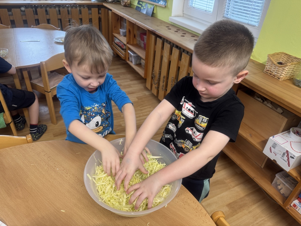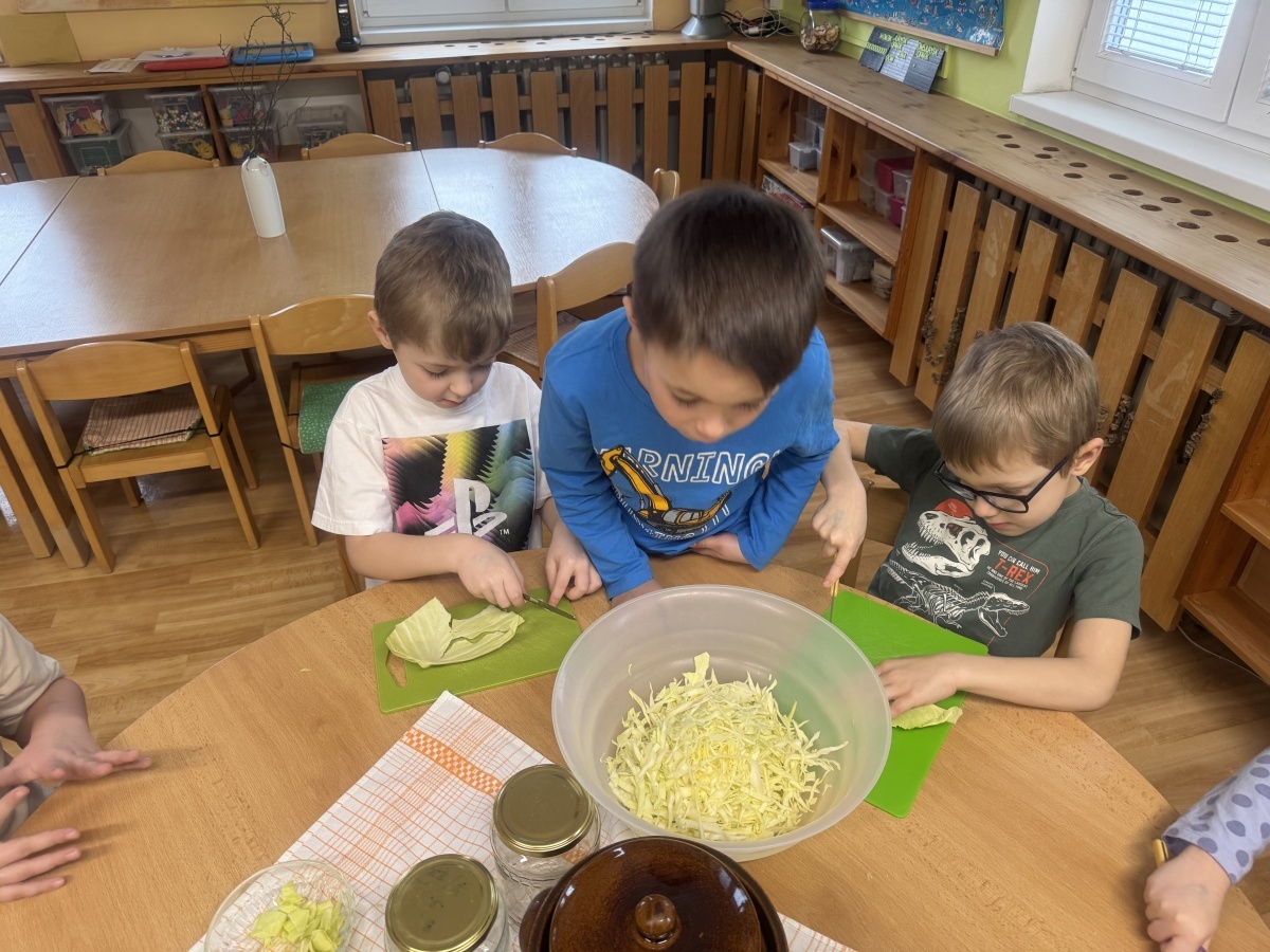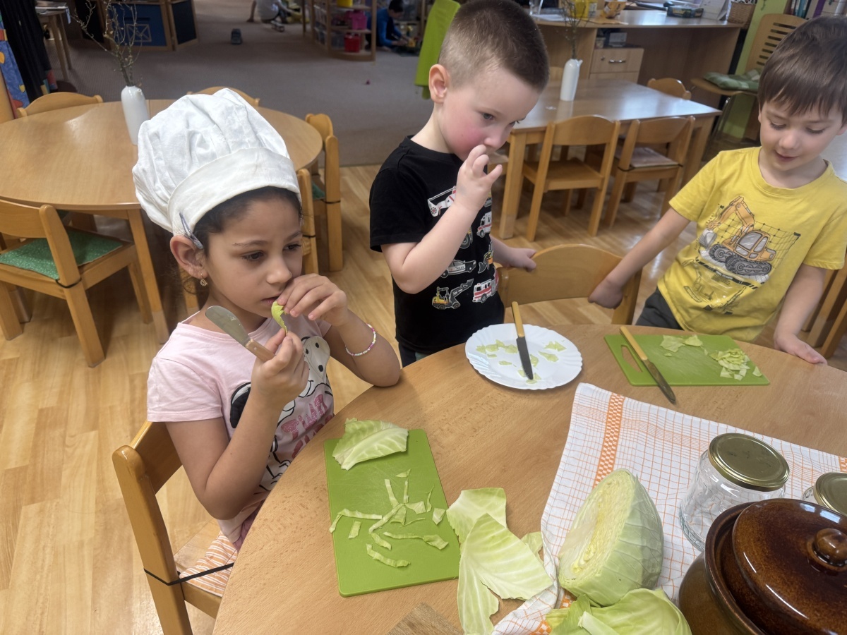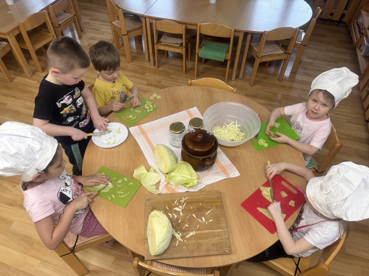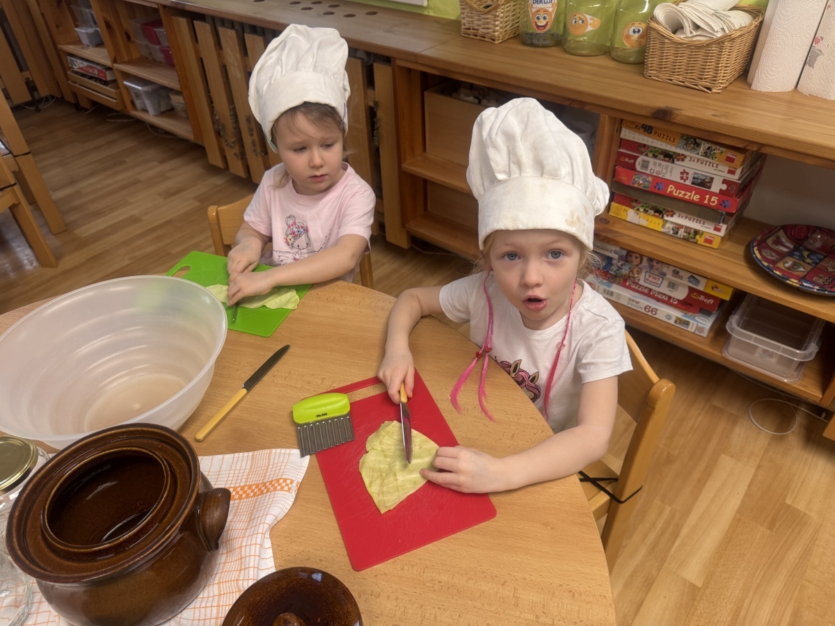 V naší školce jíme zdravě, protože víme, jak je to pro naše tělo důležité. Dneska hrály děti námětovou hru Na kuchaře a vytvořily si přírodní zdroj vitaminu C v podobě nakládaného zelí. Krájení, nakládání a pozorování procesu kvašení je pro děti obrovským prožitkem. A na první ochutnávku se už všichni těšíme.