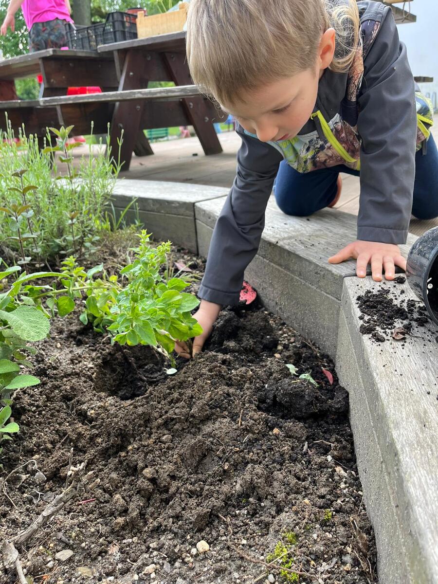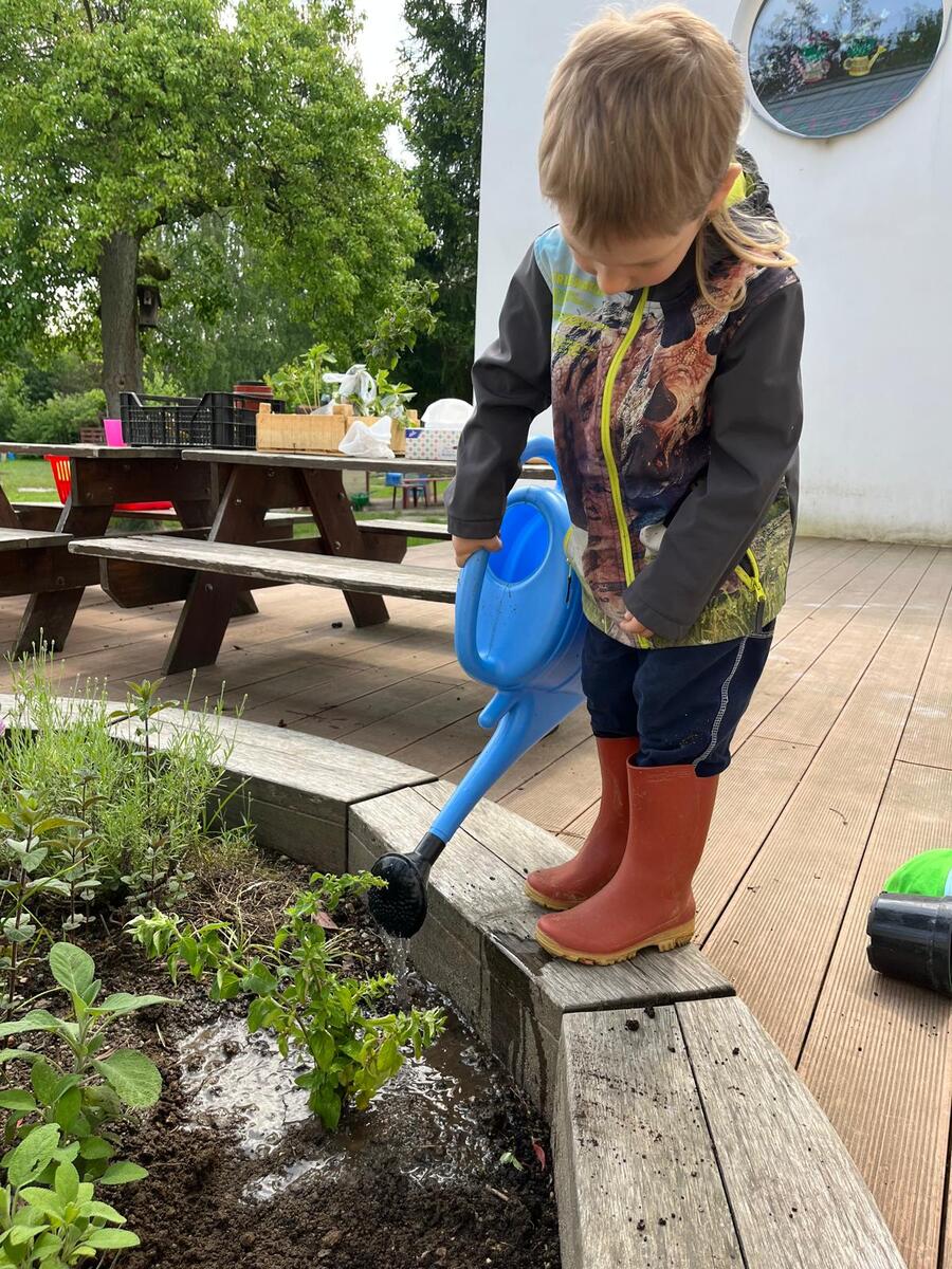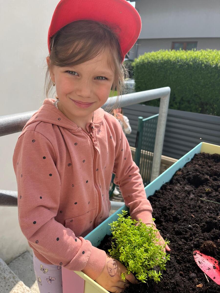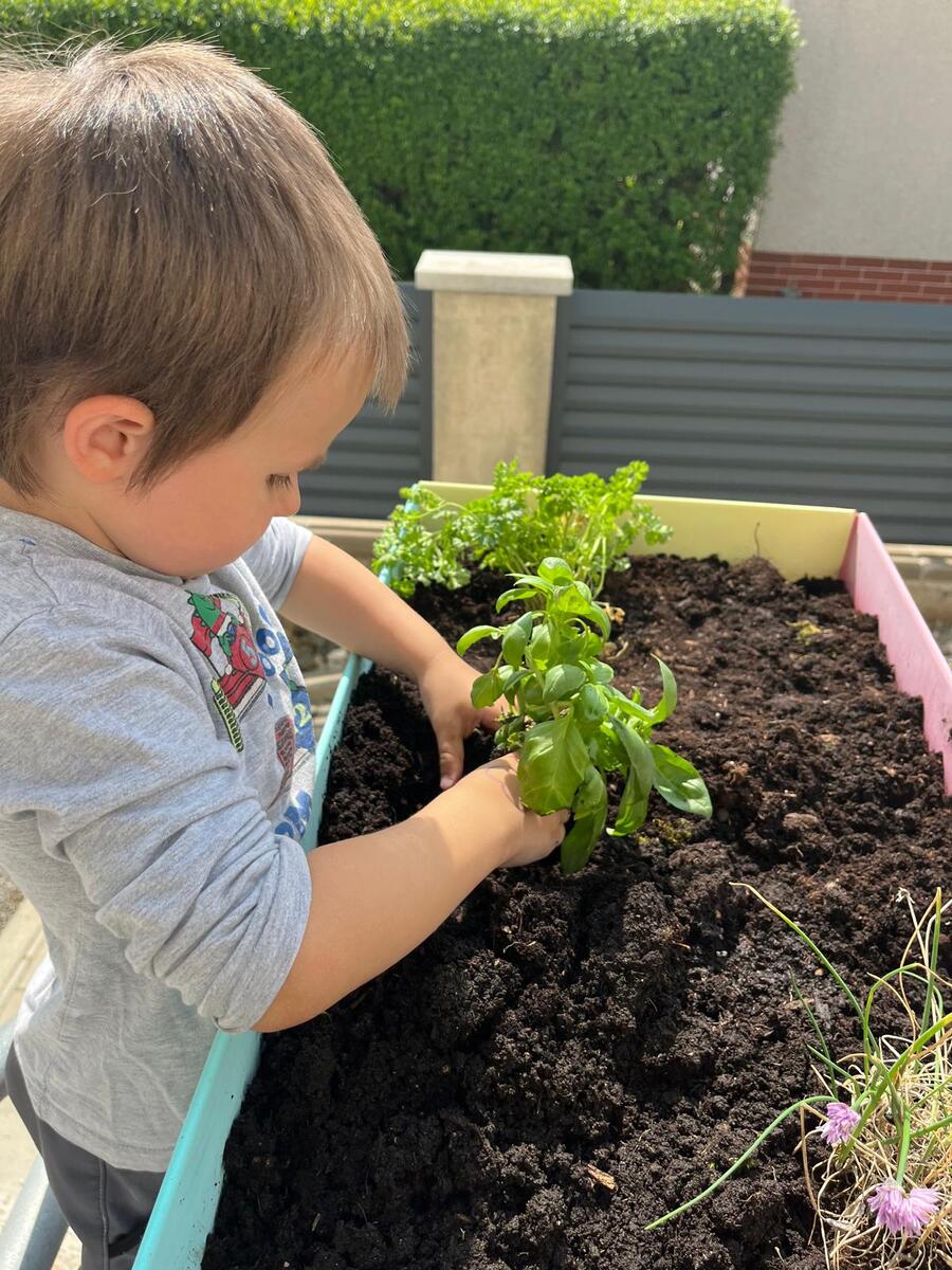 Na školní zahradě máme malou bylinkovou zahrádku, o kterou se s láskou starají naše děti. Samy bylinky sází, zalévají a sledují, jak rostou. Díky jejich péči mají paní kuchařky čerstvé bylinky do kuchyně-bazalku, pažitku, mátu nebo petrželku. Děti společně s paní kuchařkami vždy utrhnou jen takové množství, které se opravdu spotřebuje-tím učíme děti neplýtvat a vážit si všech, co nám příroda dává. Děti tak vidí, že to co vypěstují, se opravdu využije při vaření a dodá jídlu chuť i vůni.