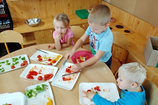 V rámci dopoledních aktivit jsme si s dětmi připravili zdravou svačinku. Děti si nejprve namazaly připravené chlebíky tvarohovou pomazánkou a poté krájely, ochutnávaly a zdobily chlebíky dle své fantazie. Příprava pokrmů byla velká zábava.