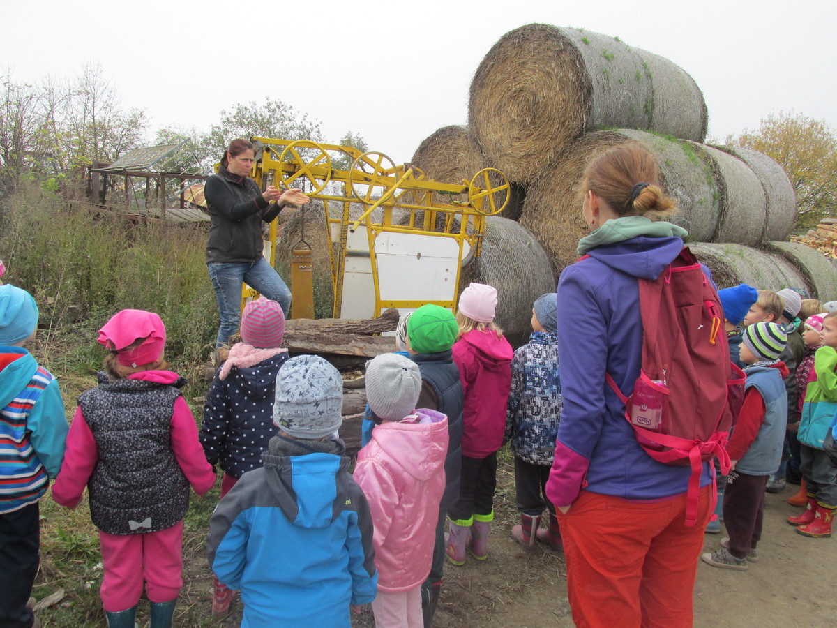 Přivítala nás usměvavá paní Veselá s přítulnou fenkou Belou a obě nás provázely po celém statku. Paní Veselá nám ukázala stroje, které jim pomáhají v těžké práci na poli např. secí stroj na obilí, traktory s různými radlicemi na těžké balíky slámy, orání apod. a také přístroj na dojení mléka od kraviček. Provedla nás kravínem, kde jsme viděli býky, krávy, telátka a měli jsme velké štěstí, protože předešlý den se narodilo telátko a ještě mu nestačili dát jméno. Děti mu vymyslely jméno Kristýnka. Ostatní kravky, jalovice a býci se volně pasou na okolních pastvinách. Děti měly možnost vidět kuřátka, slepice, králíky a krůty s krocany. Když děti spustily: "Kvokvokvokvo", tak se ozvalo se všech zobáčků: "Hudryhudryhudry" - byla to velká legrace. Taky jsme se dozvěděli, kdo je to paznehtář a veterinář a kolik to dá práce obstarat všechna zvířata a polnosti.