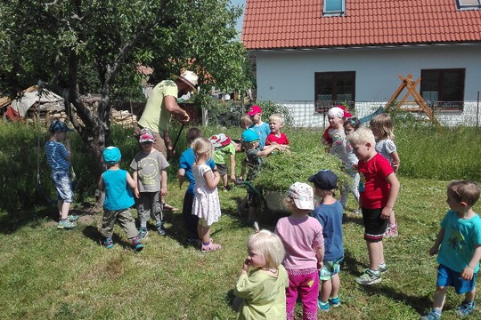 Děti si prohlédly zvířátka a vyrazily na pole, kde jim farmáři ukázali nářadí a způsob, jak s ním pracovat. Děti si vše mohly vyzkoušet.
