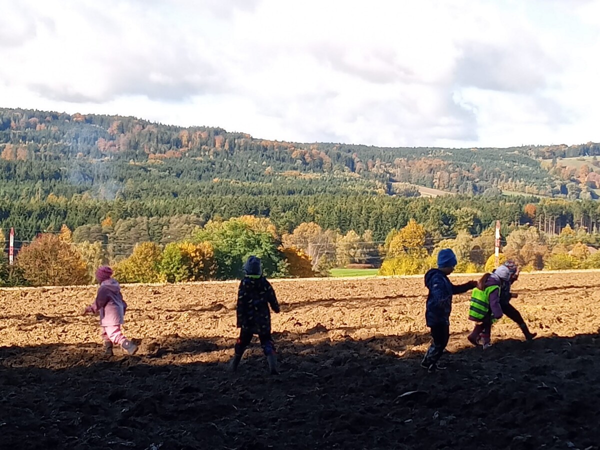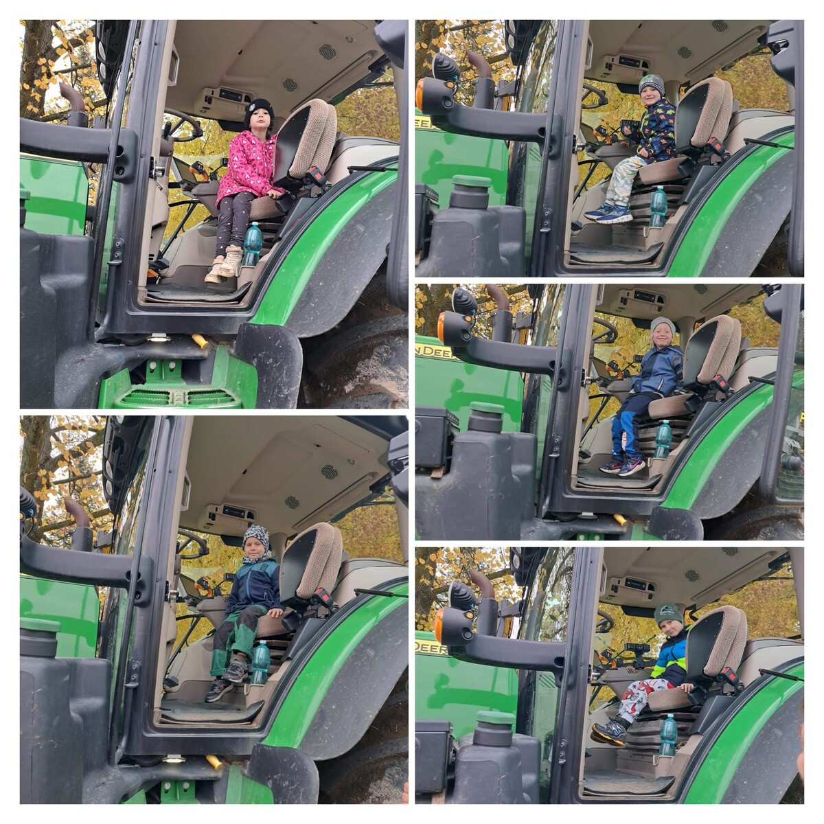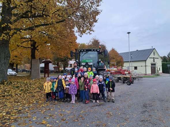 Celý týden se v naší škole a školce prolíná téma farmáři, pole, les. Proto se jeden z tatínků, který pracuje v zemědělství, po cestě na pole zastavil představit dětem svůj pracovní stroj. Kdo by se nechtěl posadit za volant tohoto mega traktoru? Všichni z byli nadšení.