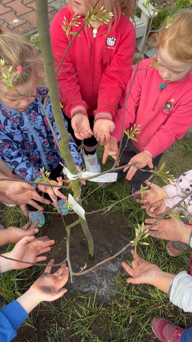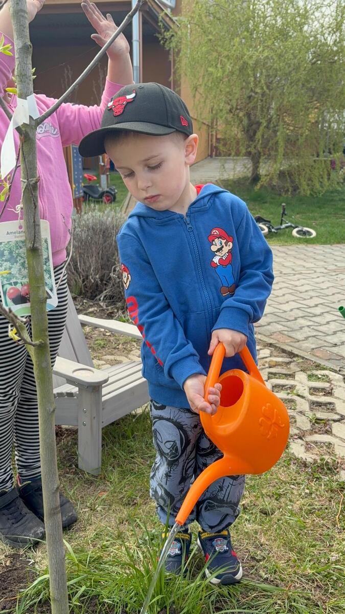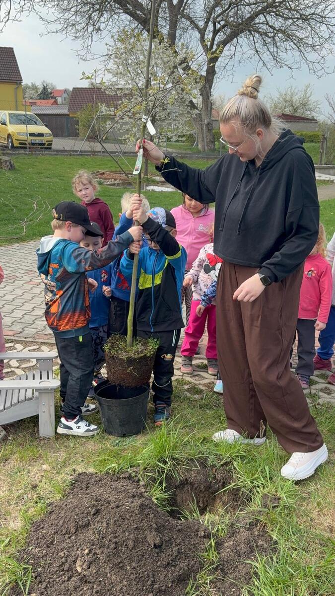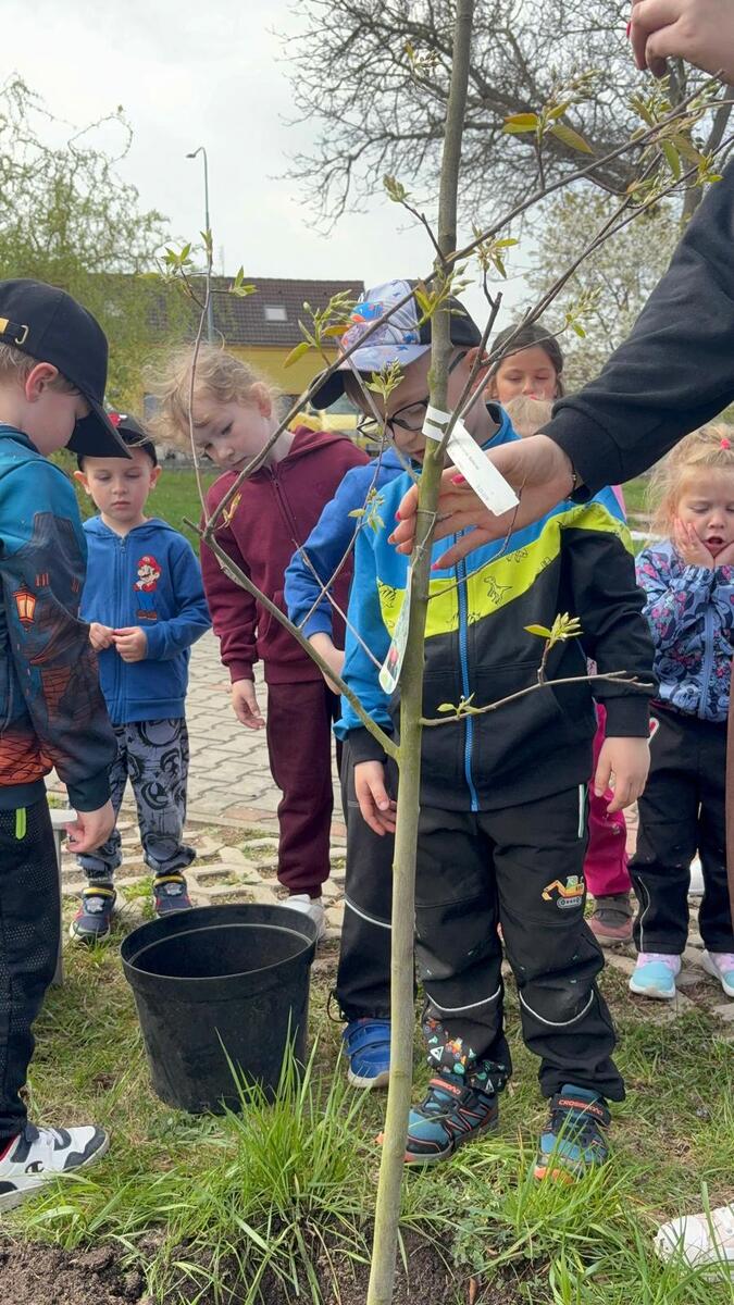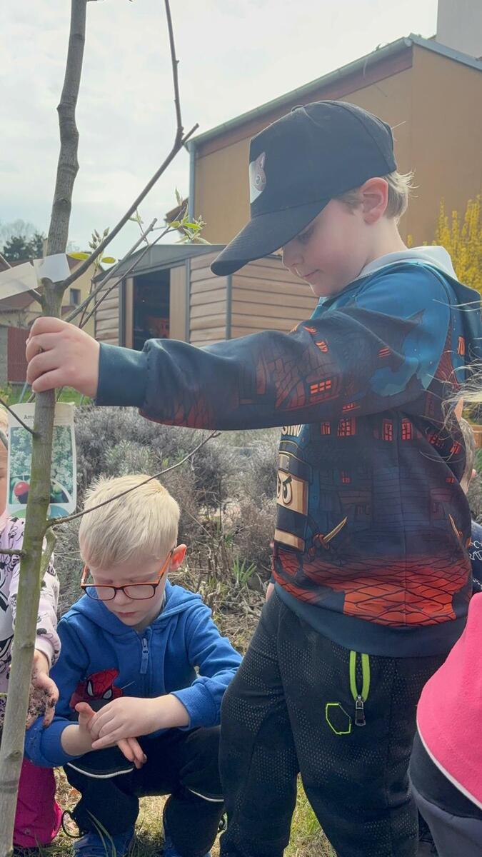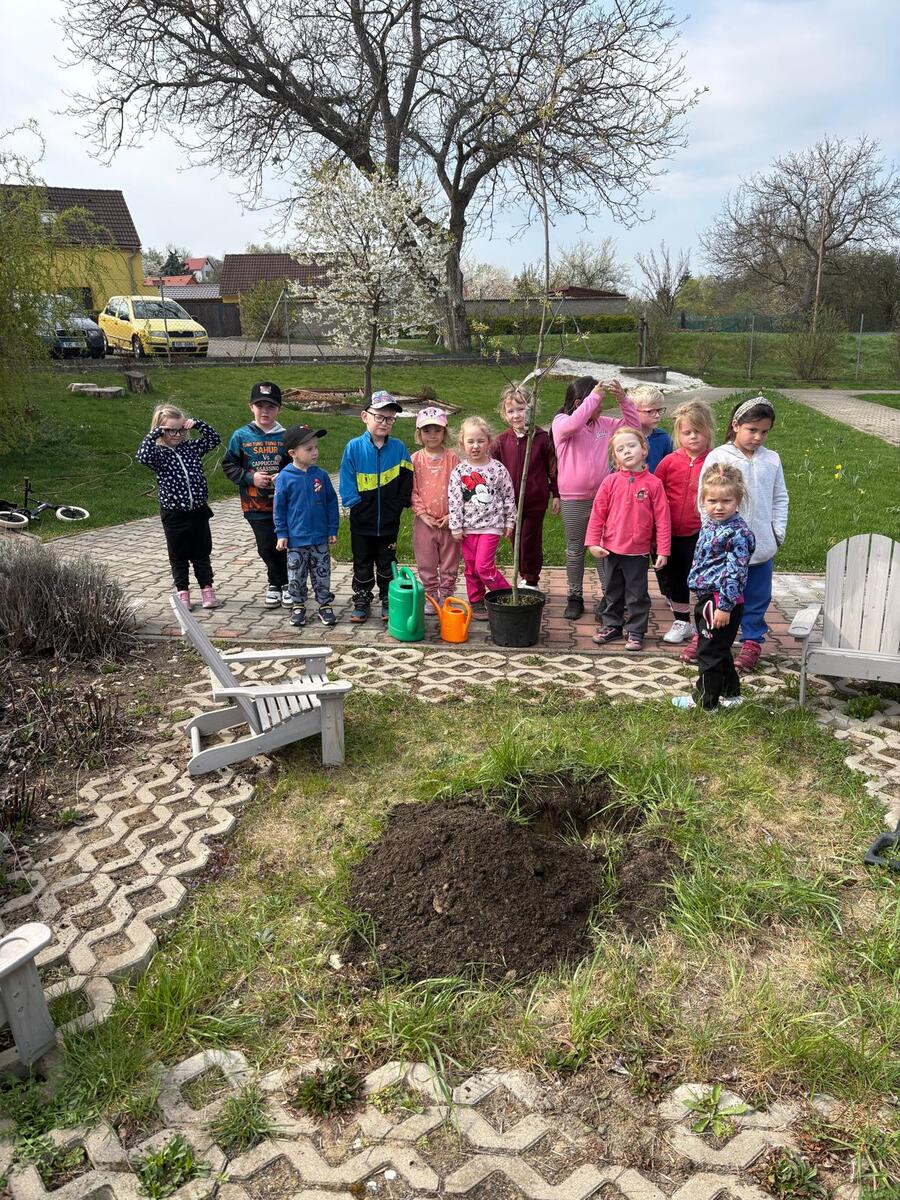 Na naší zahradu patří nejen jedlé ovocné keře a květiny, ale i stromy, které budou plodit chutné ovoce. Dnes si děti společně zasadily vedle třešně, jabloně, hrušně, slívy, broskvoně a meruňky nový přírůstek v podobě muchovníku. Poskytne dětem nejen stín, ale i možnost mlsání.