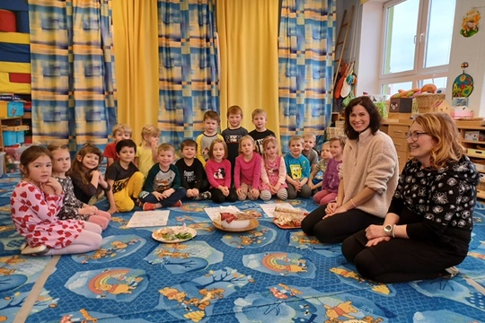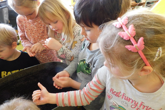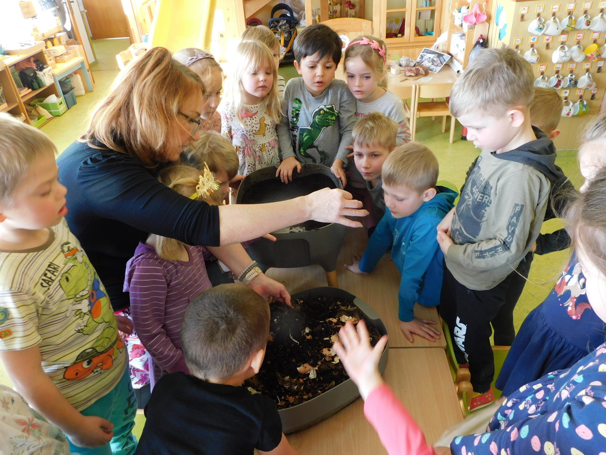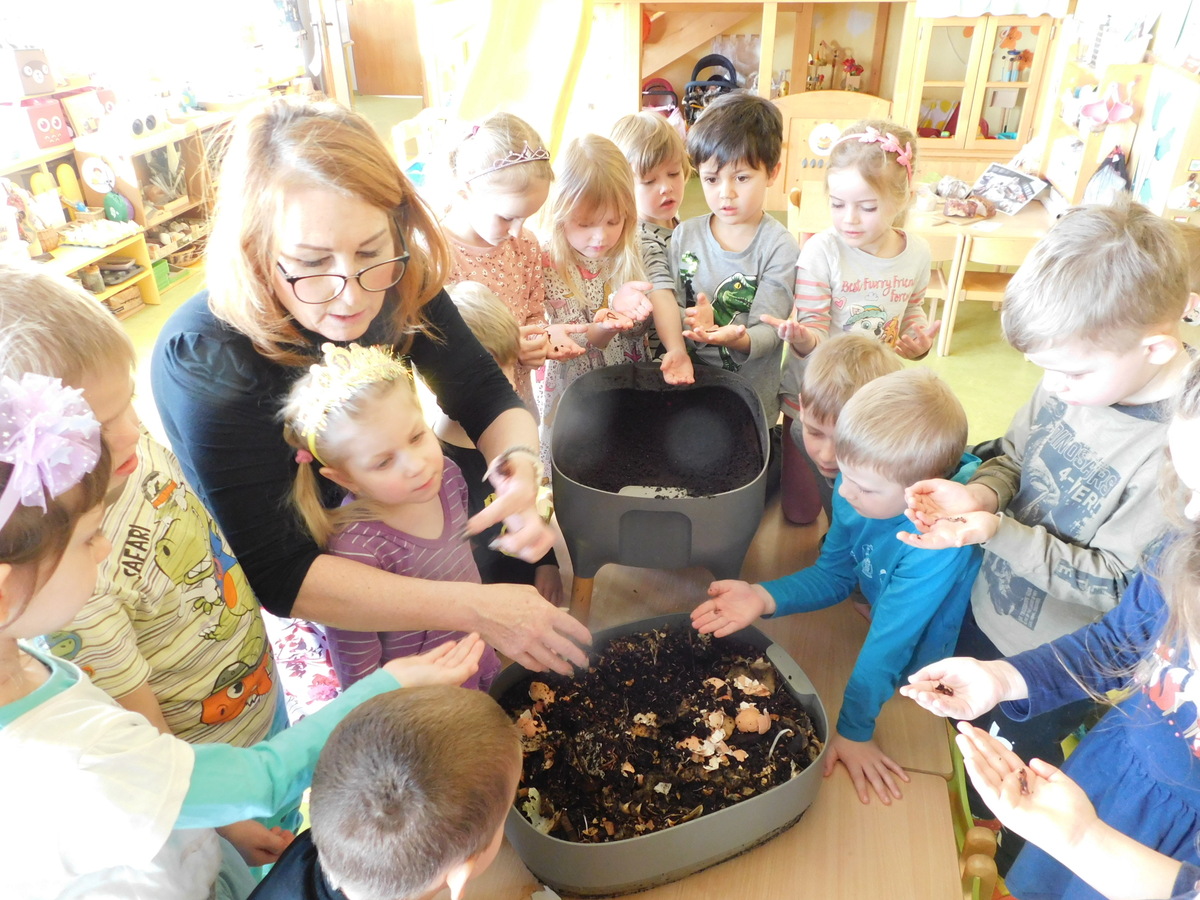 No, pěkně roztřídit a uklidit. My jsme v rámci pečení pekli třeba bábovku v Beruškách, tvarohové koblížky v Koťátkách, kynuté koblihy, cibulový chléb a štrůdl na sladko i slano v Kuřátkách. No a Kuřátka se pustila do roztřídění vzniklých odpadků. Co kam patří, to už víme. My ale víme, i co s bioodpadem. Zbyly nám totiž jadřince, cibule, skořápky od vajíček, ale i obal na vajíčka a slupky od okurek, které jsme si nakrájeli na cibulový chléb. Takže děti zbylý bioodpad nevyhodily do směsného odpadu, ani na venkovní kompost (v zimě kompost spí), ale žížalám do vermikompostéru. Prohlédli jsme si, jak takový vermikompostér vypadá, jak žížaly pracují, co nám konzumací bioodpadu dávají. A děti si i žížalky vzaly do dlaně a pozorovaly je. U nás to není nic neobvyklého, o vermikompostování a jeho výhodách seznamujeme nejen děti, ale i veřejnost při Víkendu otevřených zahrad. A protože spolupracujeme se společností Plastia, která tento typ vermikompostéru vyrábí, obrátila se na nás TV NOVA, abychom naše zkušenosti nasdíleli do pořadu Rady ptáka Loskutáka (25.2.2023).