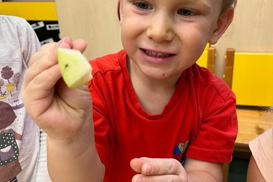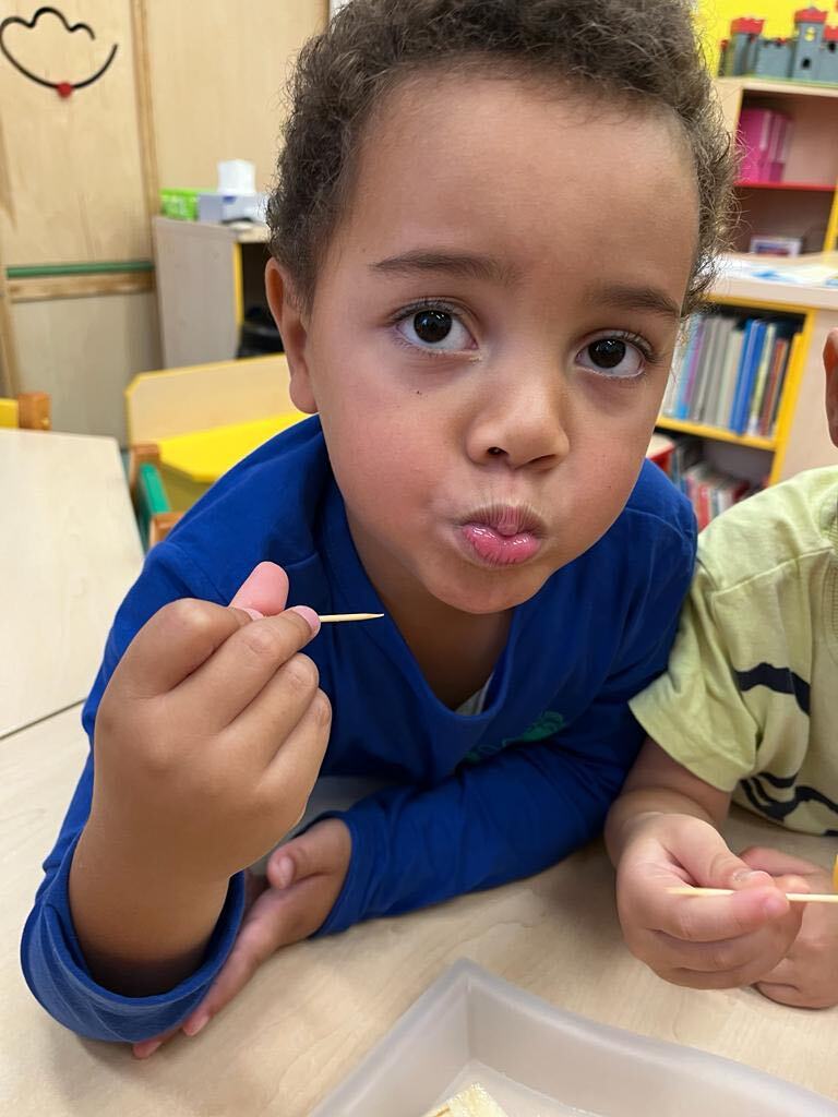 Děti s dnešní ochutnávkou poznávaly a popisovaly ovoce. Jak chutná a jaké je.