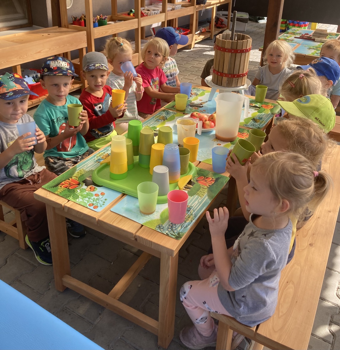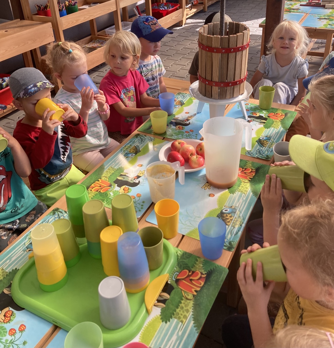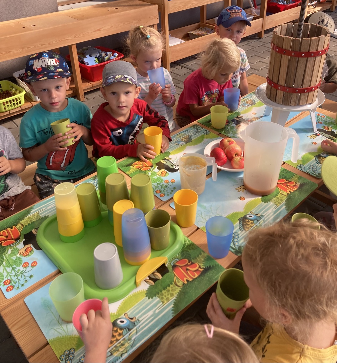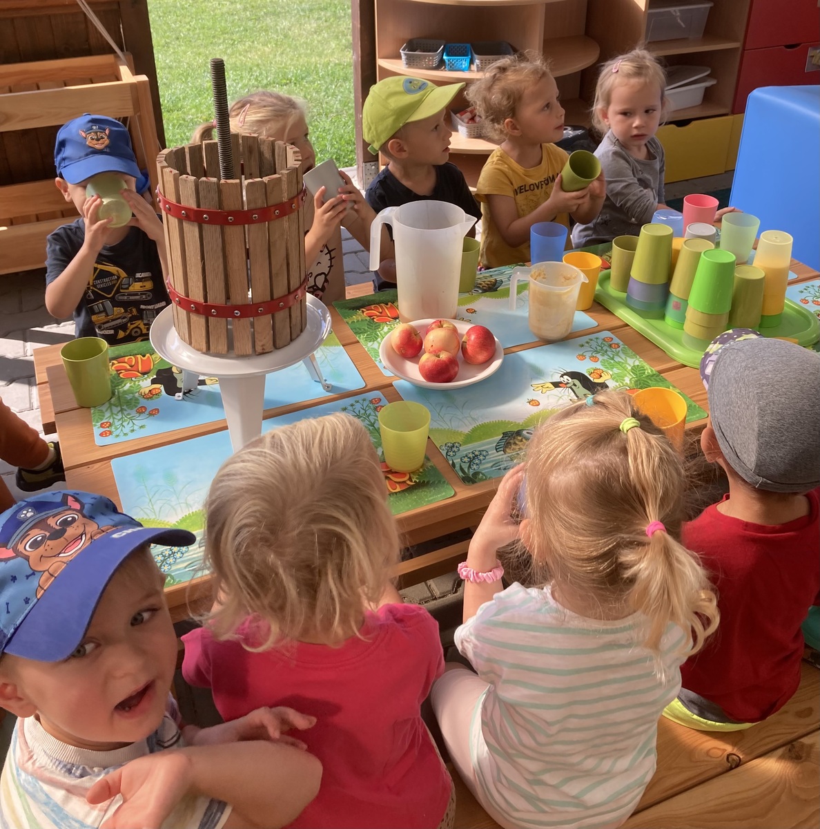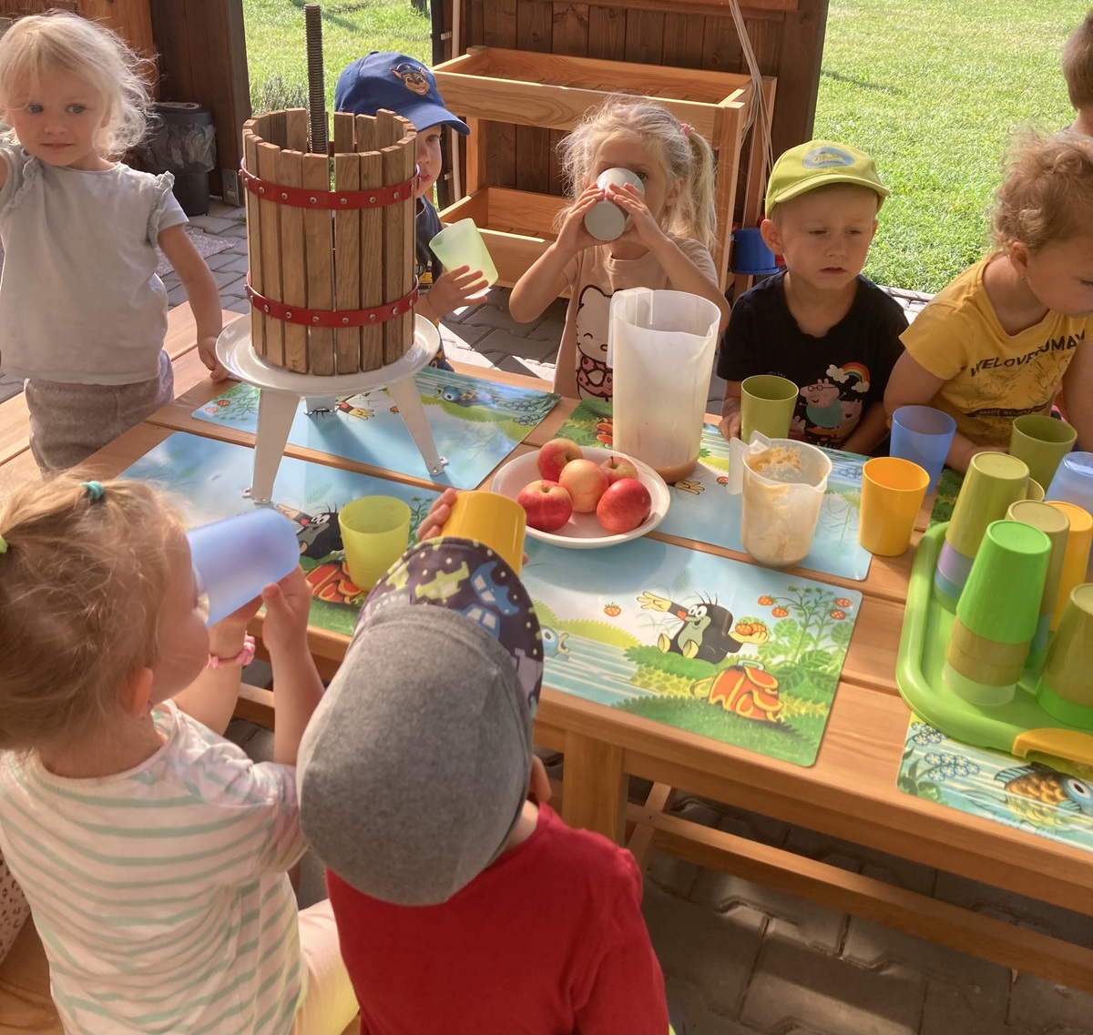 Děti ze třídy Sovičky a Kytičky vyráběly z jablek mošt. Nejmladší děti sledovaly starší děti při práci. Vyrobený mošt nabídli k ochutnání našim nejmladším dětem – „Beruškám“.