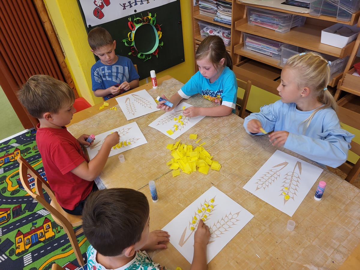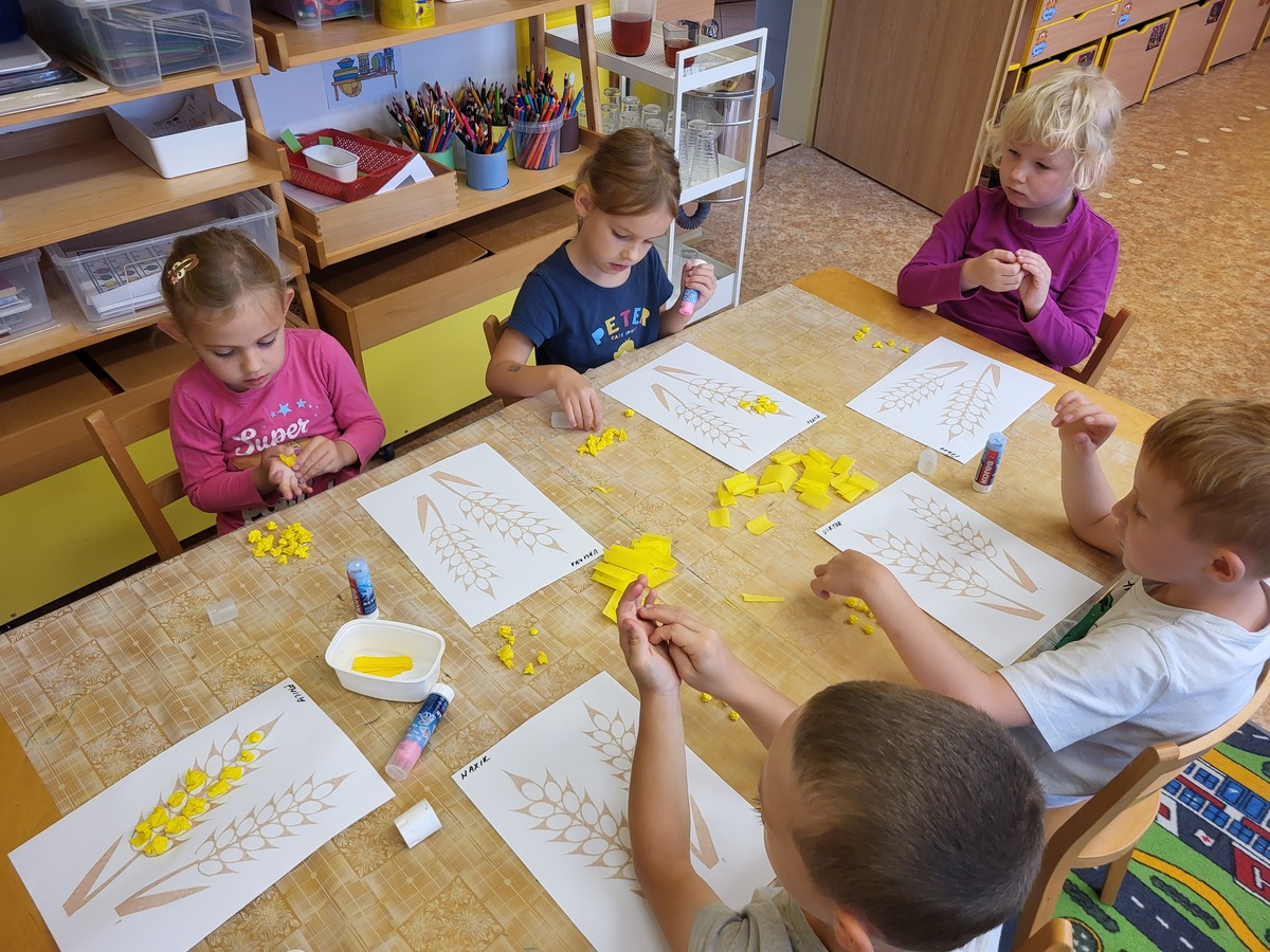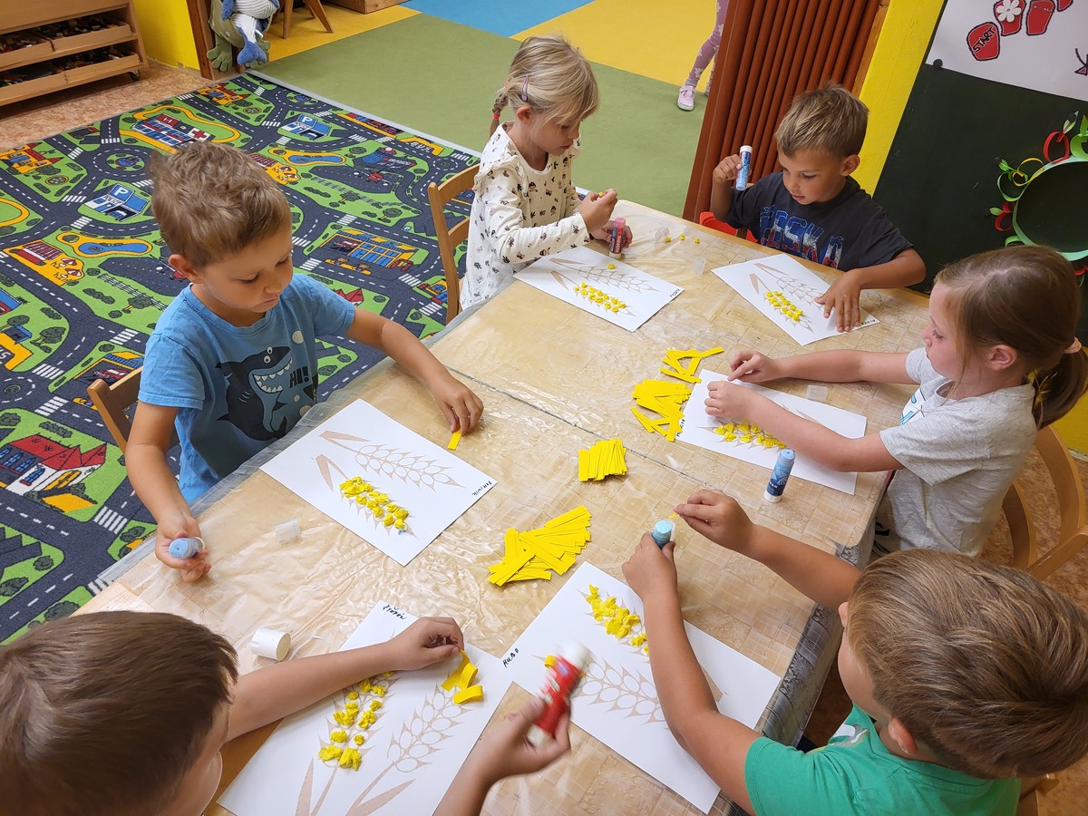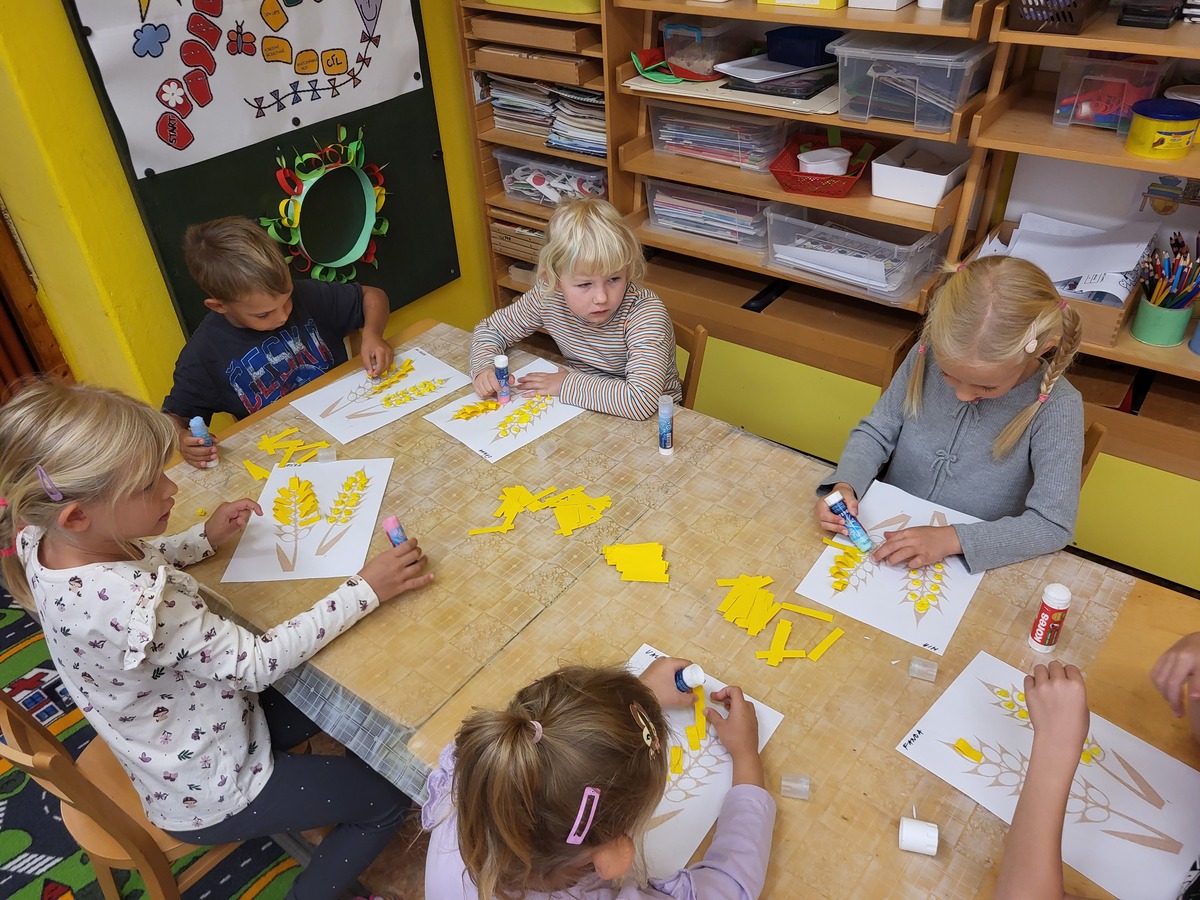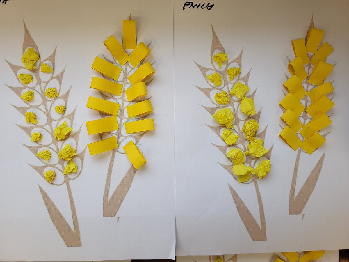 V loňském školním roce jsme začali projekt - Od zrníčka k chlebu. Z klasů jsme vybírali zrníčka, mleli mouku, a různými způsoby je poznávali. Nějaká zrníčka jsme zaseli, pozorovali, jak klíčí a rostou. Poté přesadili na školní zahradu. Pozorovali jsme, jak obilí roste a zraje. Na podzim jsme obilí sklidili a koloběh se uzavírá... opět jsme vybírali zrníčka.. a co s nimi? Obilné klasy jsme ztvárnili i z papíru.