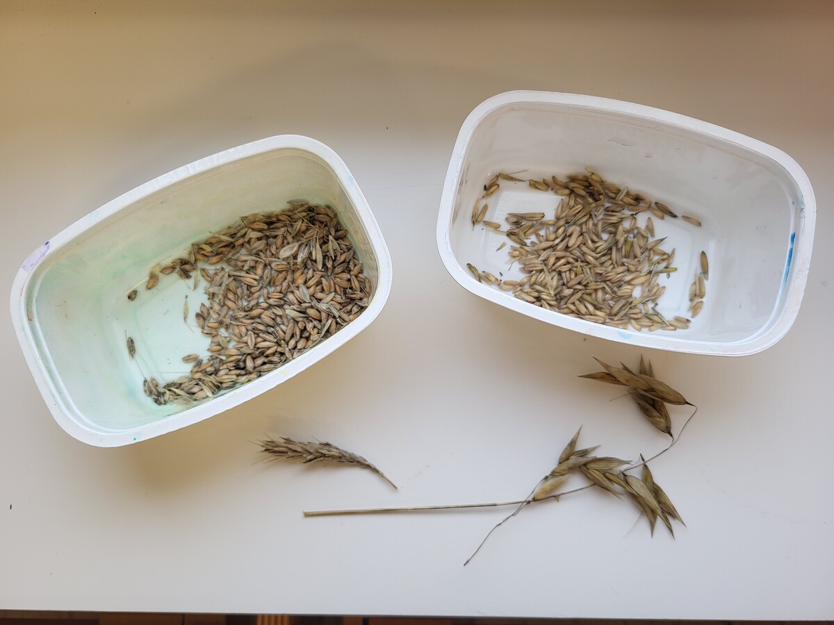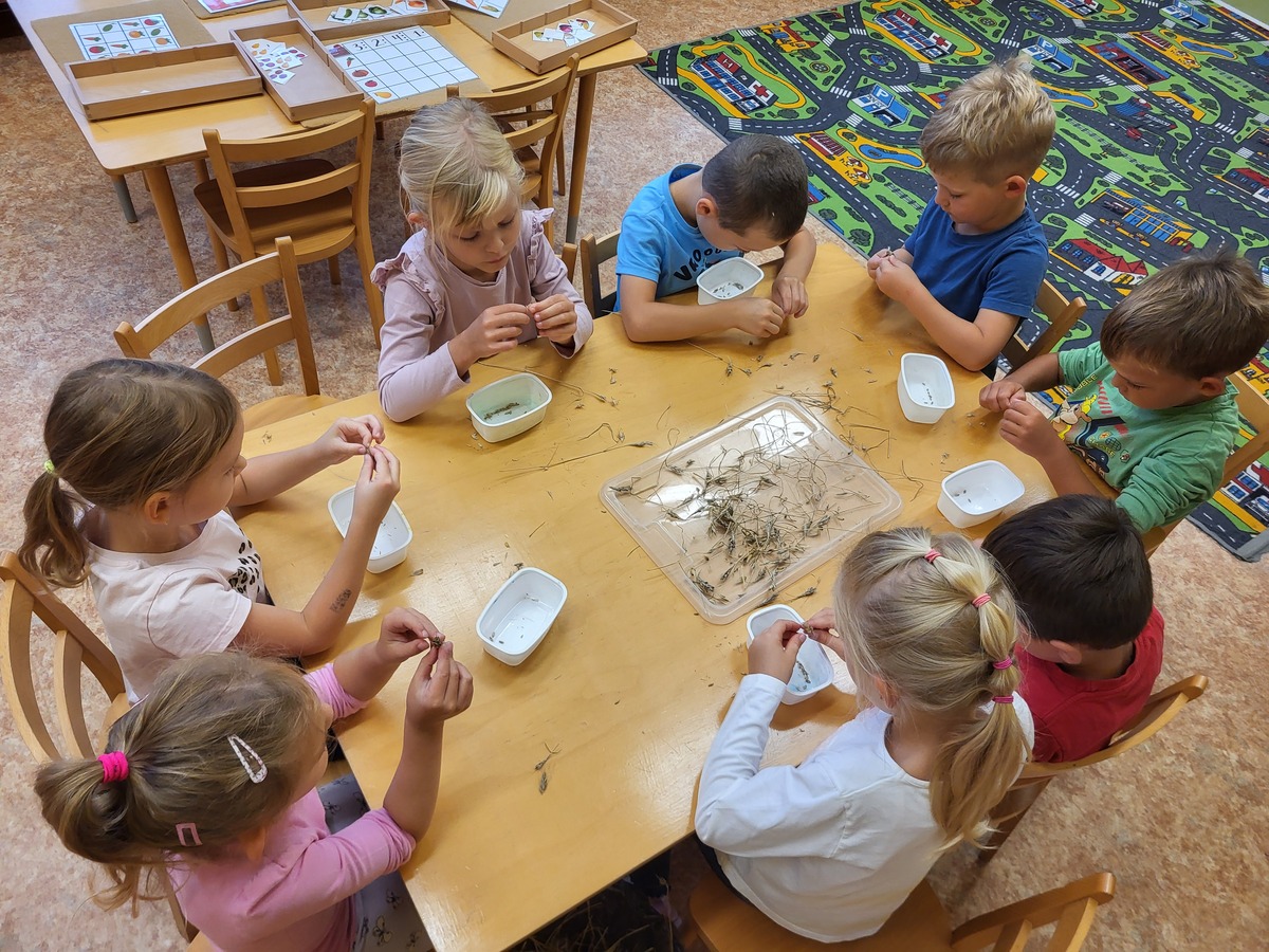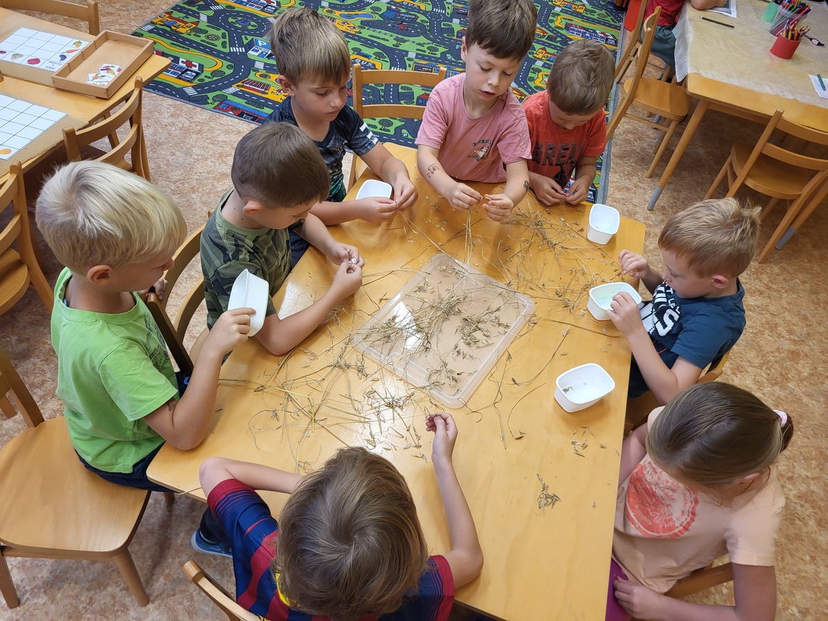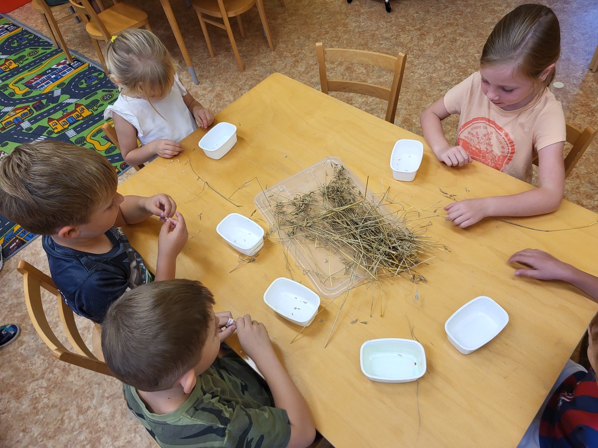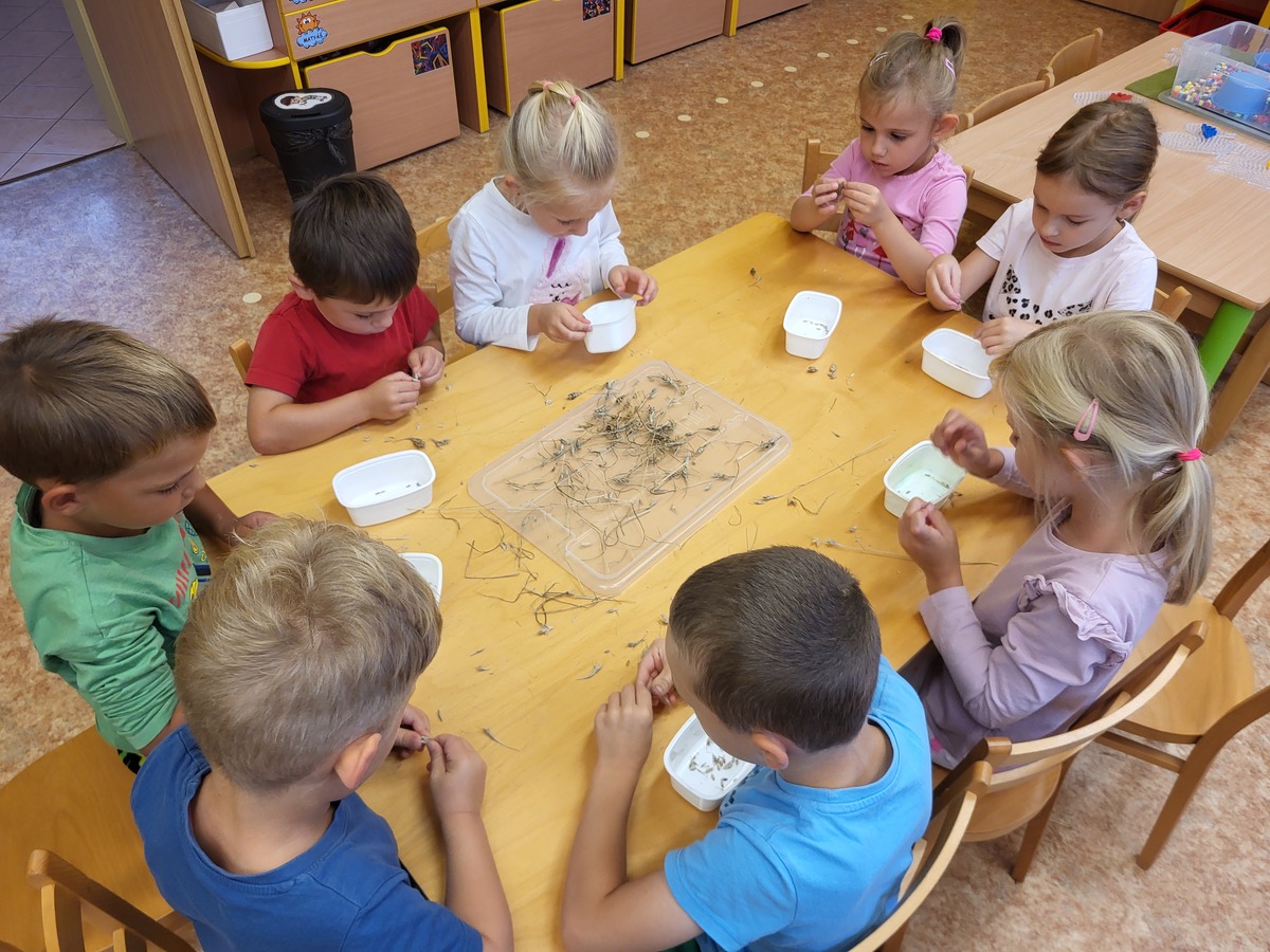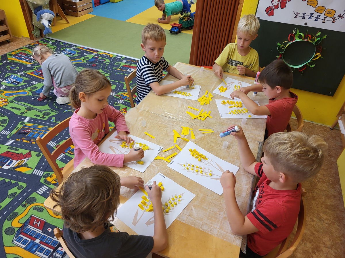 V loňském školním roce jsme začali projekt - Od zrníčka k chlebu. Z klasů jsme vybírali zrníčka, mleli mouku, a různými způsoby je poznávali. Nějaká zrníčka jsme zaseli, pozorovali, jak klíčí a rostou. Poté přesadili na školní zahradu. Pozorovali jsme, jak obilí roste a zraje. Na podzim jsme obilí sklidili a koloběh se uzavírá... opět jsme vybírali zrníčka.. a co s nimi? Obilné klasy jsme ztvárnili i z papíru.