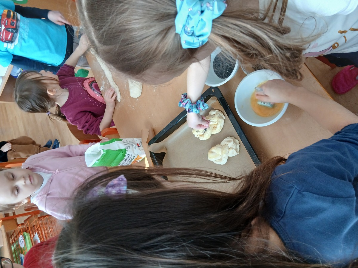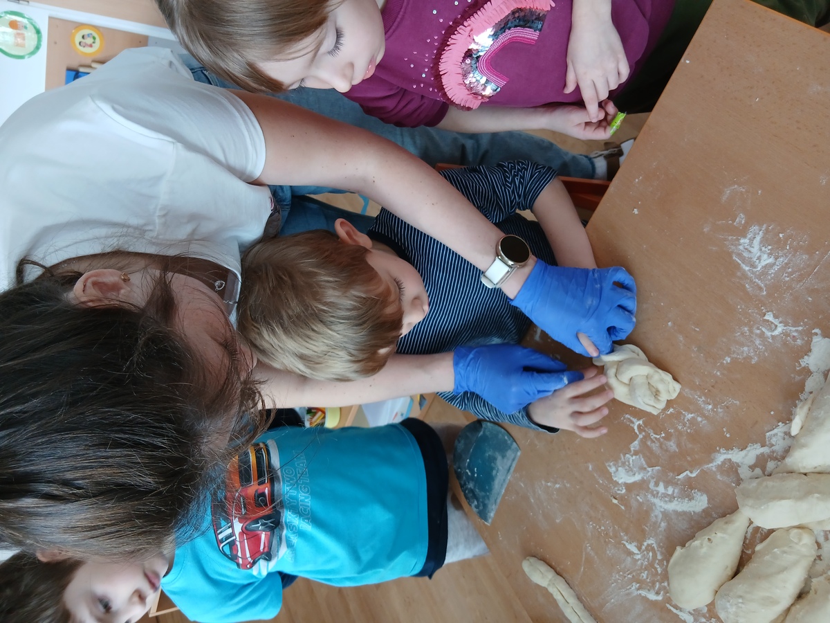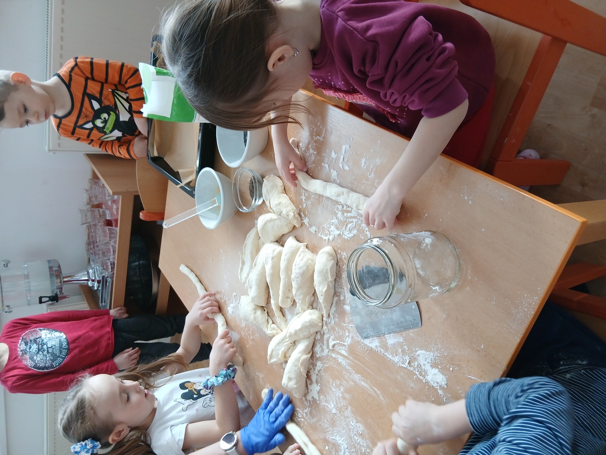 Když těsto vykynulo, pustili jsme se do práce. Děti z těsta válely dlouhé „hady“, ze kterých pak společně pletly housky. Každý si svou housku mohl ozdobit podle chuti – někdo zvolil mák, někdo kmín.