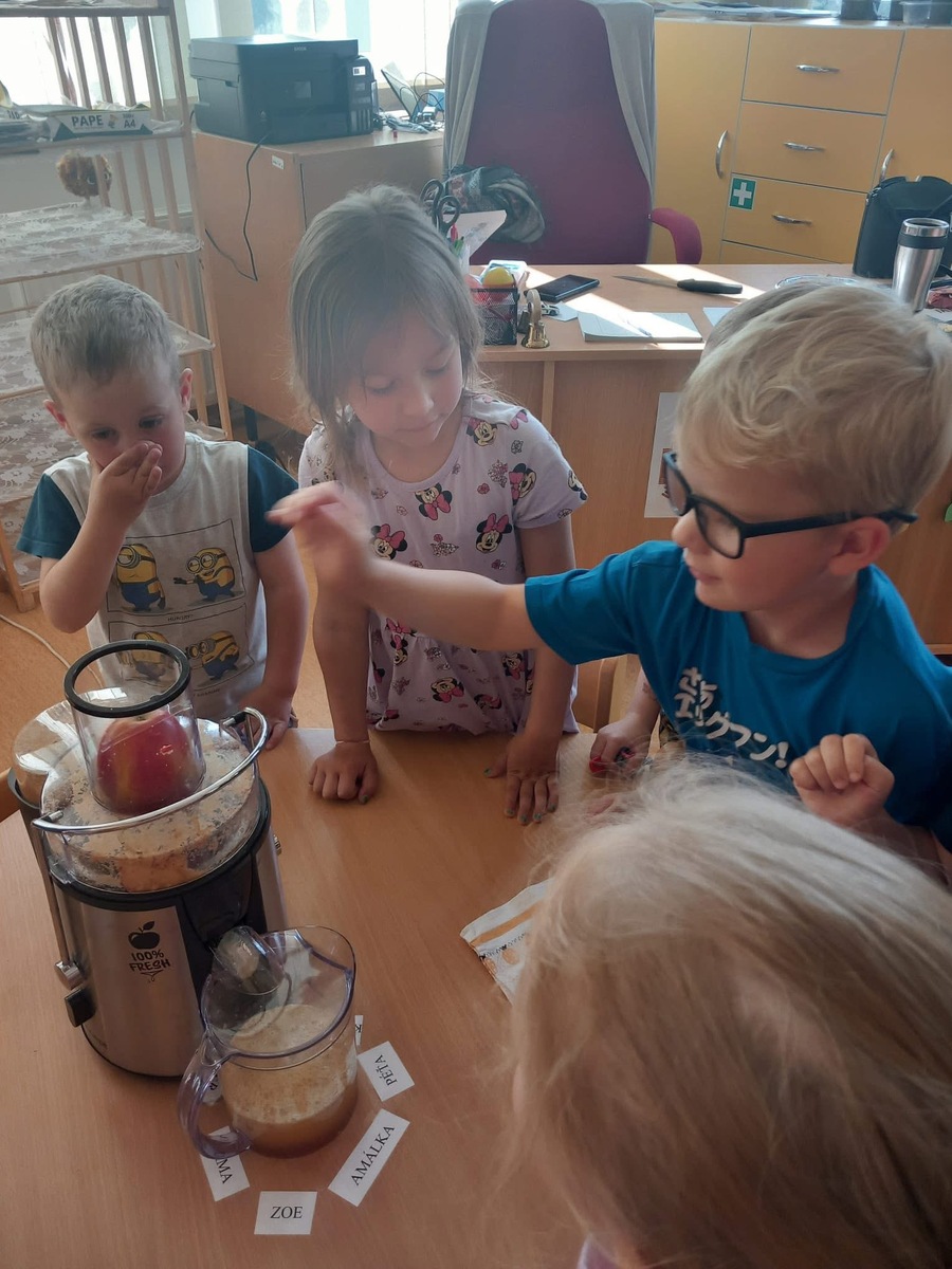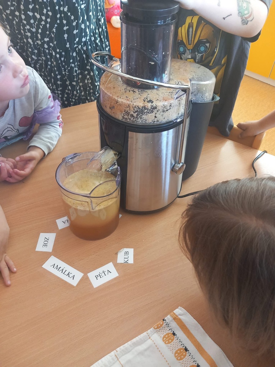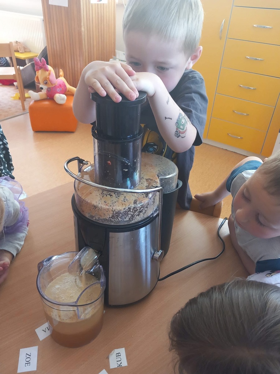 V rámci plnění programu skutečně zdravé školy jsme si do školky pořídili odšťavňovač. Děti si donesená jablíčka z naší školkové zahrady samy odšťavnily a vytvořily si tak přírodní šťávu. Je výborná.