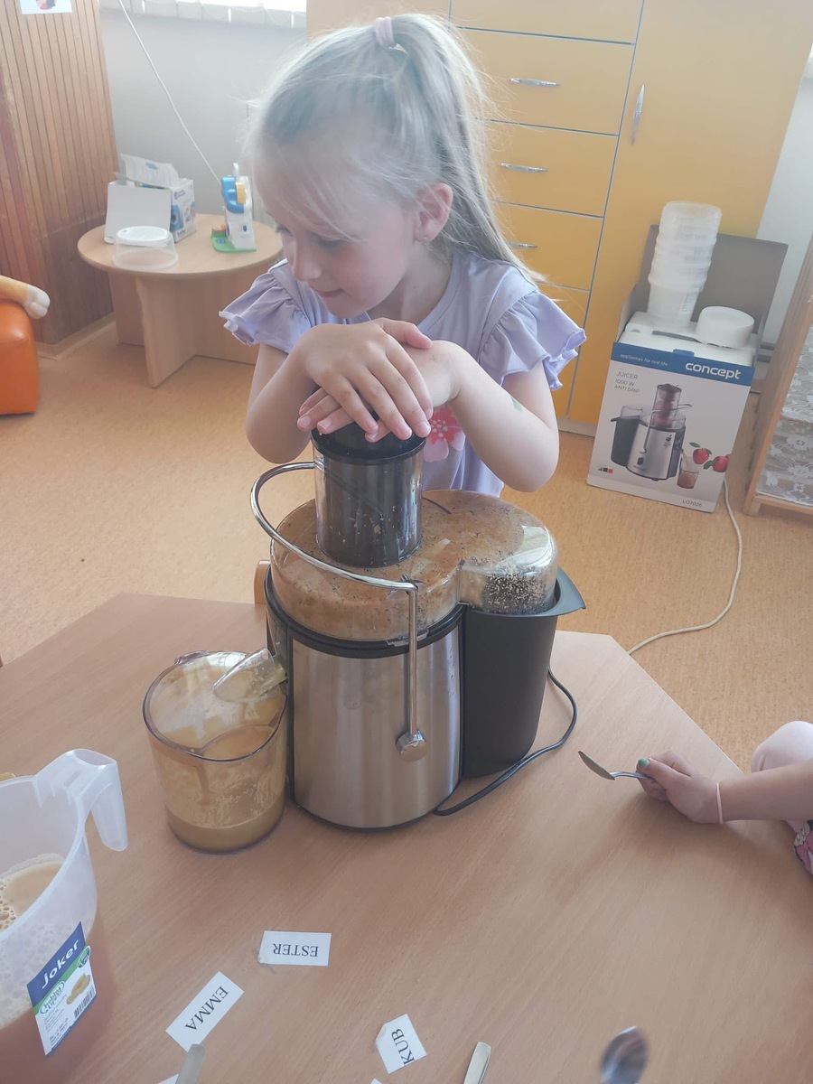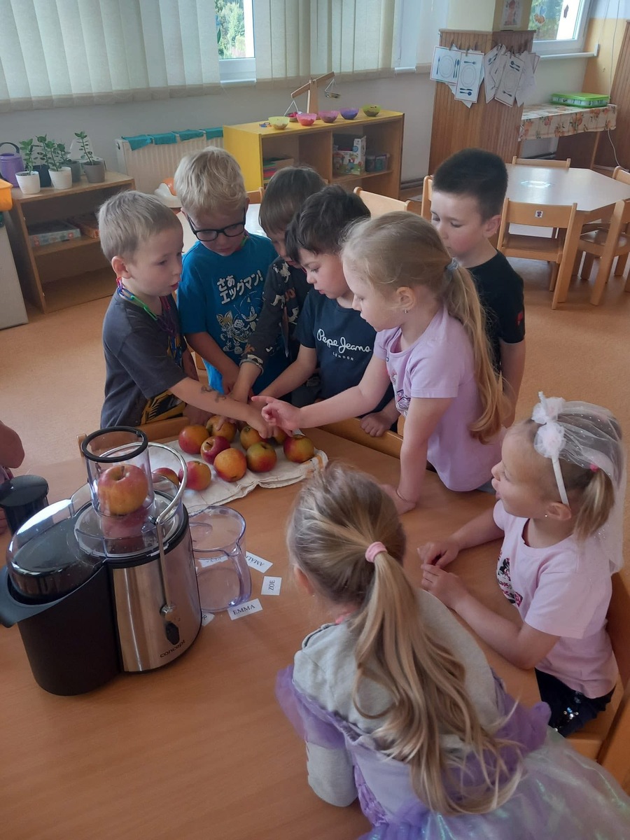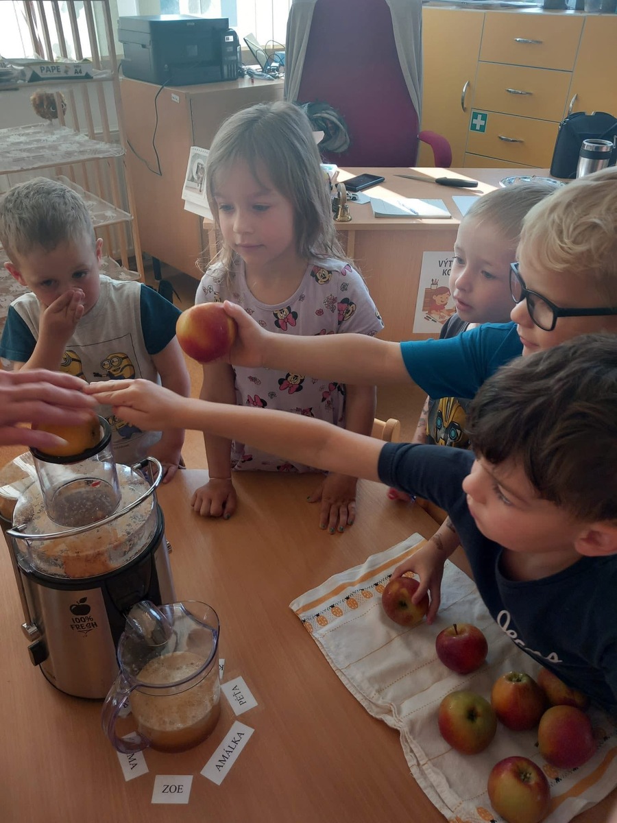 V rámci plnění programu skutečně zdravé školy jsme si do školky pořídili odšťavňovač. Děti si donesená jablíčka z naší školkové zahrady samy odšťavnily a vytvořily si tak přírodní šťávu. Je výborná.