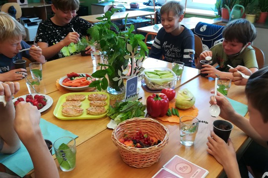 Zpříjemnili jsme si poslední dny školy. Děti přinesly ovoce a zeleninu ze zahrádky. Natrhali jsme také na svých zahrádkách bylinky a koření. Některé děti připravily zdravé mlsání. U společného hodování, vyprávění, poznávání vůní a chutí jsme využívali karty ze sady Oslava dobrého jídla. Na kartách jsme nacházeli zajímavá témata k diskusi a k zamyšlení. Akce se velmi vydařila a už se těšíme na další.