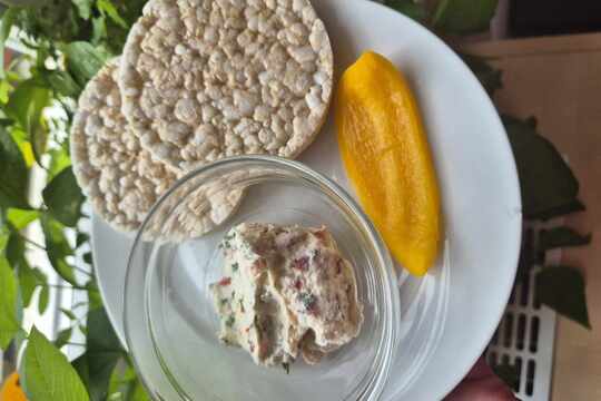 Celý maškarní den děti zakončily zdravou svačinkou. Čekaly na ně rýžové plátky s tvarohovou pomazánkou s rajčaty, žlutá paprika a na pití si děti mohly vybrat mléko nebo vodu.