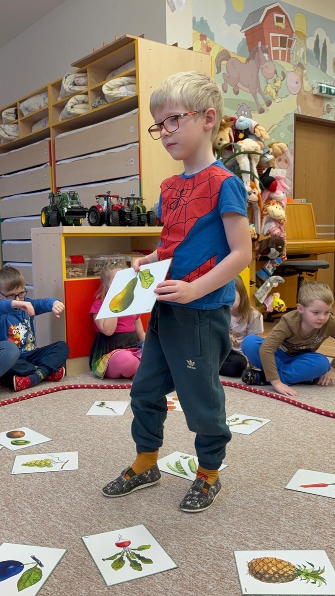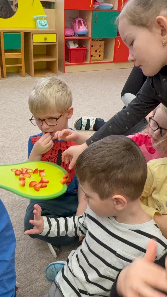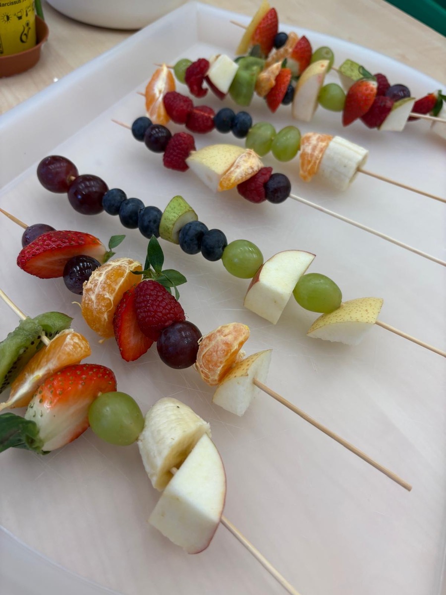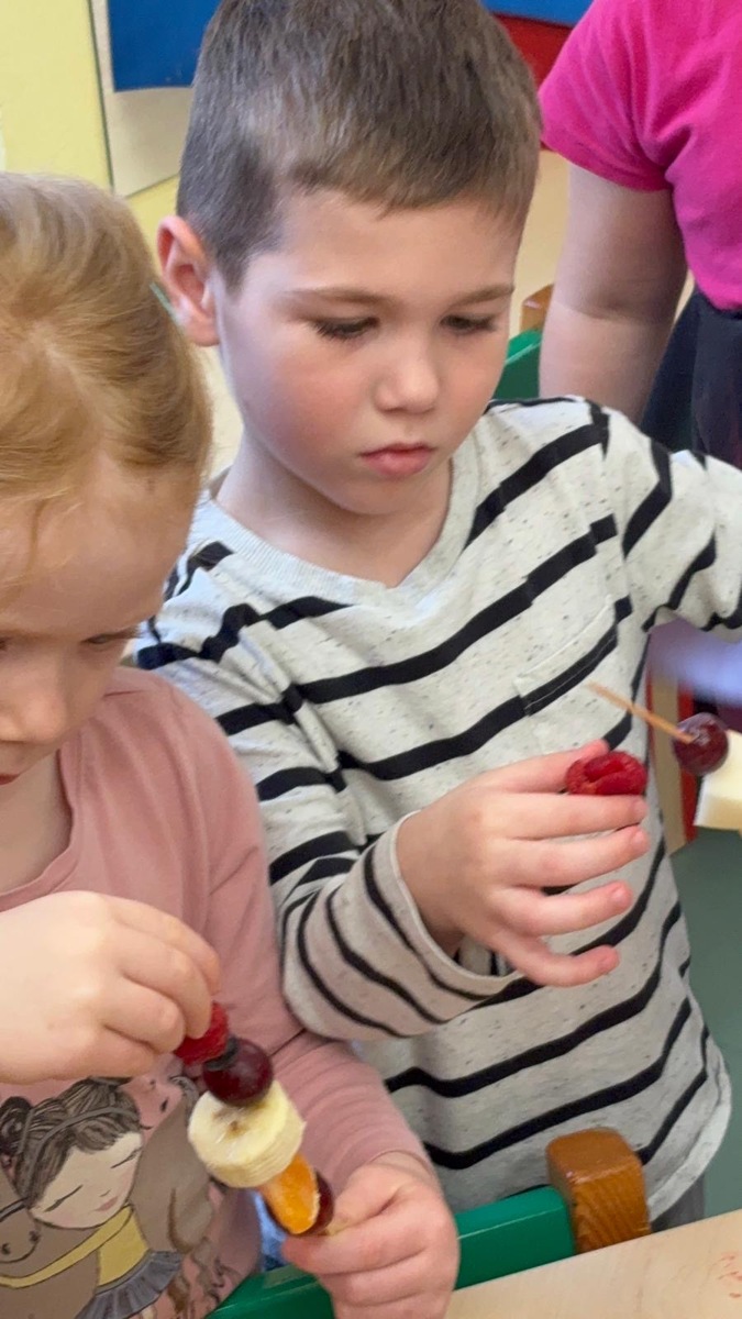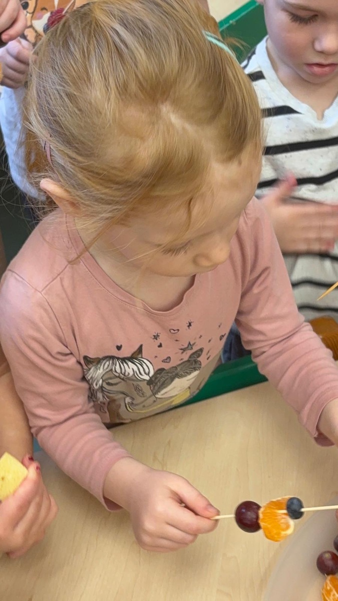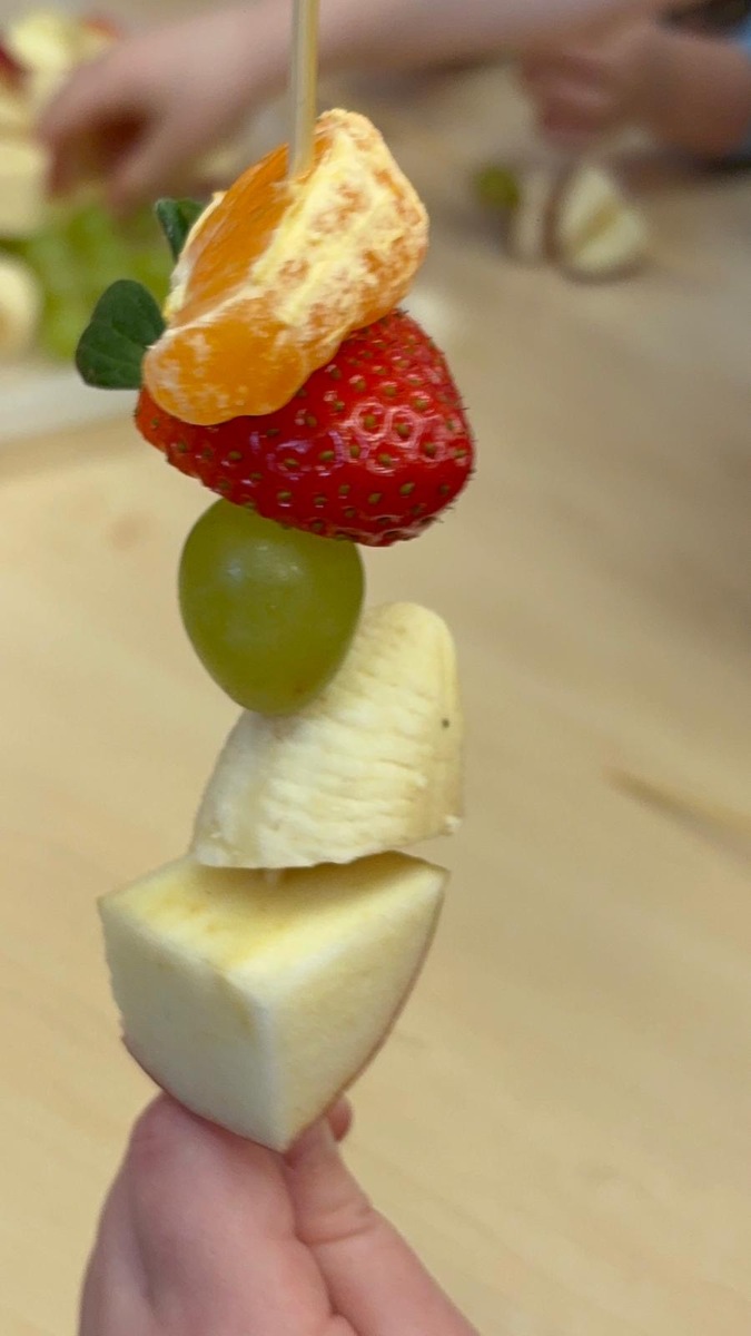 Dnešní aktivita s tématem VITAMÍNY byla nejen prožitková, zábavná, ale byla i velmi přínosná. Učíme se o jídle, třídíme ovoce a zeleninu a povídáme si o jejím nejen růstu, ale i chuti. Vnímáme ovoce všemi smysly nejen chutí, ale i vůni. Jak chutná? Jaké je? Jaké je oblíbené? Nakonec si děti samy vyrobily ovocný špíz podle vlastní chuti i přání.