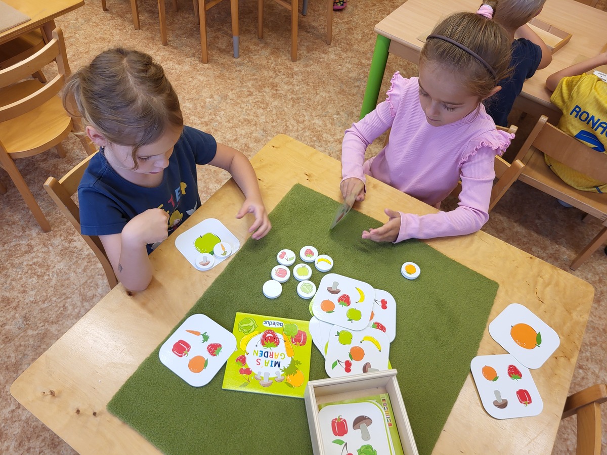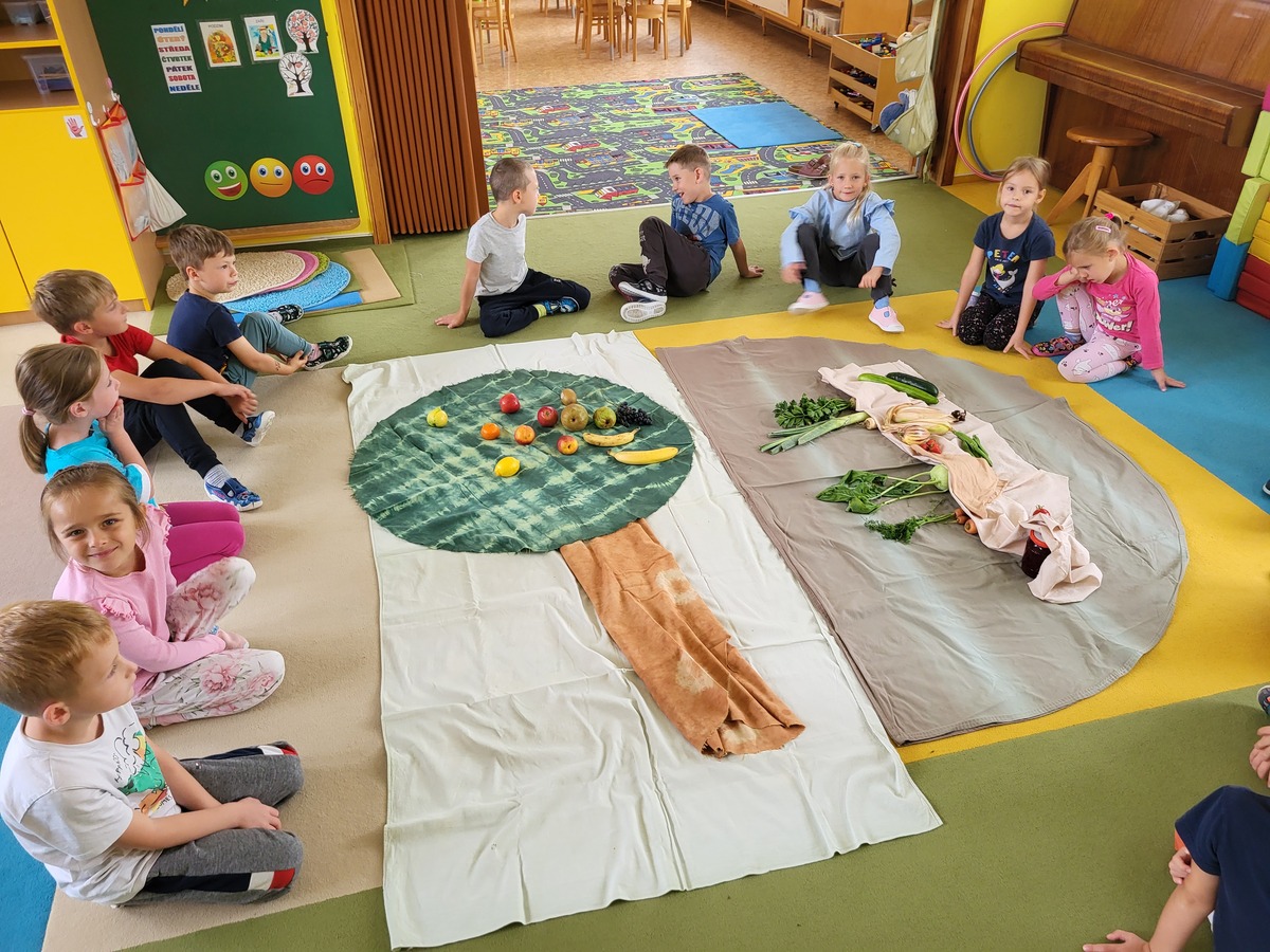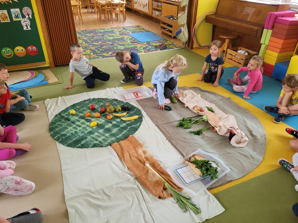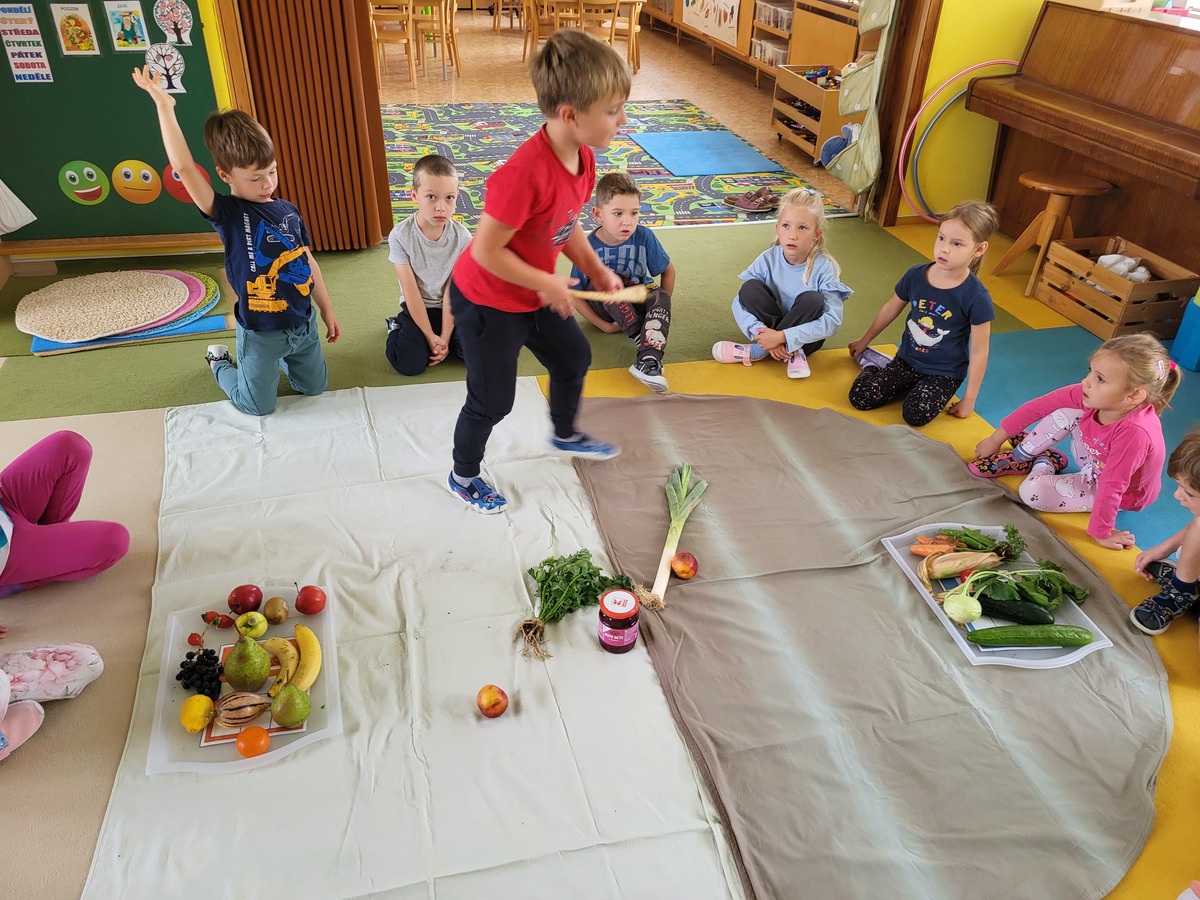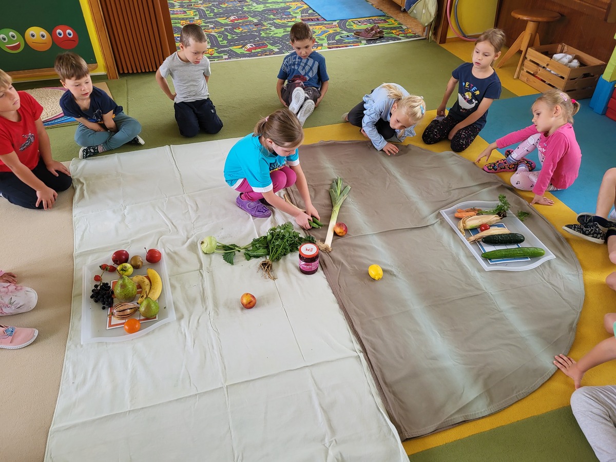 Celý týden jsme se věnovali ovoci a zelenině. Skládali jsme sudoku, třídili jsme na ovoce a zeleninu, také podle toho, co kde roste - na stromě nebo na záhonu. Poznávali jsme očima, hmatem, čichem a hlavně ochutnávali. Byli jme se podívat, kde se zelenina pěstuje.