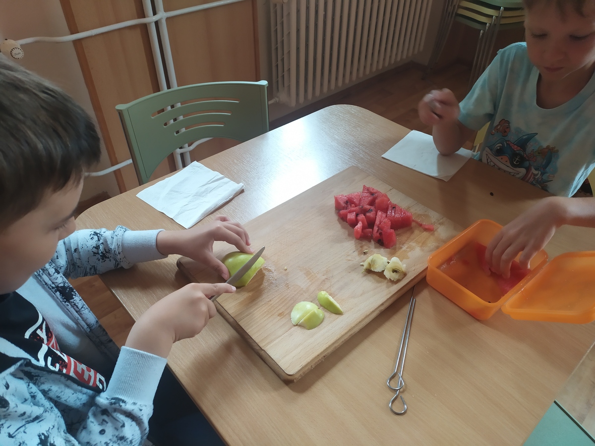 Hned v úvodu školního roku jsme si připravili osvěžující svačinu do školní družiny. Děti krájely ovoce, které jim chutná a daly je do podoby špízů nebo salátů. Využili jsme i bylinky ze zahrádky, protože jíme i očima. Po venkovním pobytu tato vychlazená svičinka přišla vhod.