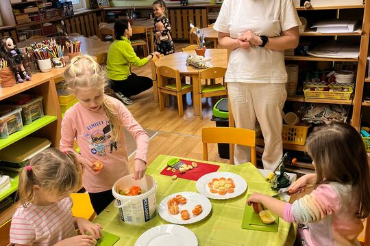 Oslava narozenin na třídě Sluníček s velkým ovocným pohoštěním. Sladkosti dětem nechybí. Naopak. Příprava pohoštění je mnohem zábavnější, než si jen vzít bonbon ze sáčku. A těch vitamínků…..❤️