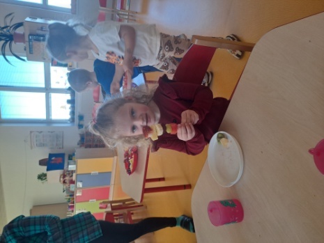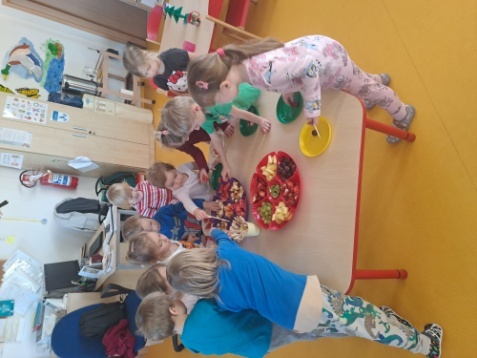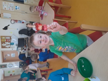 Na samotném konci února k tématu o zdravém životním stylu jsme si ve Veverkách udělali ovocné mlsánky. Ovšem samotné výrobě předcházelo povídání o tom, proč je důležité jíst, především v zimě, ovoce a zeleninu, odkud tato pochází a jak dlouhá cesta musí být, abychom si pochutnali na pomeranči, kiwi či jahůdkách nebo ananasu. Každé ovoce jsme si nejdříve prohlédli, osahali a nakonec i ochutnali. Veverky si vytvořily za pomocí napichovátka mlsání, kde si mohla každá jedna z nich napíchnout to, na co zrovna měla chuť, anebo ochutnat něco nového. Celý proces nás všechny velmi bavil a už se těšíme, až budeme mít k dispozici sezónní ovoce a zeleninu, se kterou vykouzlíme další zdravou mlsku.