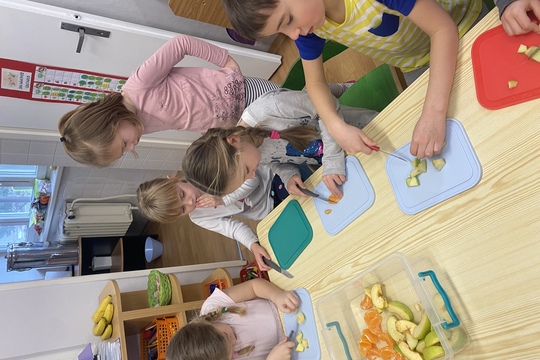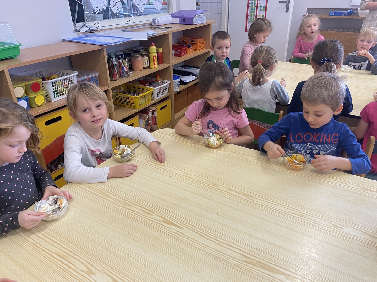 Naše dvojčátka Lucinka a Barunka slavily narozeniny. Donesly na oslavu spoustu ovoce, a tak jsme si společně připravili ovocný salát s trochou bílého jogurtu. Moc se nám povedl a všichni jsme si pochutnali.